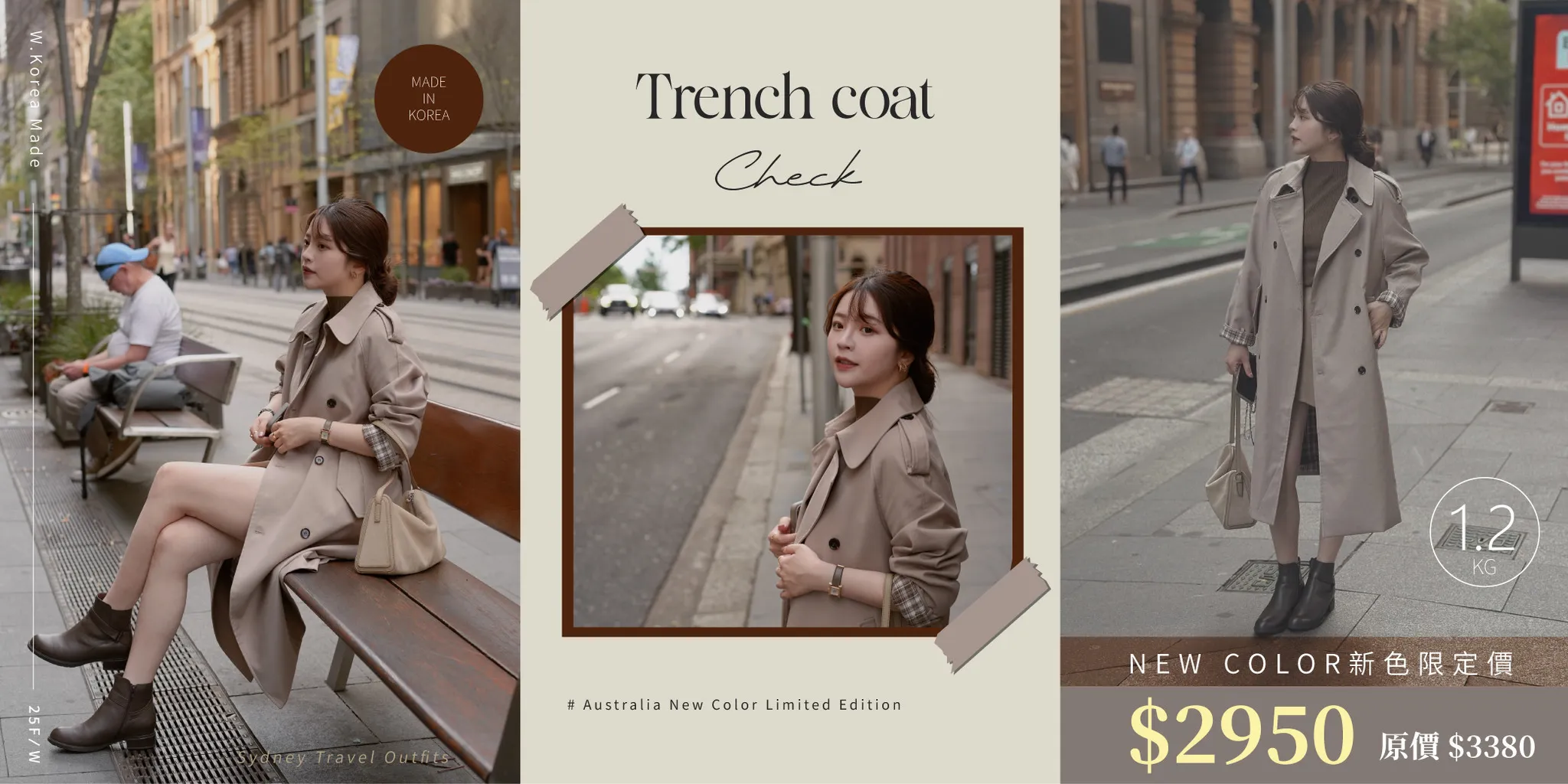 W.Korea #澳洲新色限定版 冬日格調長挺版拼接格紋排釦風衣外套(1.2kg)