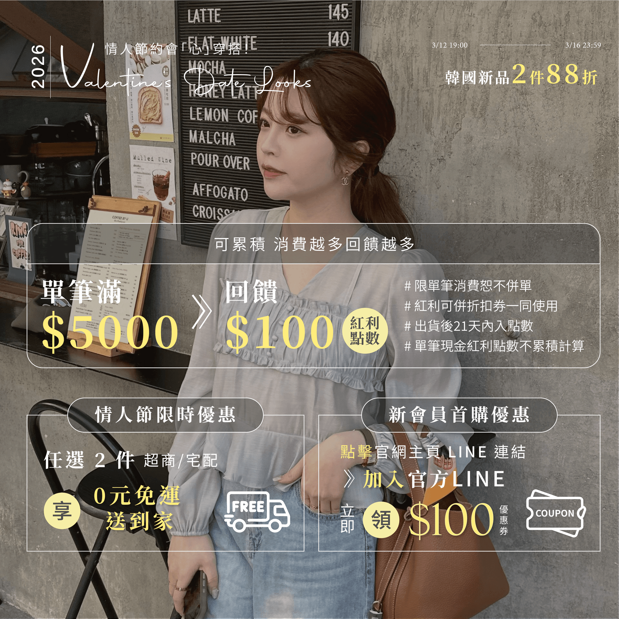 3/12-3/16 情人節約會「心」穿搭!韓國新品2件88折