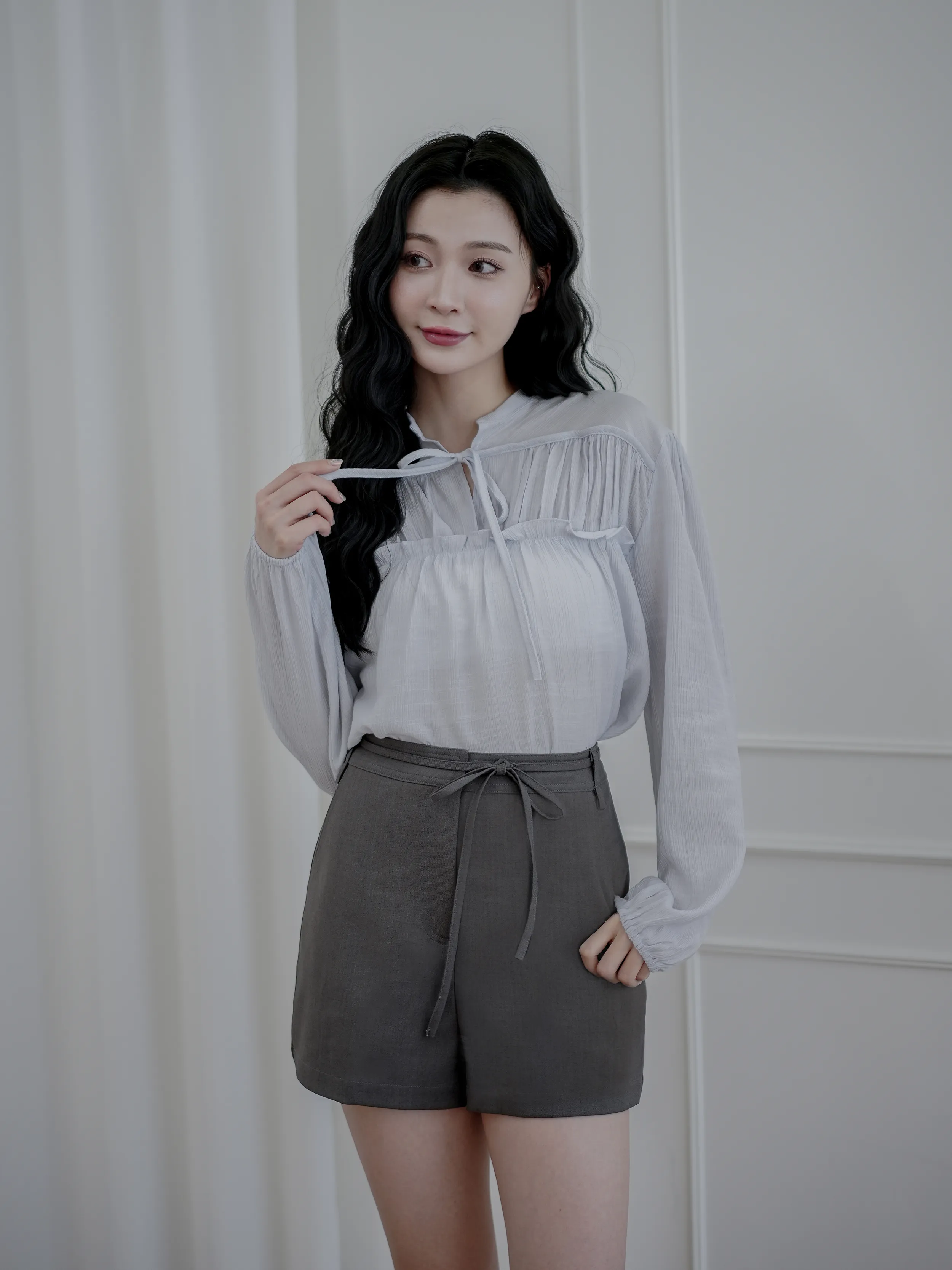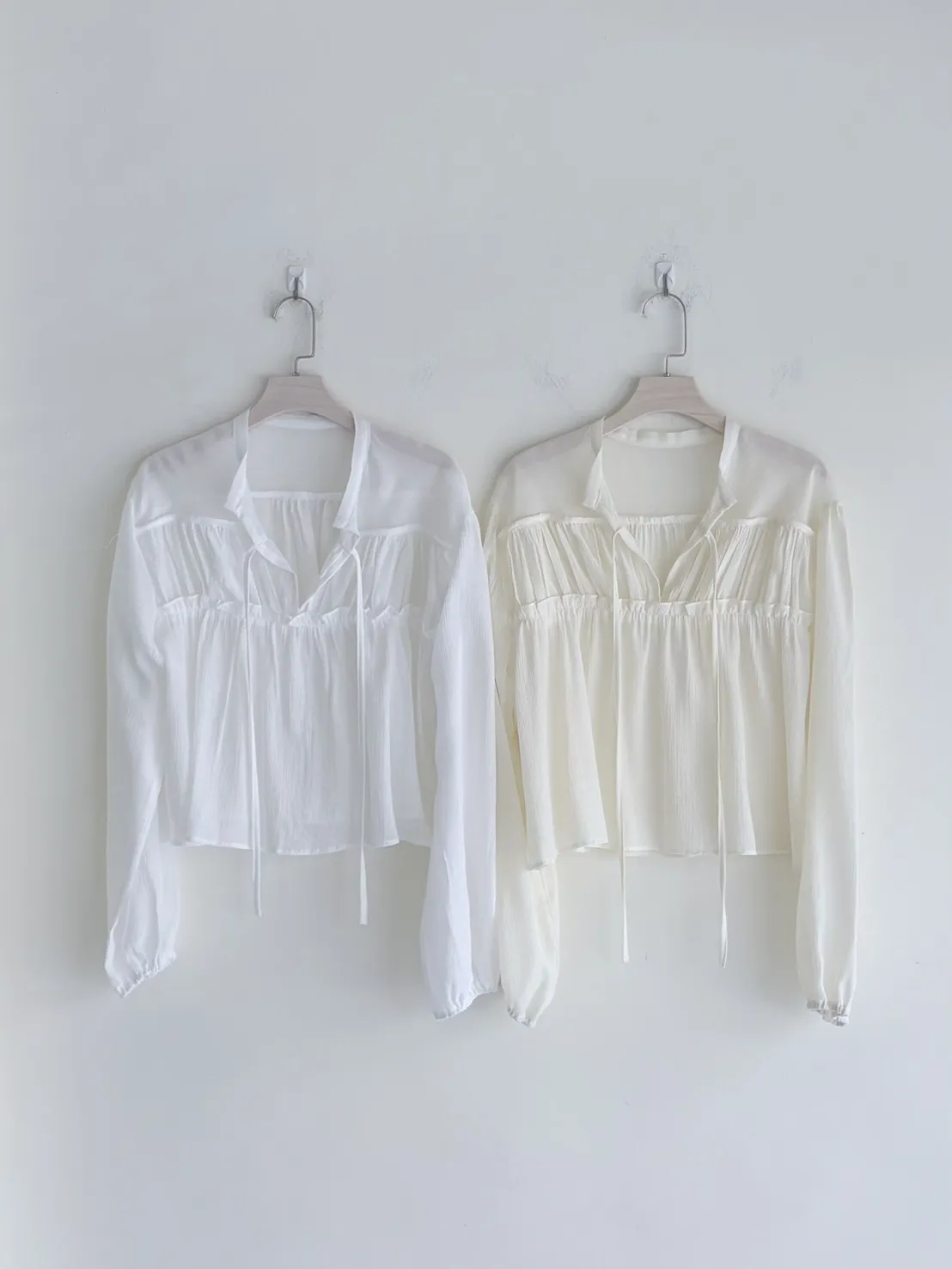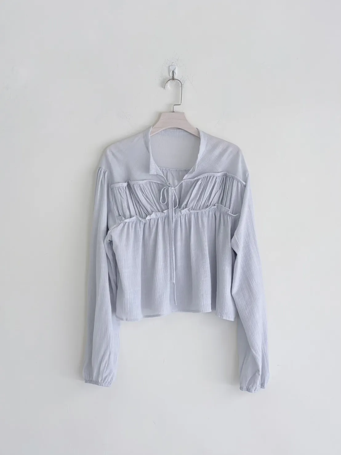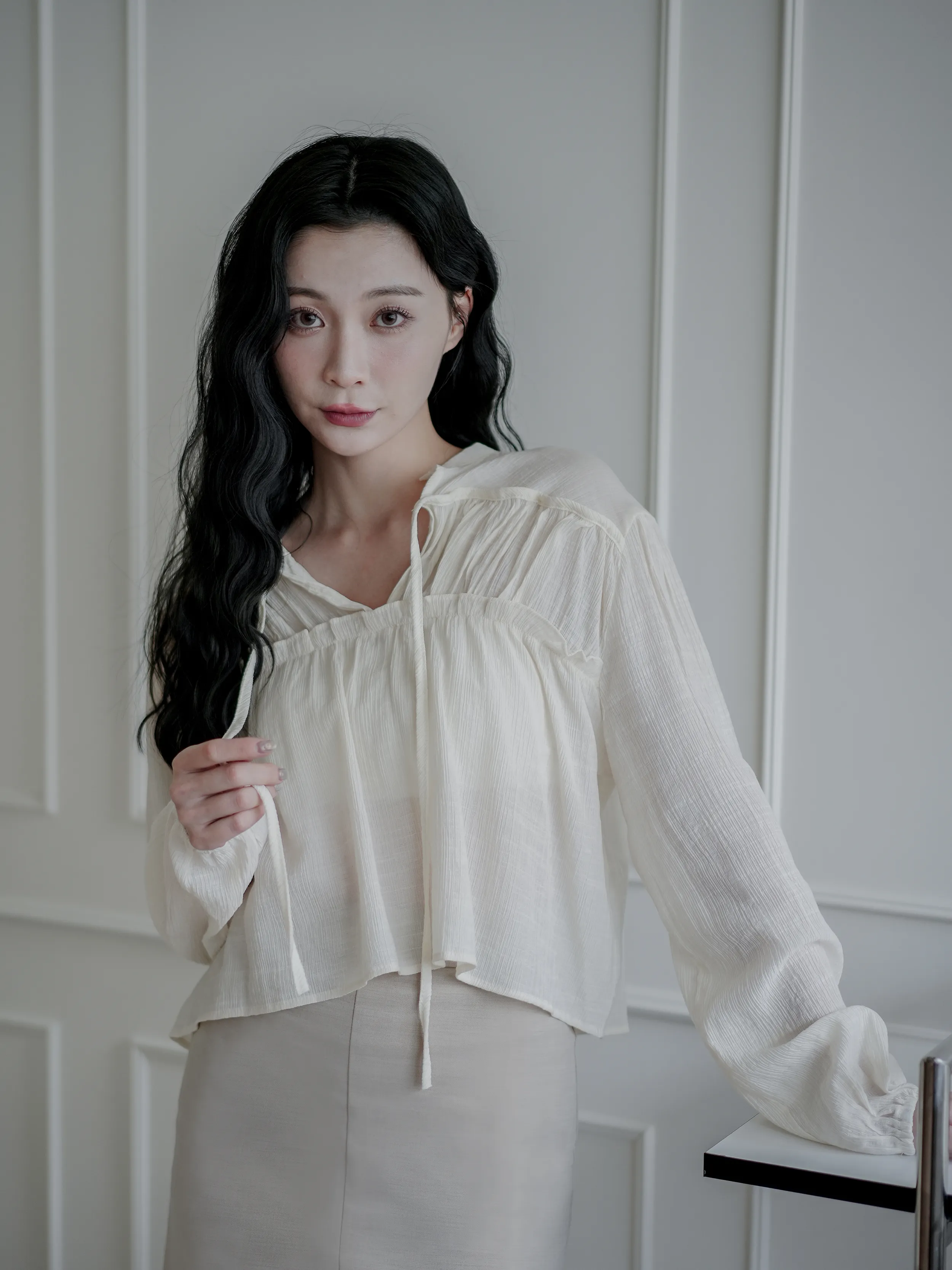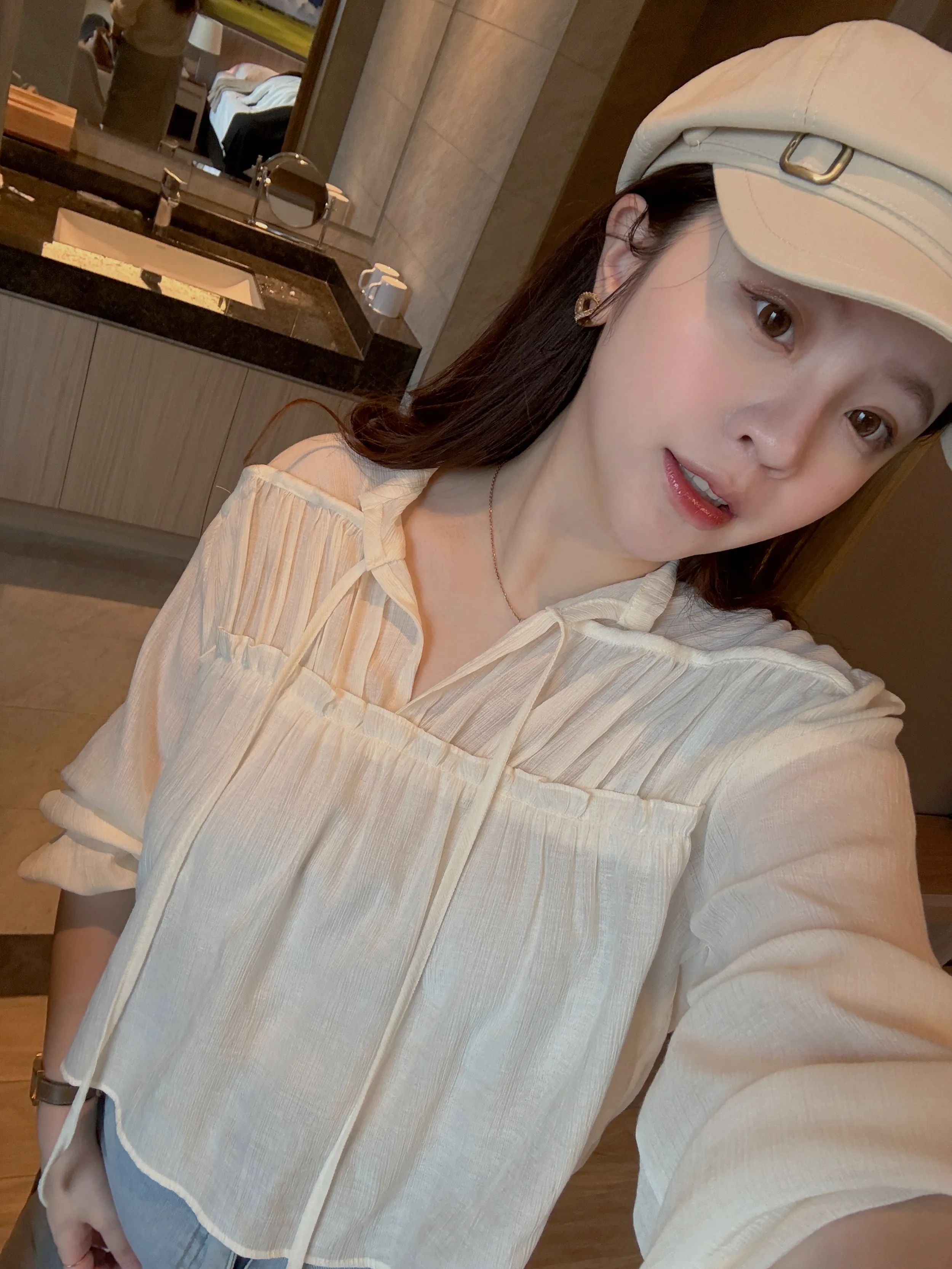 C01 #早秋仙女比例 抓皺花邊透膚綁帶上衣