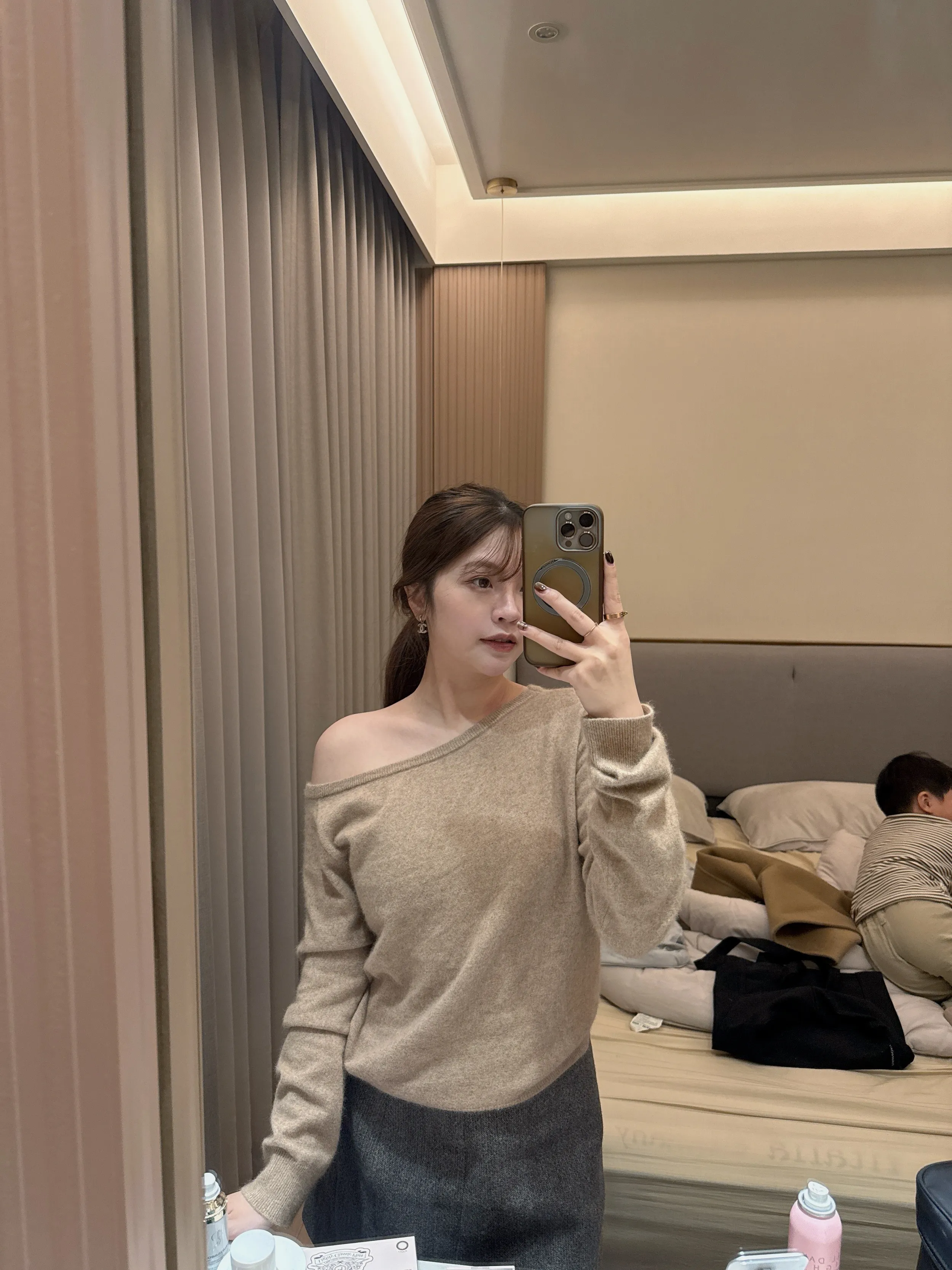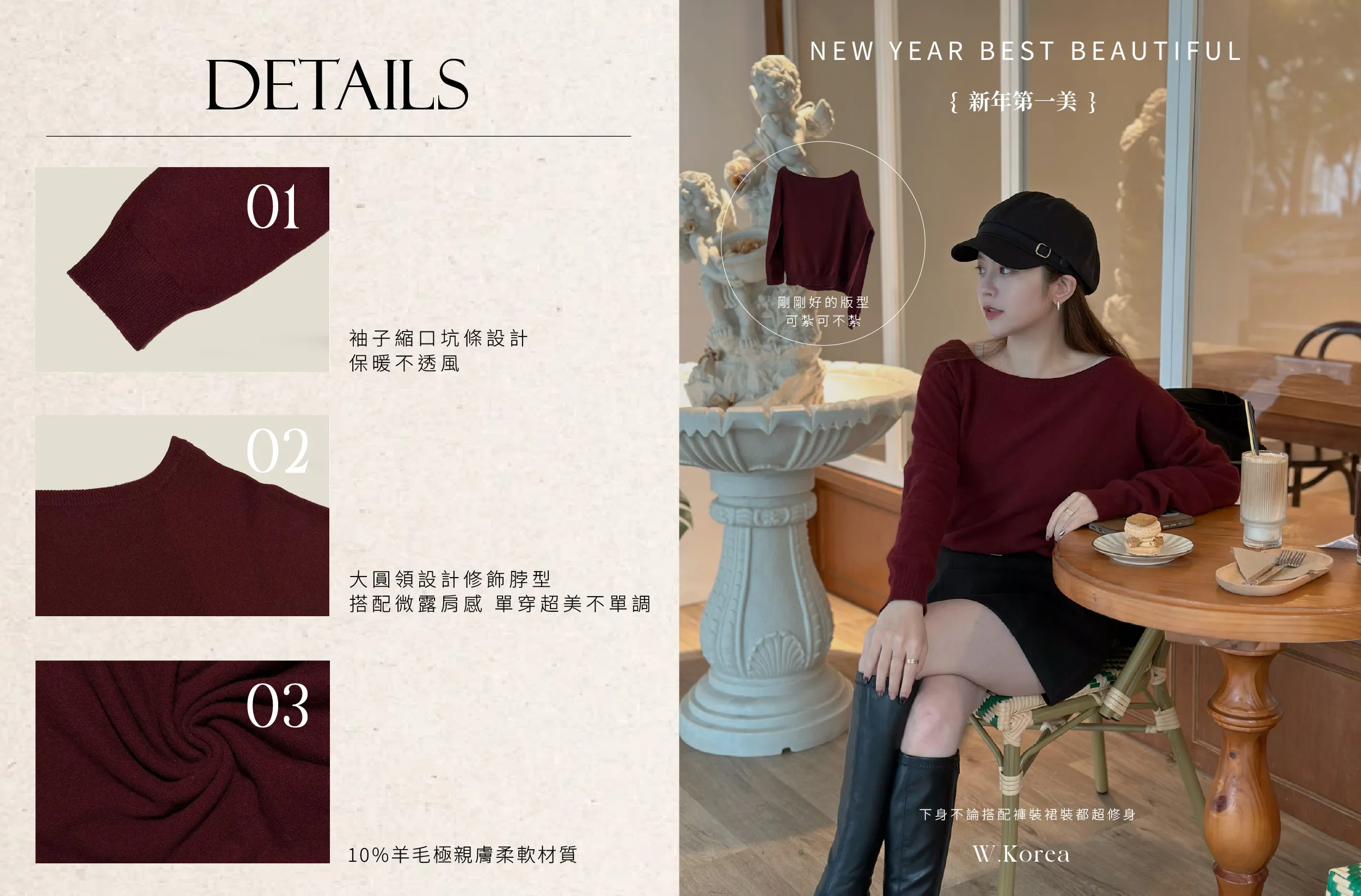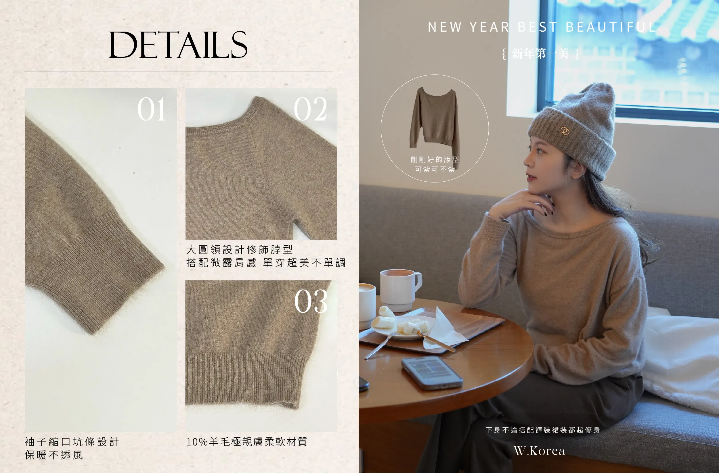 材質:10%羊毛10%羊毛極親膚柔軟材質大圓領設計修飾脖型搭配微露肩感 單穿就超美又不單調剛剛好的版型可紮可不紮下身不論搭配褲裝裙裝都超修身 身形指南 身高 體重 鞋碼 麻糬媽 160 50 24.5 逸歡 168 48 25 彭彭 165 47 23.5