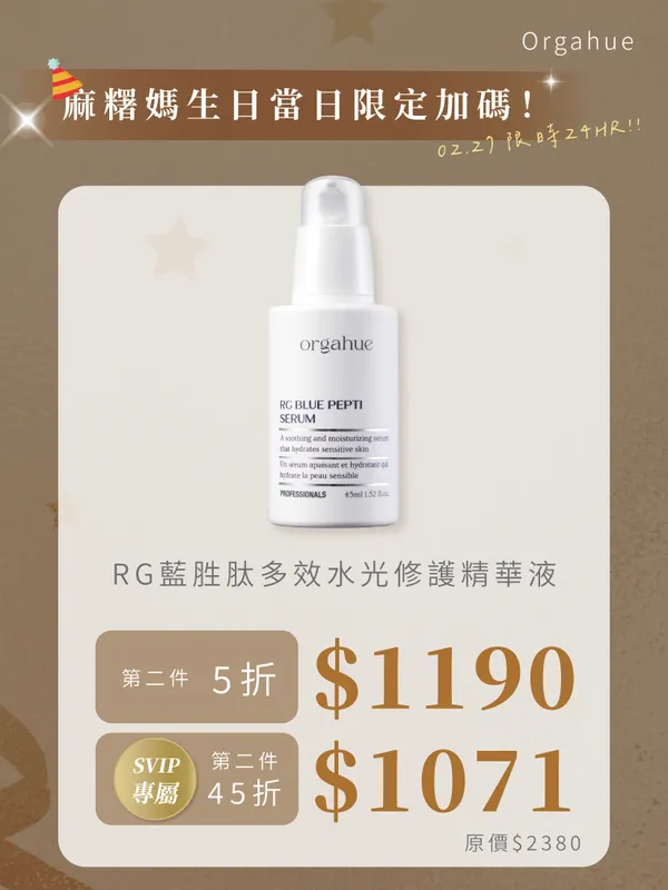 敏感肌必備 ! #六肽合一 RG藍胜肽多效修護精華液內含Orgahue專利藍胜肽α-blue peptideTM激活防止肌膚老化並以藍蓮花水取代純淨水,有效的激活修復通過國外多項認證獲得優秀等級72小時臨床實驗0%皮膚刺激/0%皮膚刺激成分/過敏發生率0%這瓶是經 KFDA 認證的亮白撫紋多功能精華液含有菸鹼醯胺50,000 ppm!可有效亮白肌膚 達到光澤肌效果再藉由4D玻尿酸提供肌膚水分並修護肌膚。