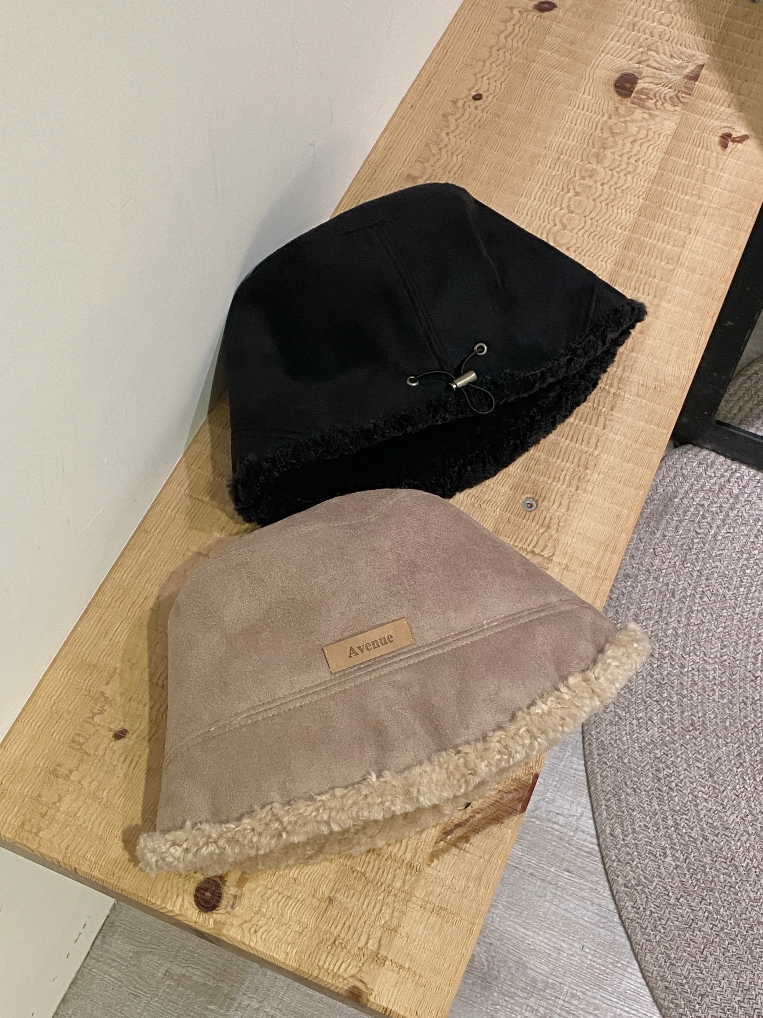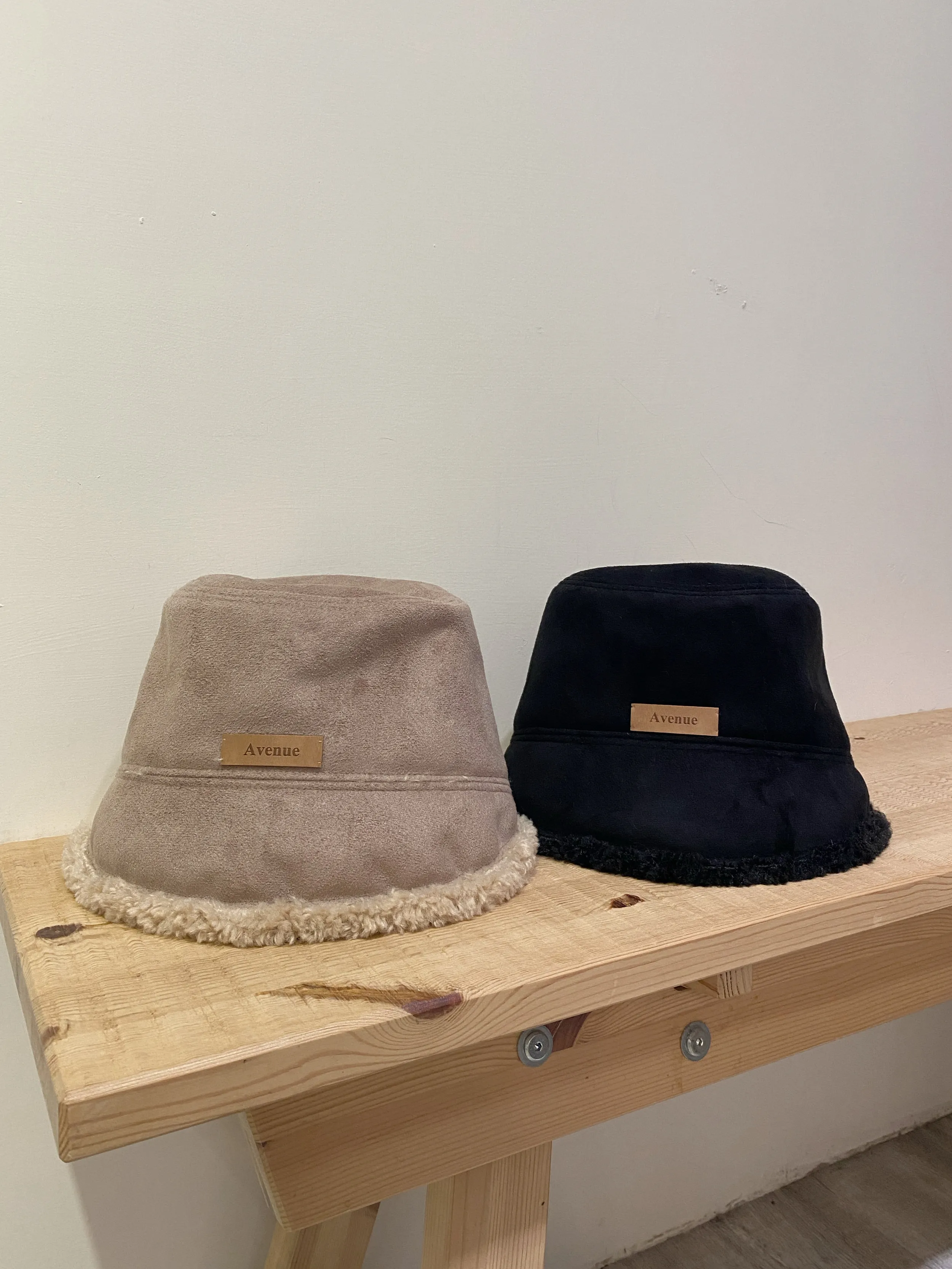 A11612 麂皮羊羔毛拼接皮標抽繩漁夫帽