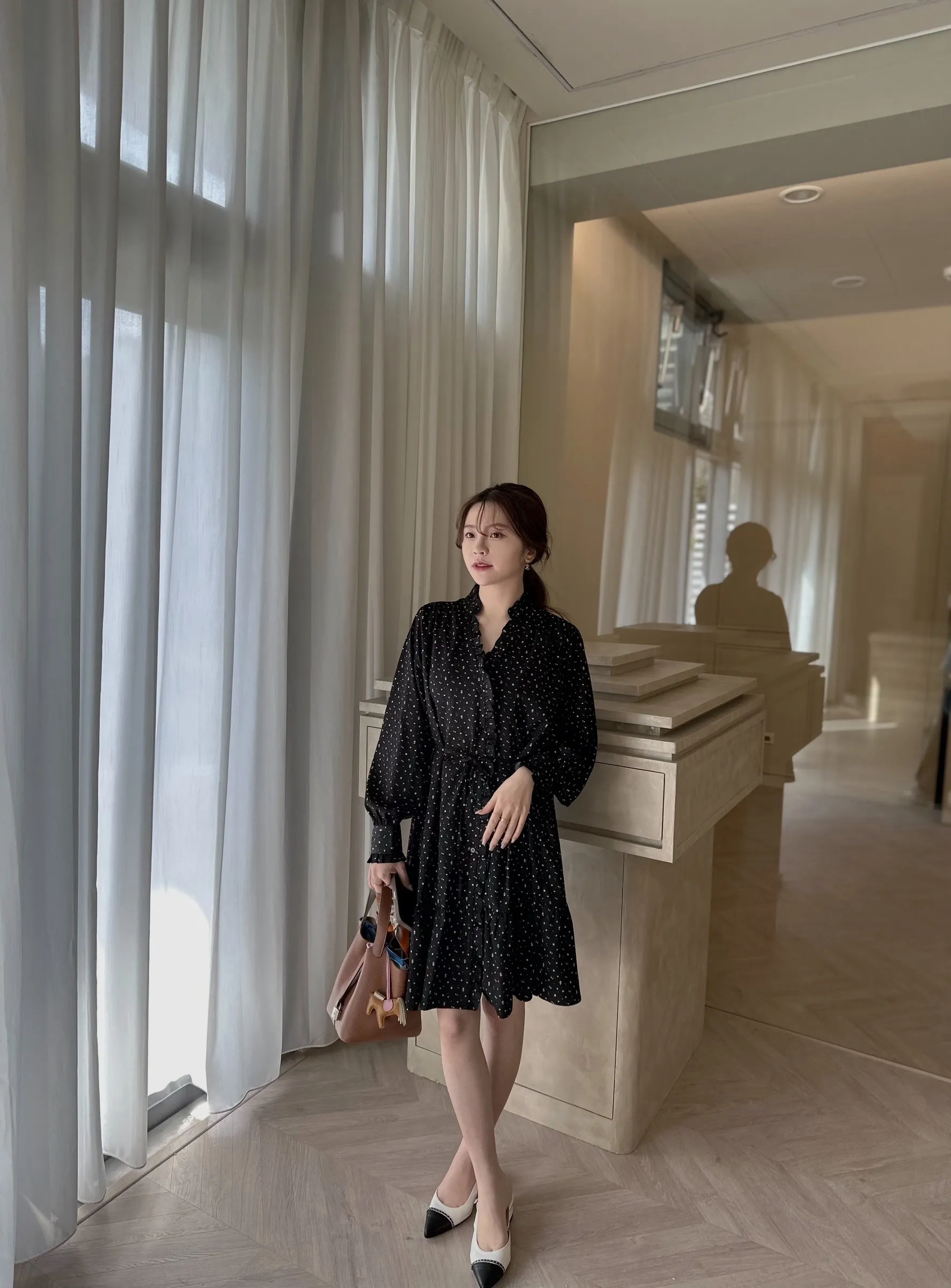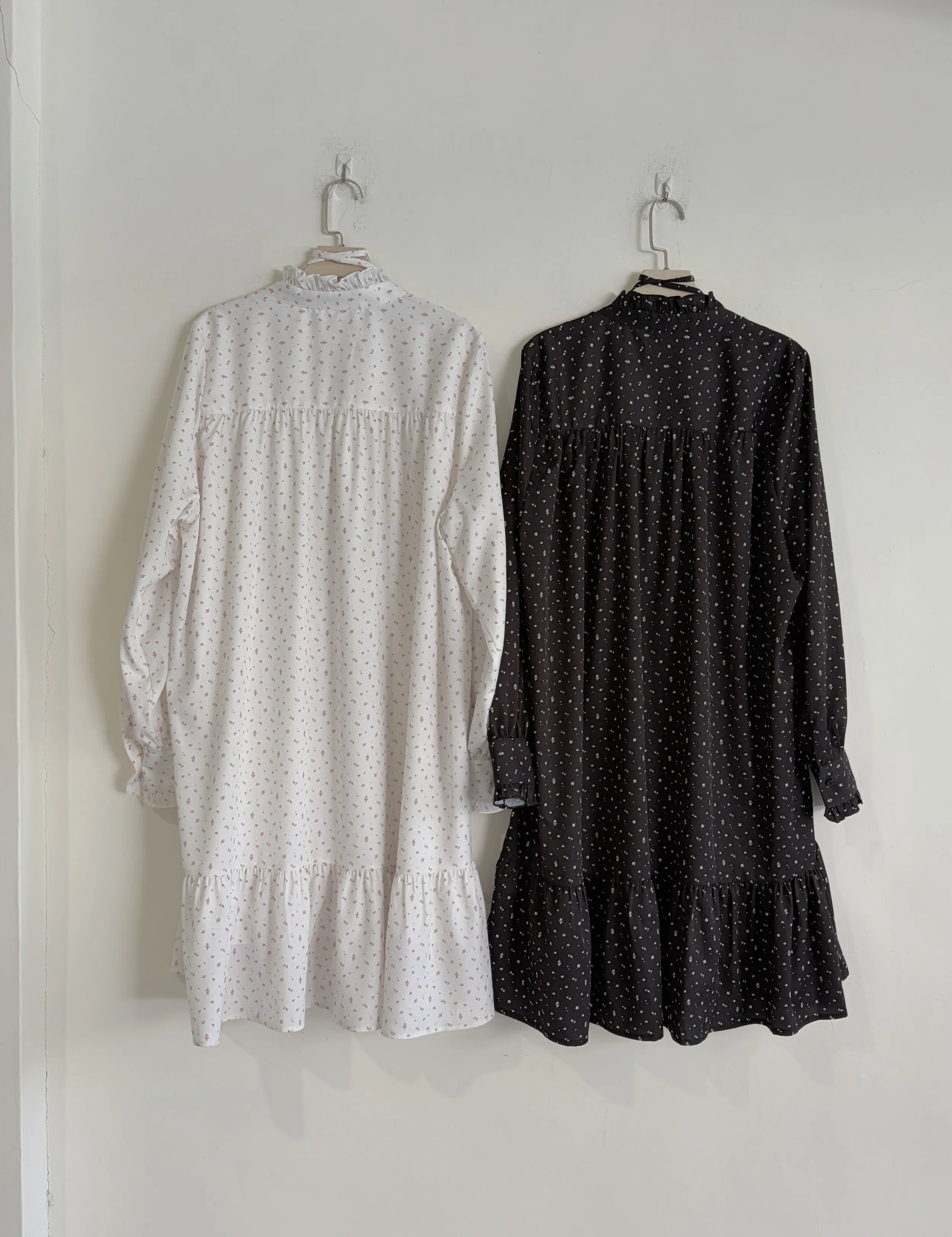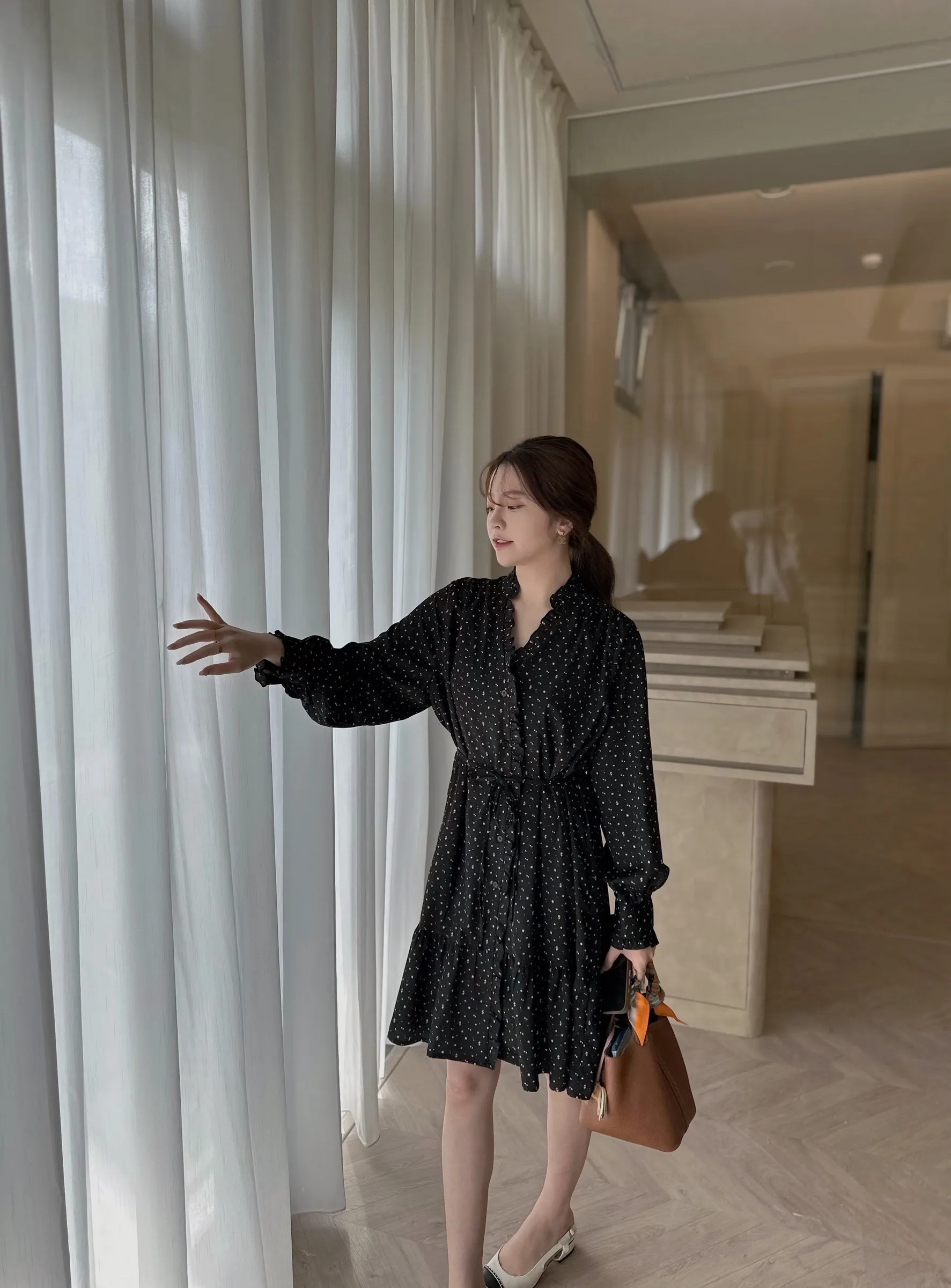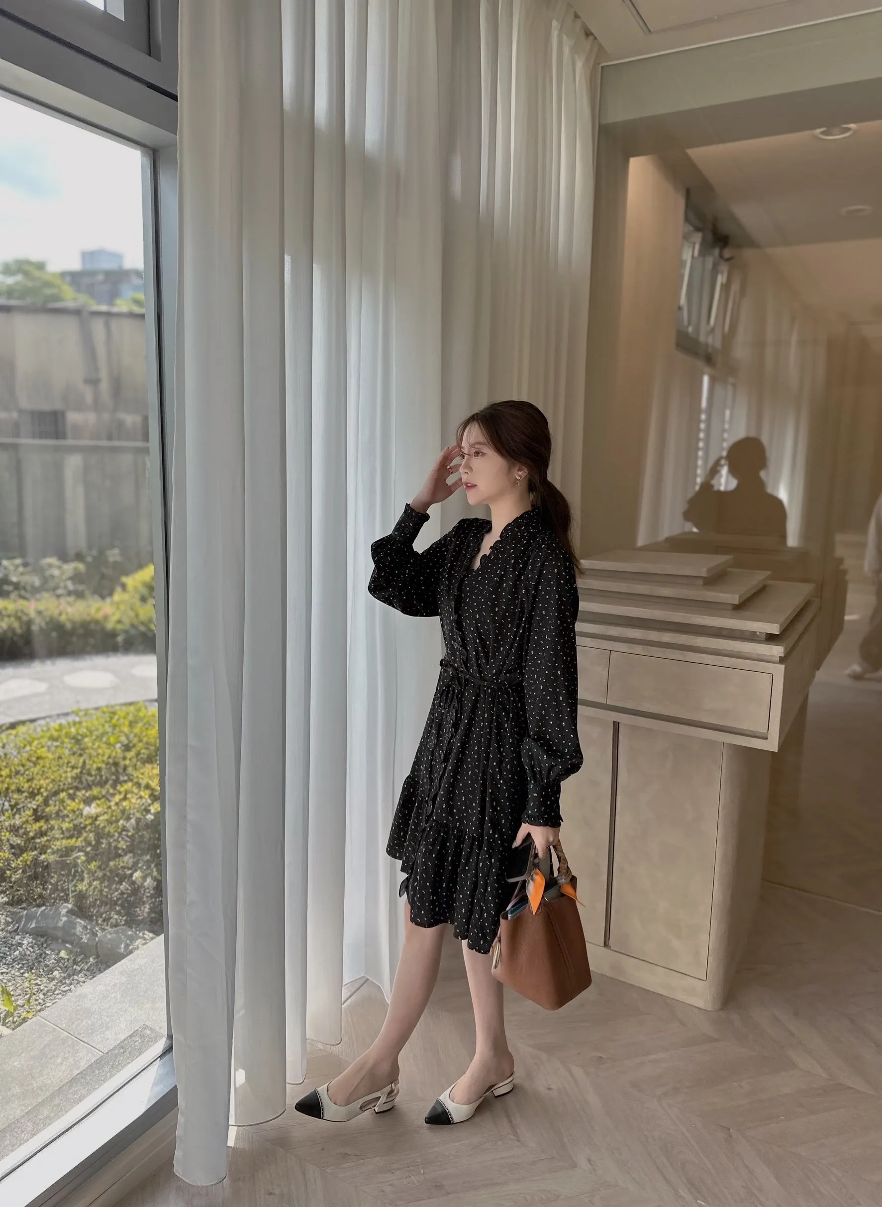A31107 甜美荷葉邊V領碎花綁帶長袖洋裝(有內裡)