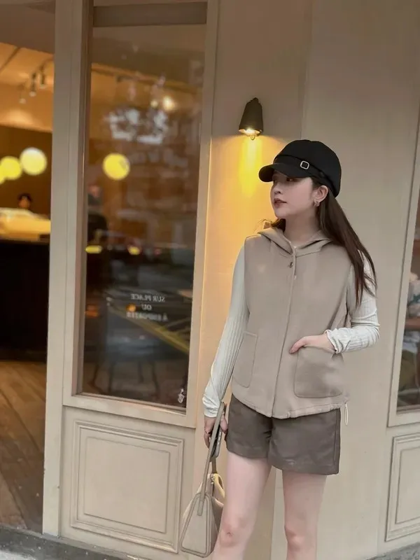W.Korea 100%澳洲手工羊毛大口袋拉鍊抽繩背心(微瑕疵不退換)