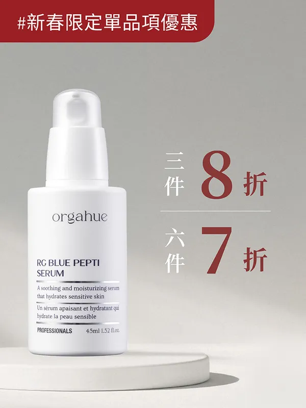 敏感肌必備 ! #六肽合一 RG藍胜肽多效修護精華液內含Orgahue專利藍胜肽α-blue peptideTM激活防止肌膚老化並以藍蓮花水取代純淨水,有效的激活修復通過國外多項認證獲得優秀等級72小時臨床實驗0%皮膚刺激/0%皮膚刺激成分/過敏發生率0%這瓶是經 KFDA 認證的亮白撫紋多功能精華液含有菸鹼醯胺50,000 ppm!可有效亮白肌膚 達到光澤肌效果再藉由4D玻尿酸提供肌膚水分並修護肌膚。