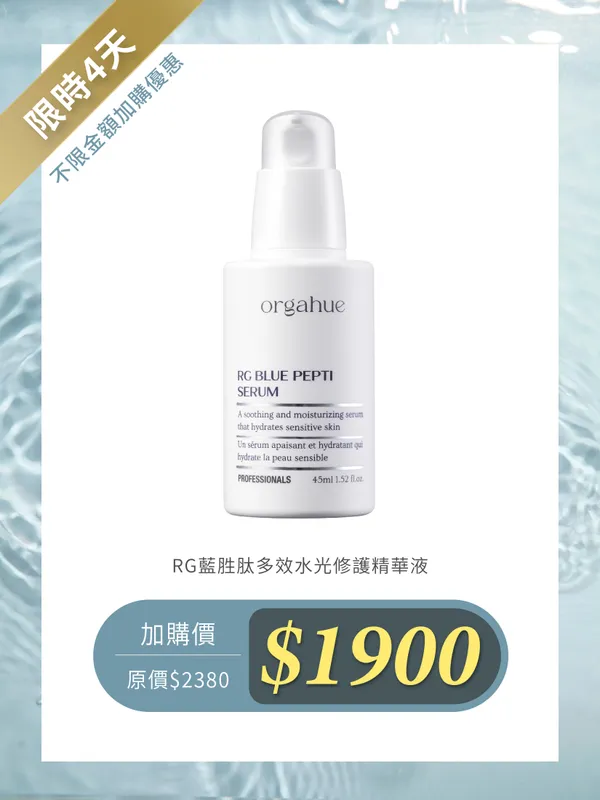 敏感肌必備 ! #六肽合一 RG藍胜肽多效修護精華液內含Orgahue專利藍胜肽α-blue peptideTM激活防止肌膚老化並以藍蓮花水取代純淨水,有效的激活修復通過國外多項認證獲得優秀等級72小時臨床實驗0%皮膚刺激/0%皮膚刺激成分/過敏發生率0%這瓶是經 KFDA 認證的亮白撫紋多功能精華液含有菸鹼醯胺50,000 ppm!可有效亮白肌膚 達到光澤肌效果再藉由4D玻尿酸提供肌膚水分並修護肌膚。
