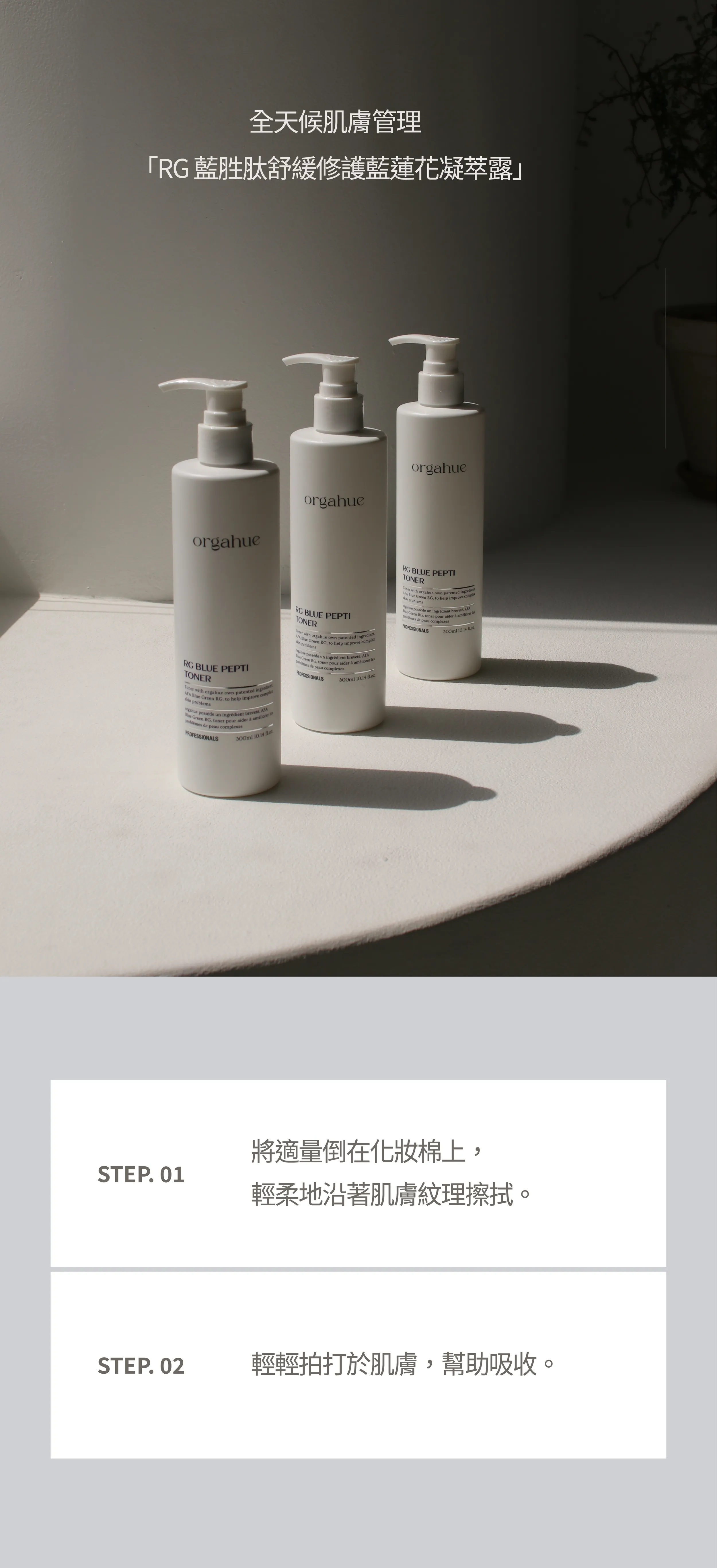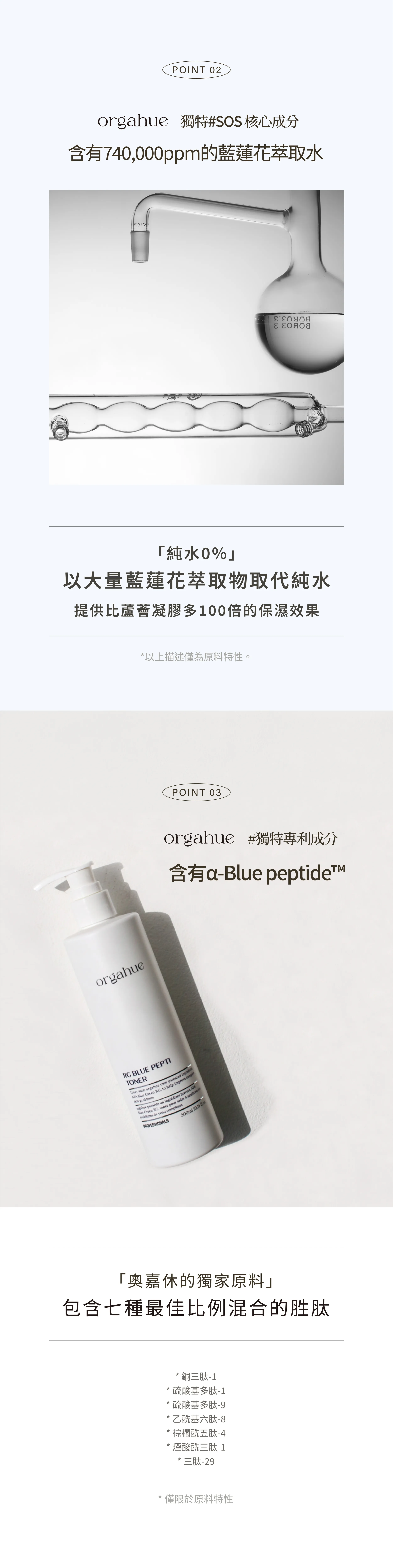 奧嘉休α-blue peptideTM獨家專利藍胜肽一瓶抵3瓶的RG藍胜肽凝萃露以74%藍蓮花萃取水取代純淨水,保濕效果是蘆薈凝膠的100倍除了可激活修復,大幅提升肌膚彈性內涵泛醇(維生素B5),可强化皮膚天然屏障,達到修護肌膚的效果,也能快速為肌膚補充水分。通過國外多項認證獲得優秀等級72小時臨床實驗0%皮膚刺激/0%皮膚刺激成分/過敏發生率0%