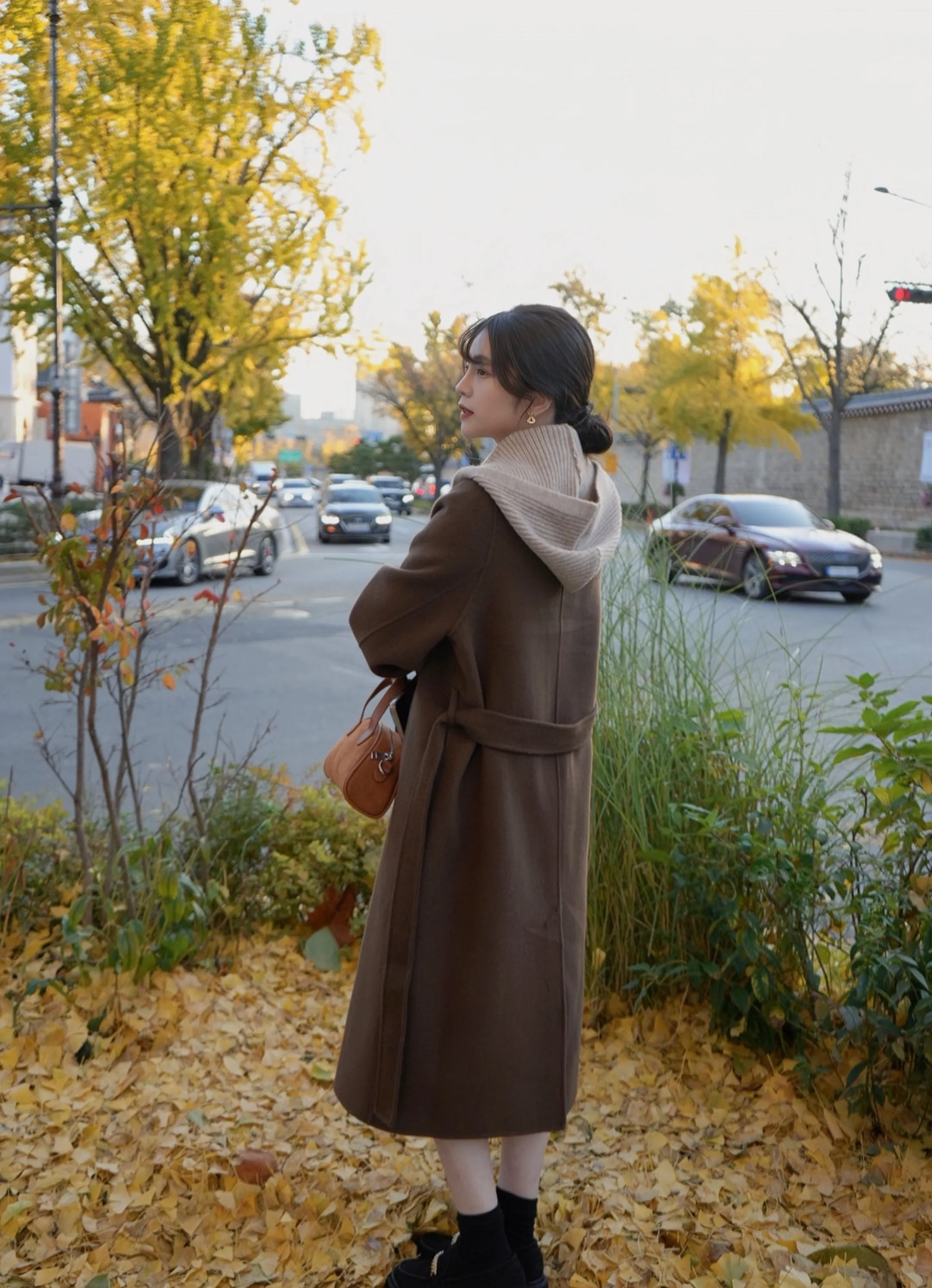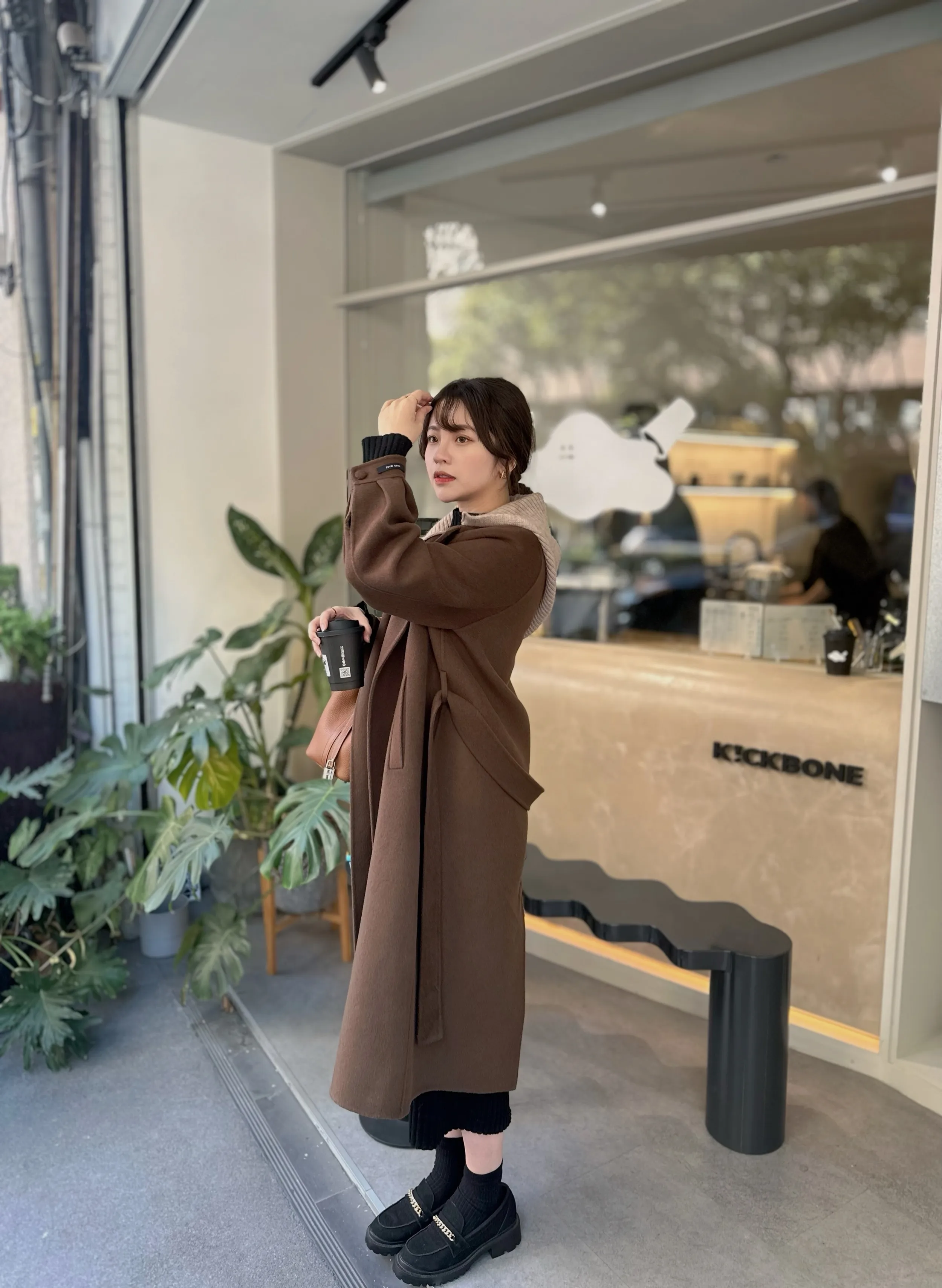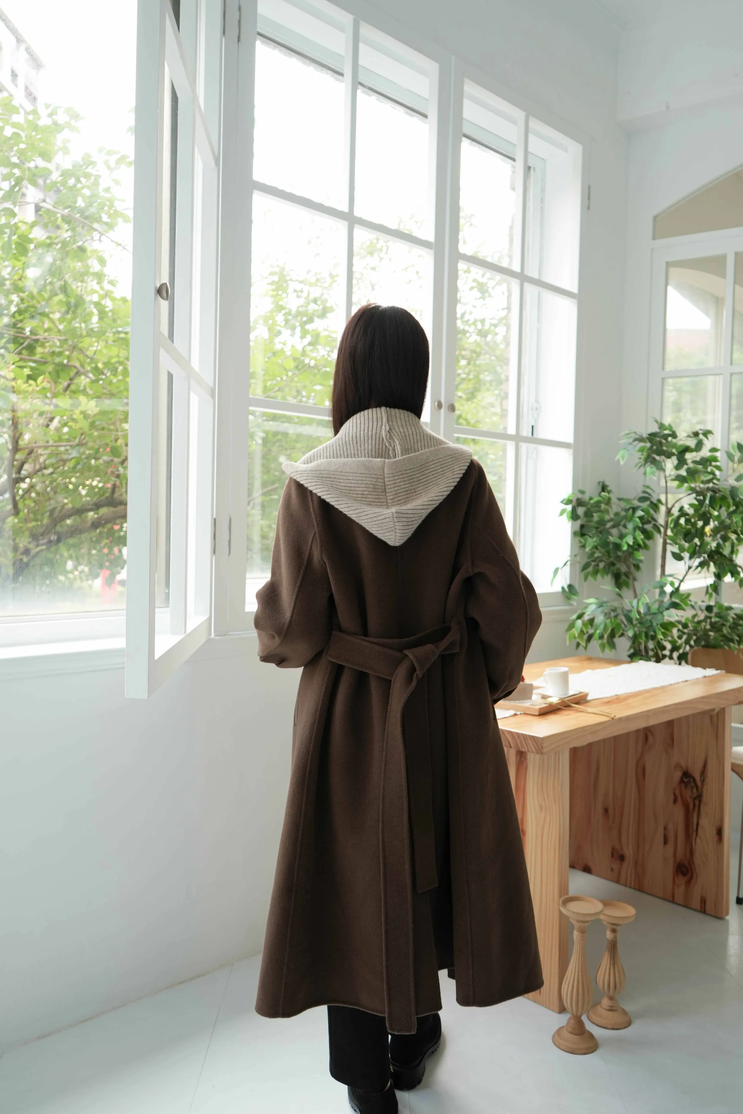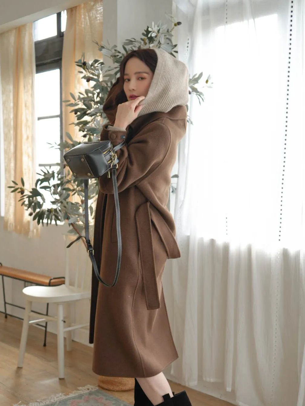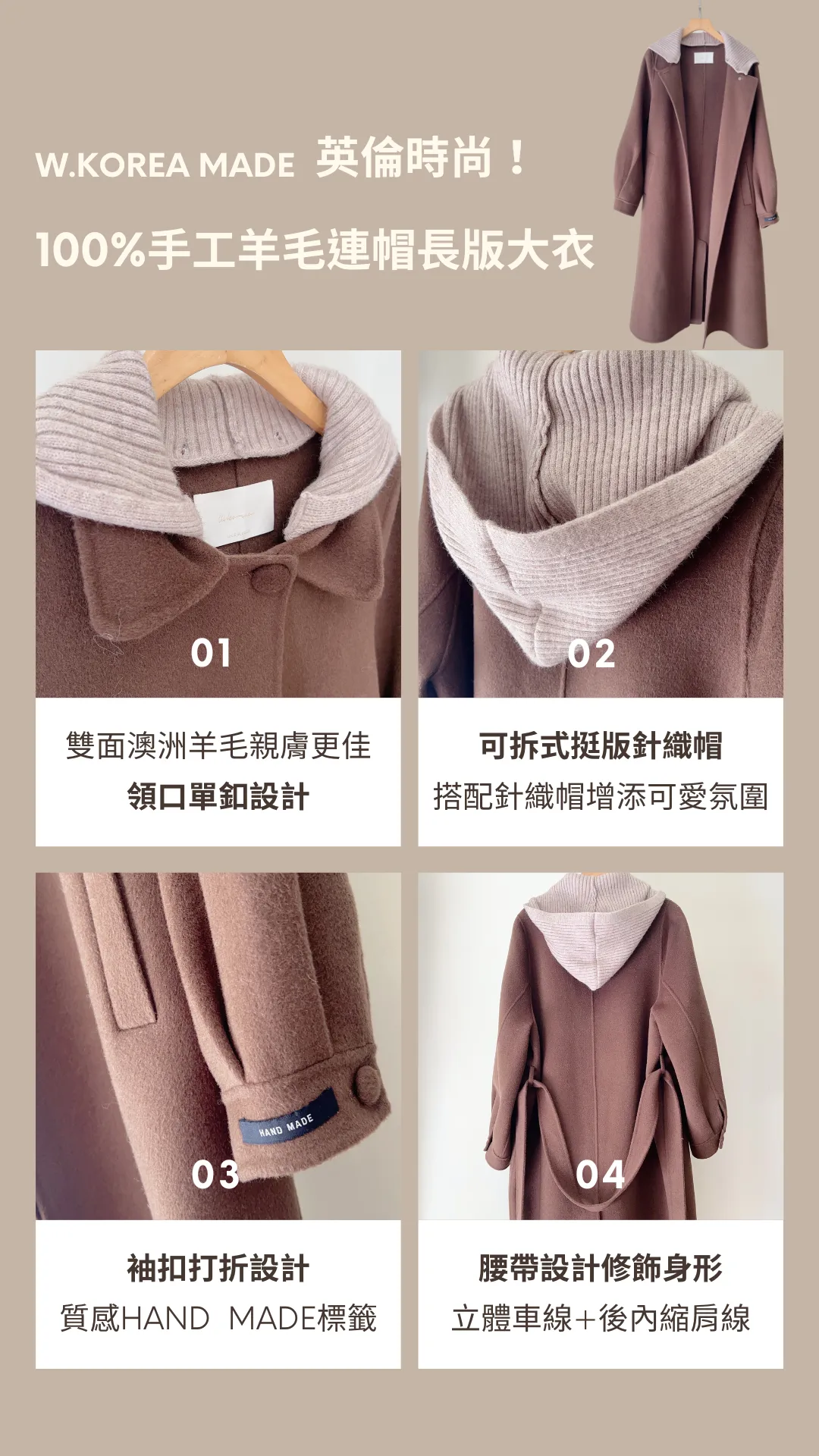 W.Korea#美拉德顯白咖 100%澳洲手工羊毛連帽綁帶大衣