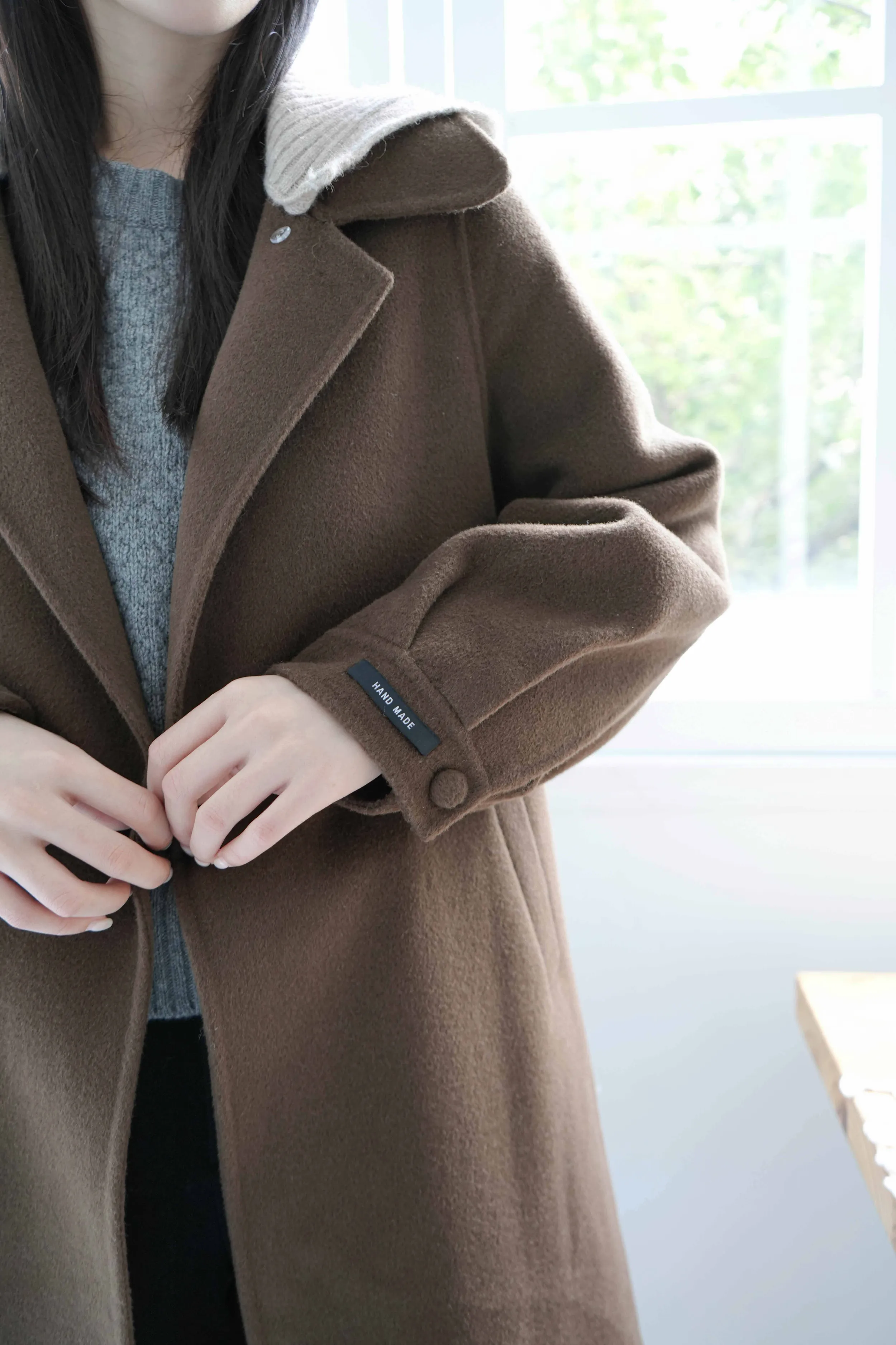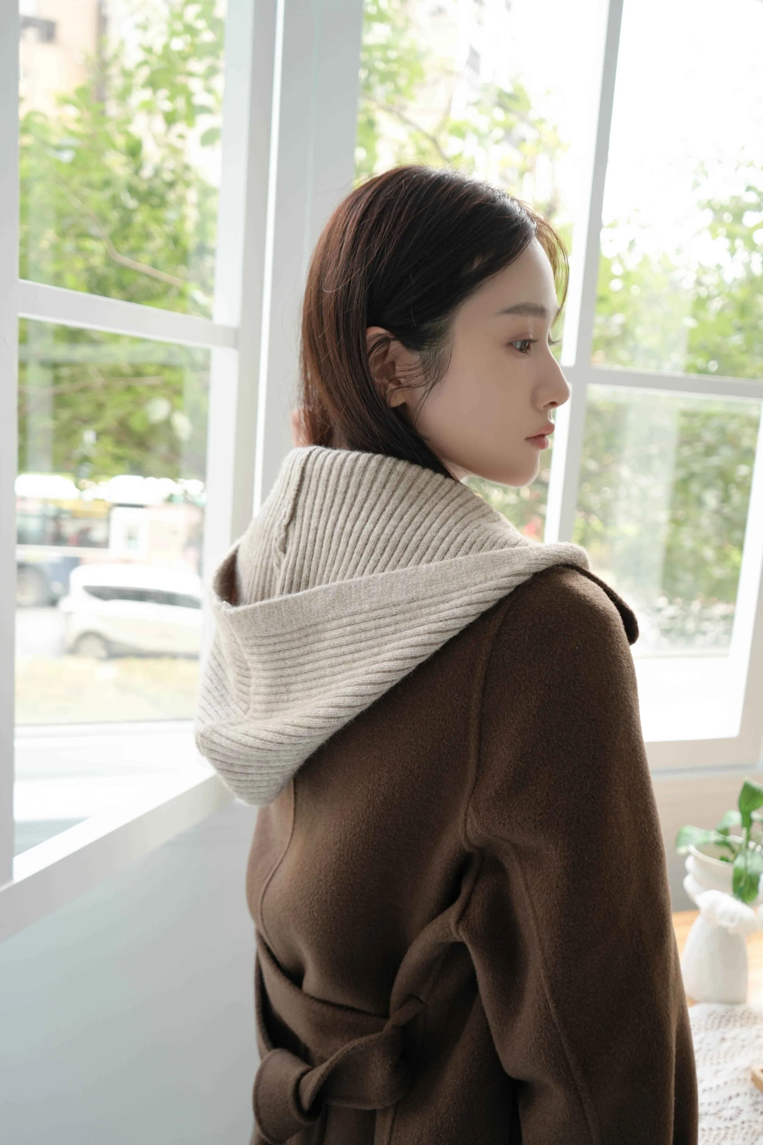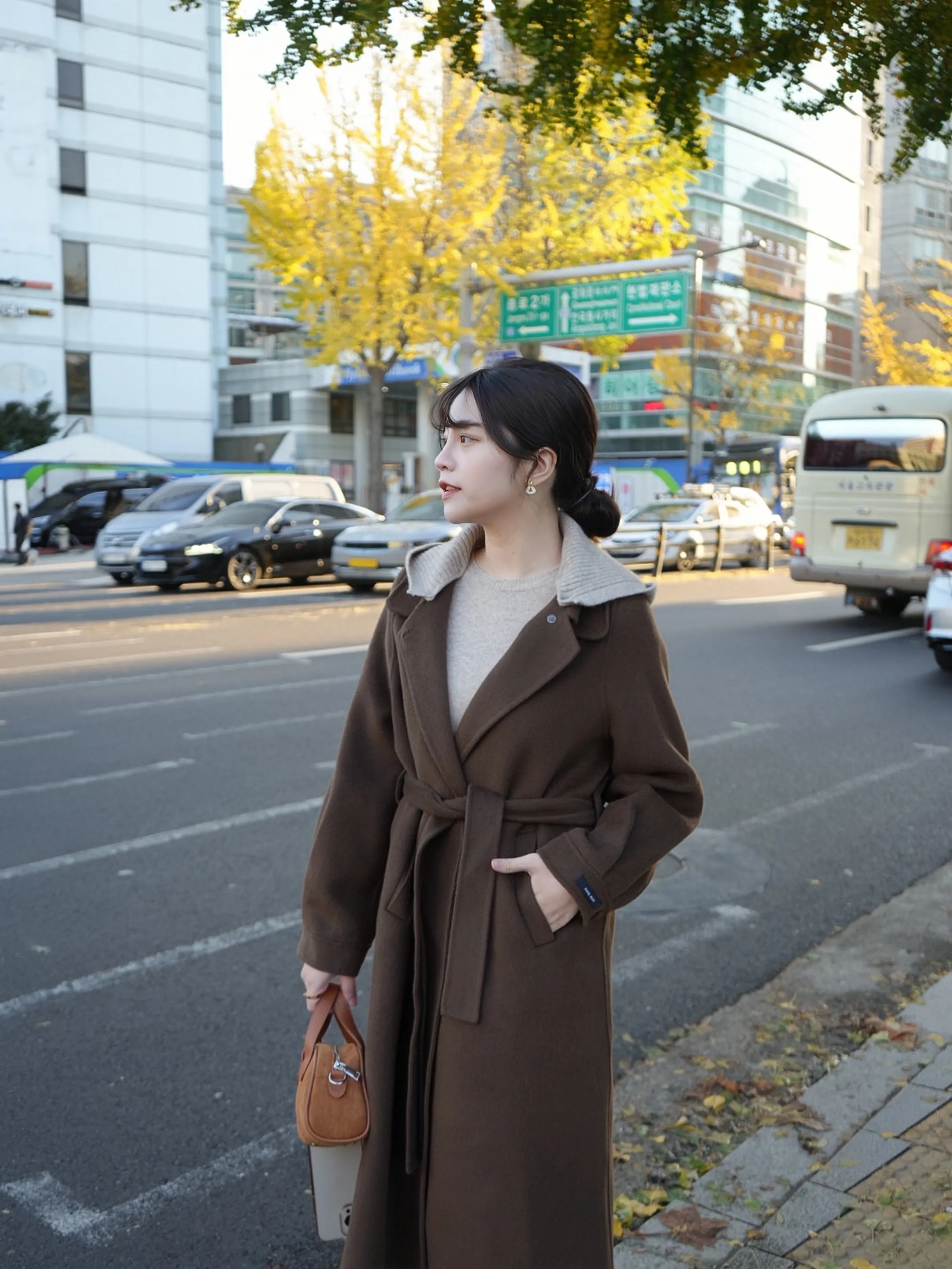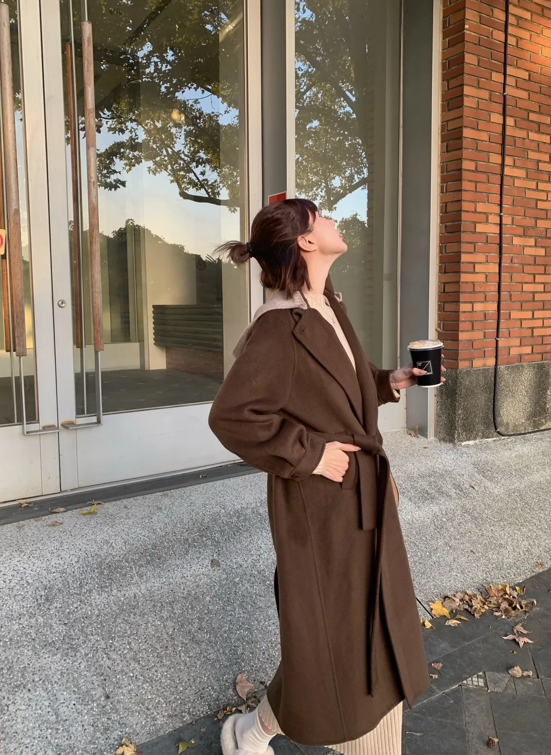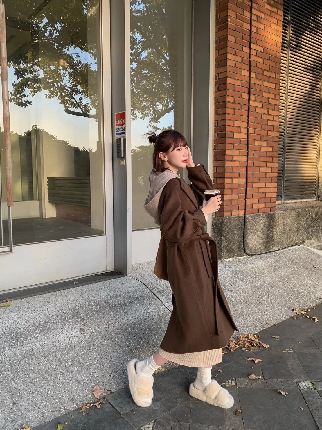 W.Korea#美拉德顯白咖 100%澳洲手工羊毛連帽綁帶大衣
