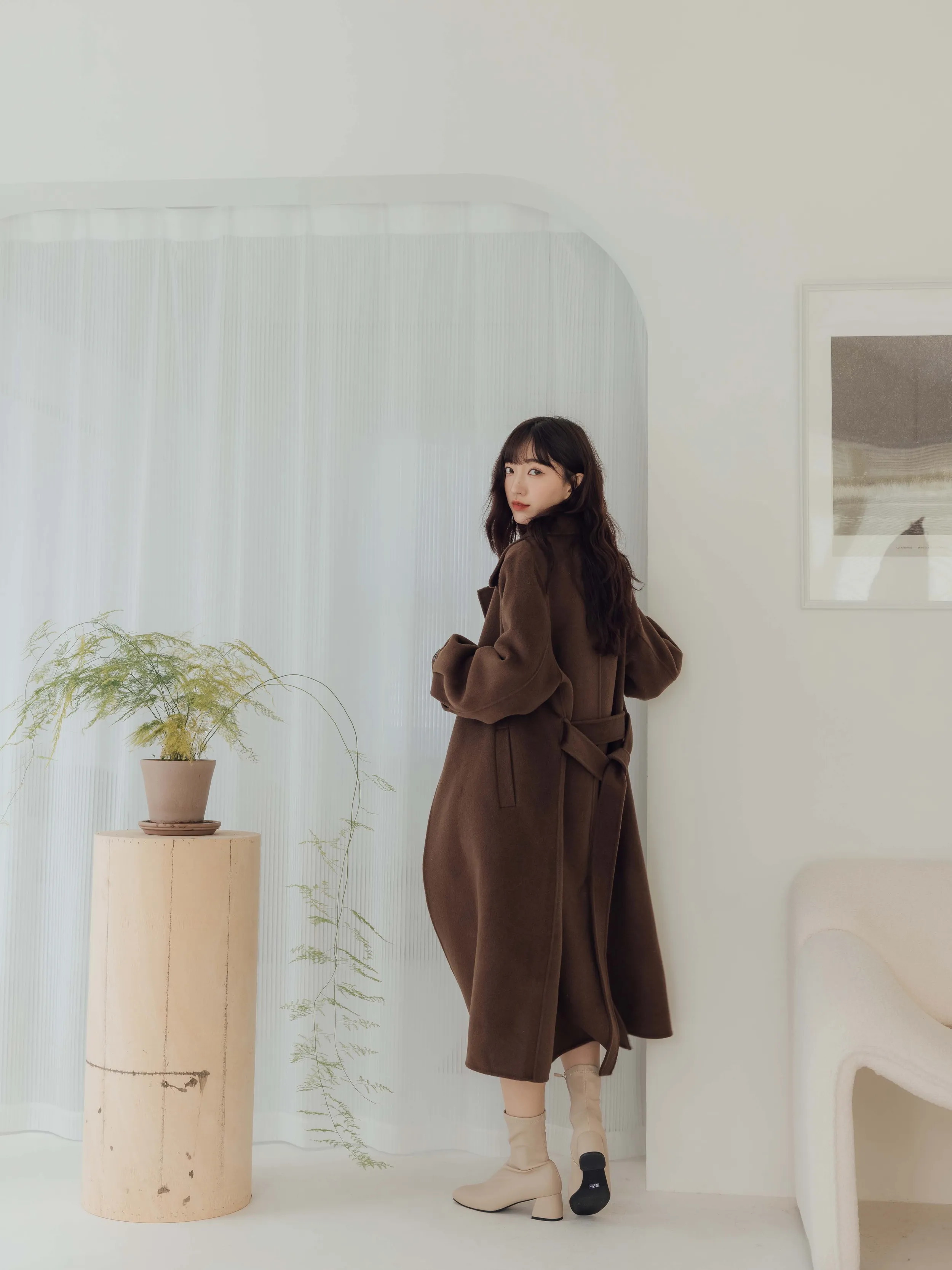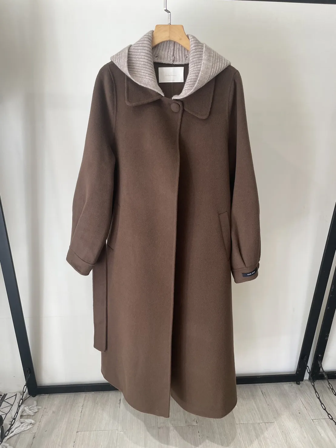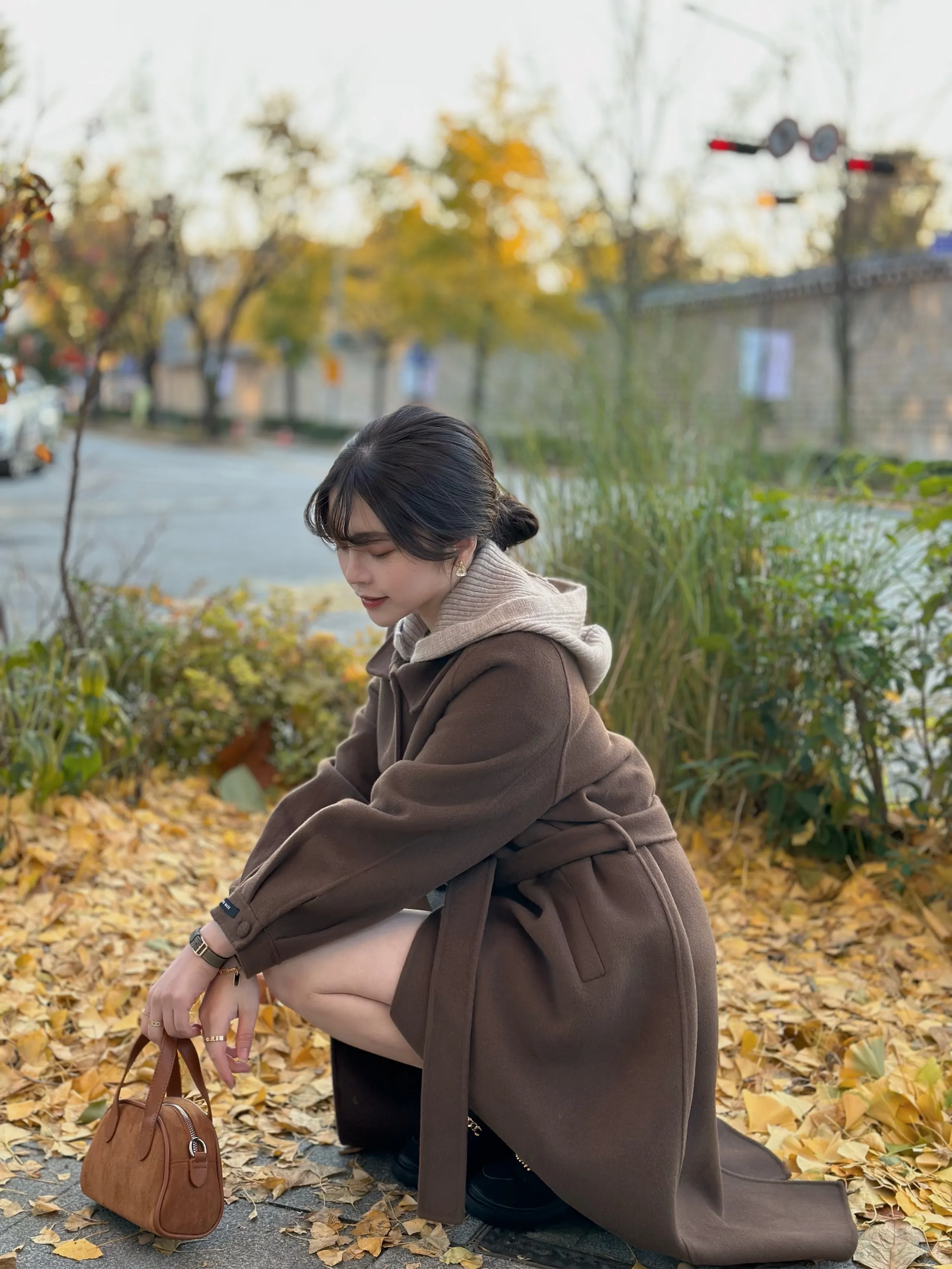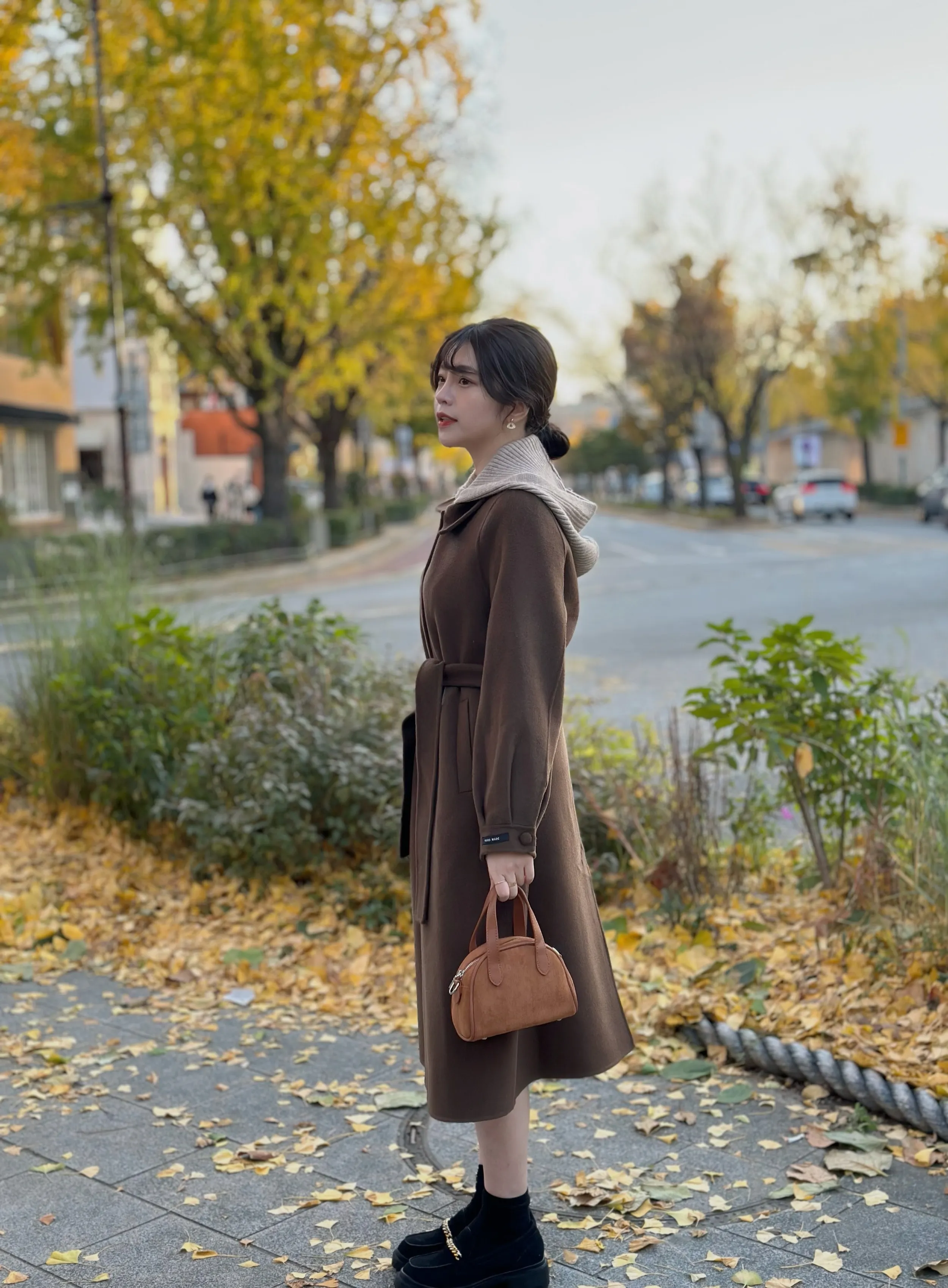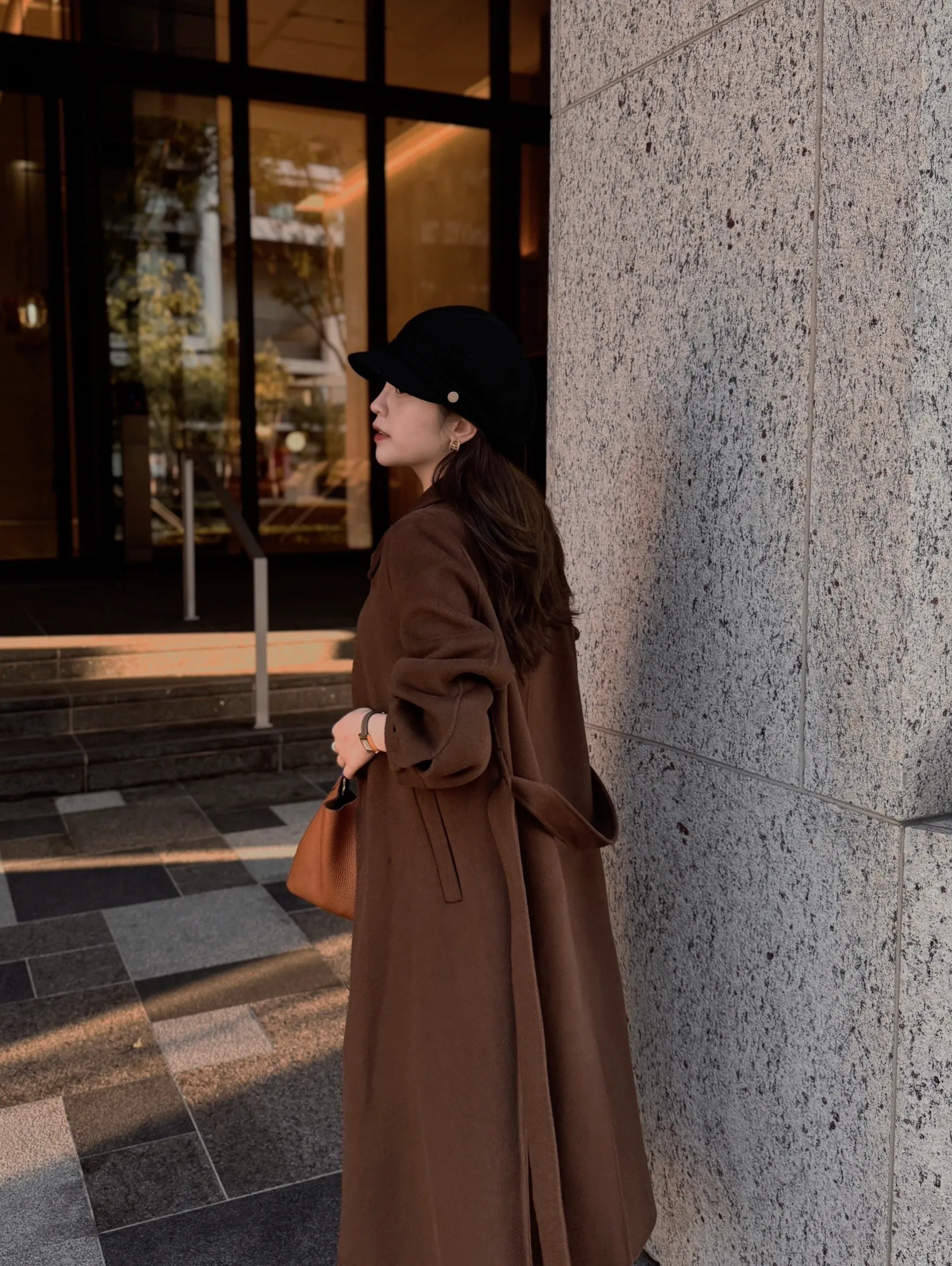 W.Korea#美拉德顯白咖 100%澳洲手工羊毛連帽綁帶大衣