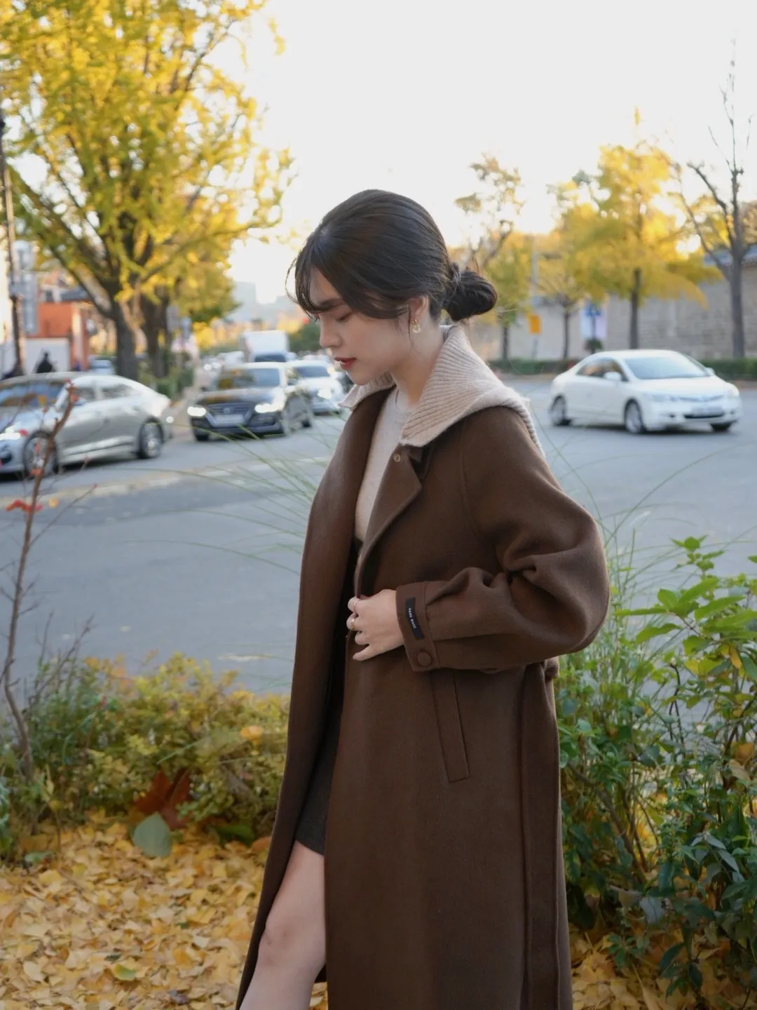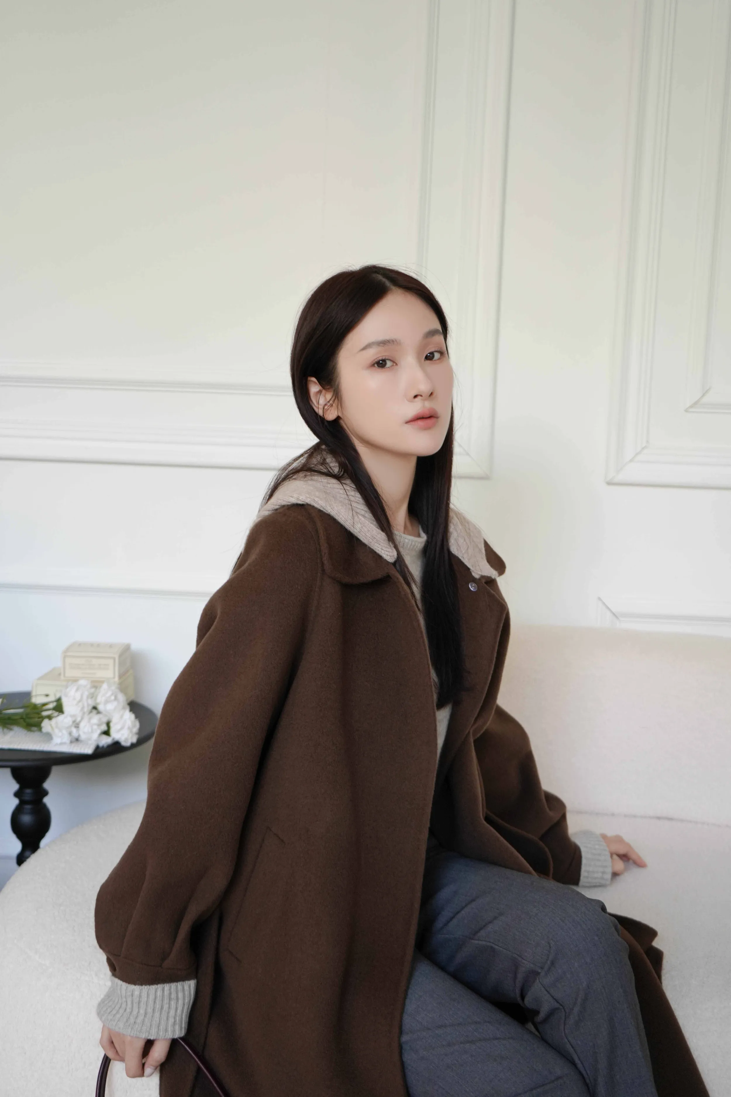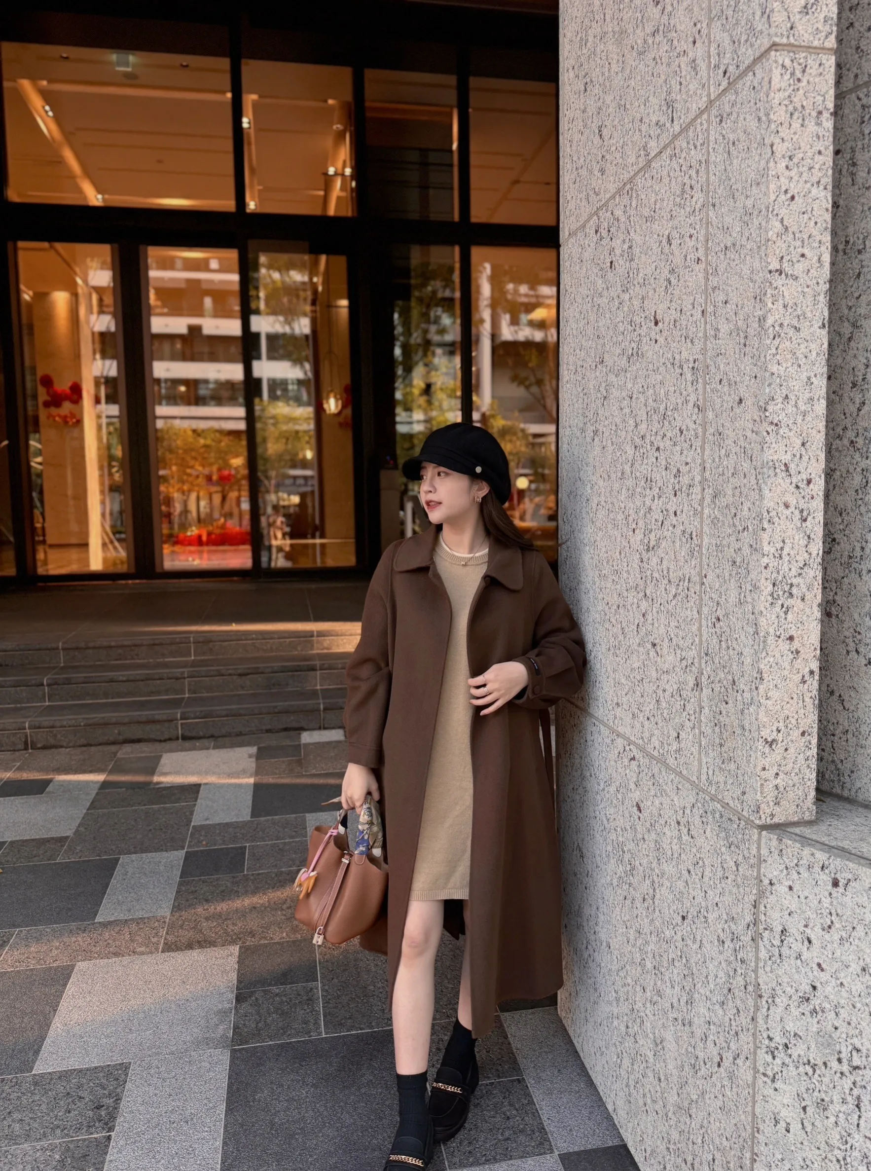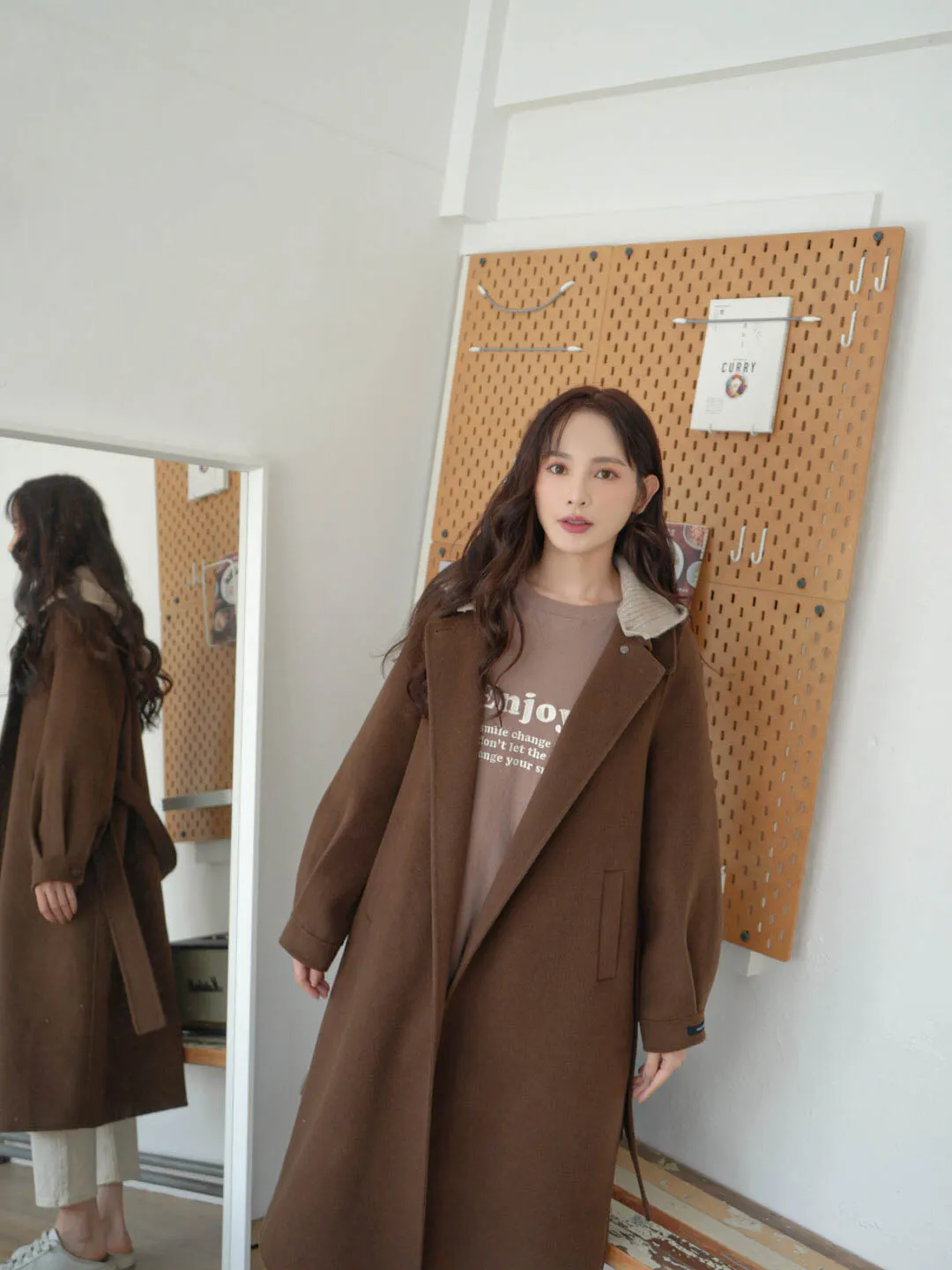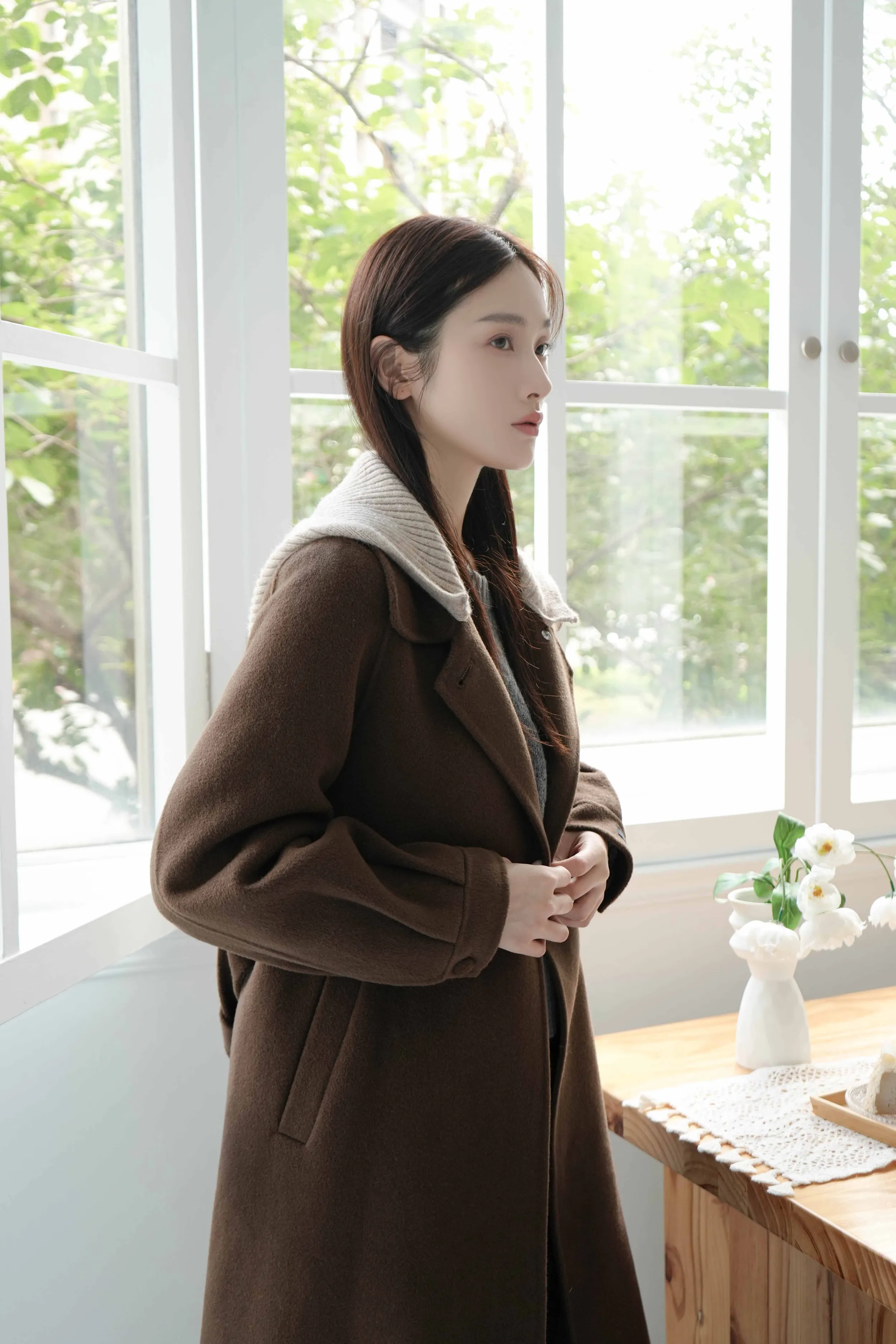W.Korea#美拉德顯白咖 100%澳洲手工羊毛連帽綁帶大衣