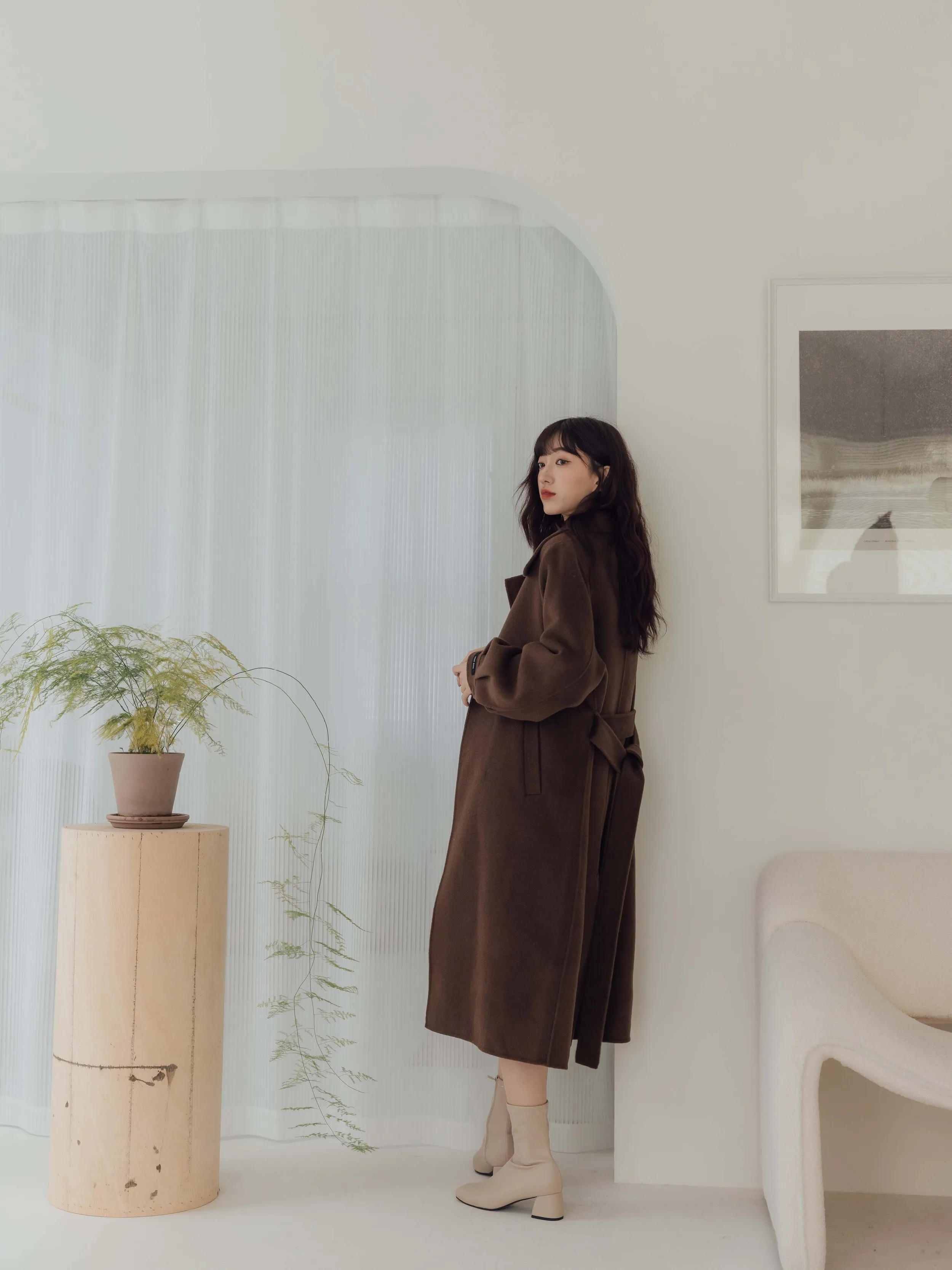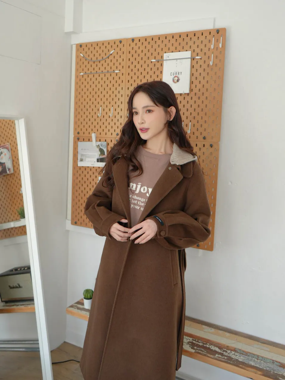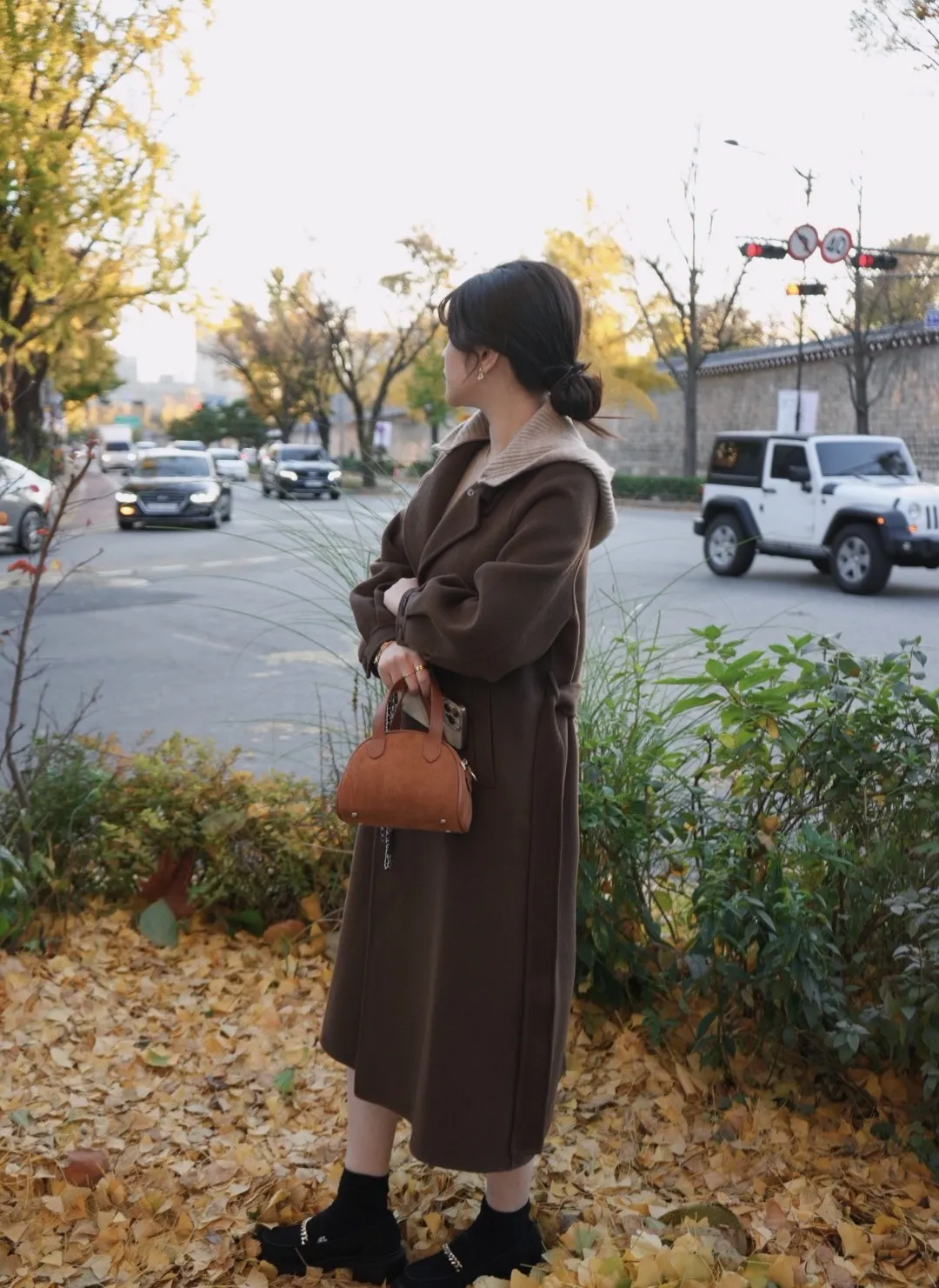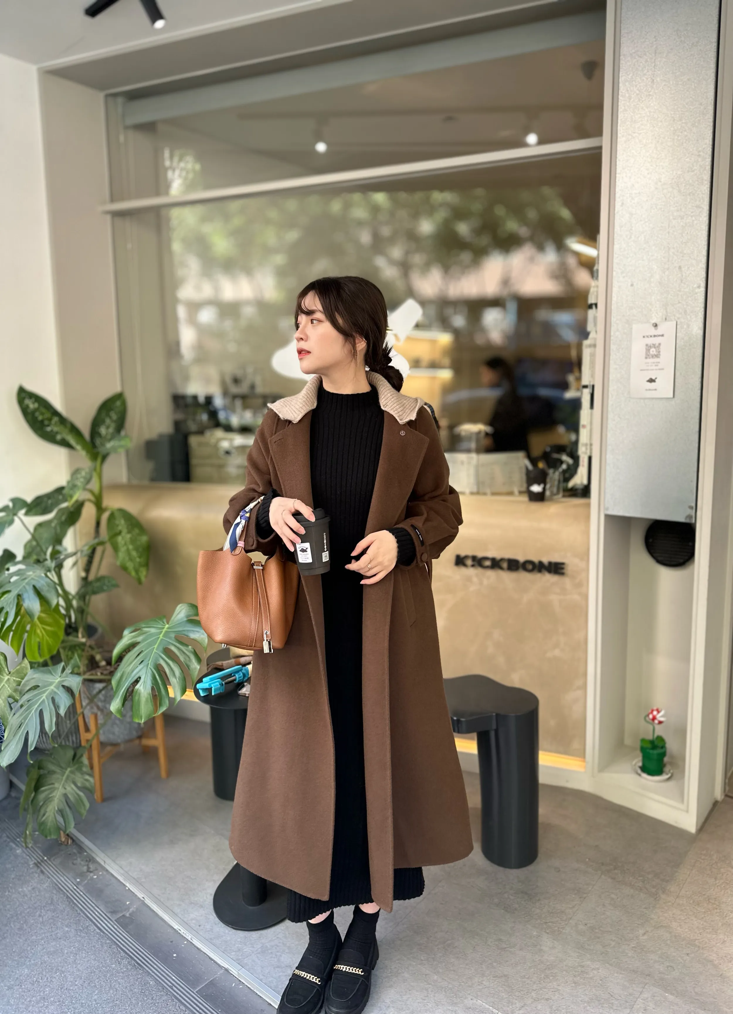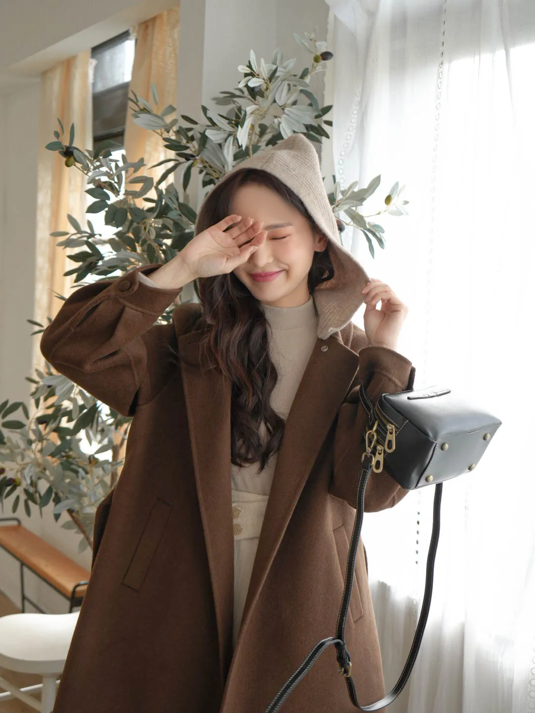 W.Korea#美拉德顯白咖 100%澳洲手工羊毛連帽綁帶大衣