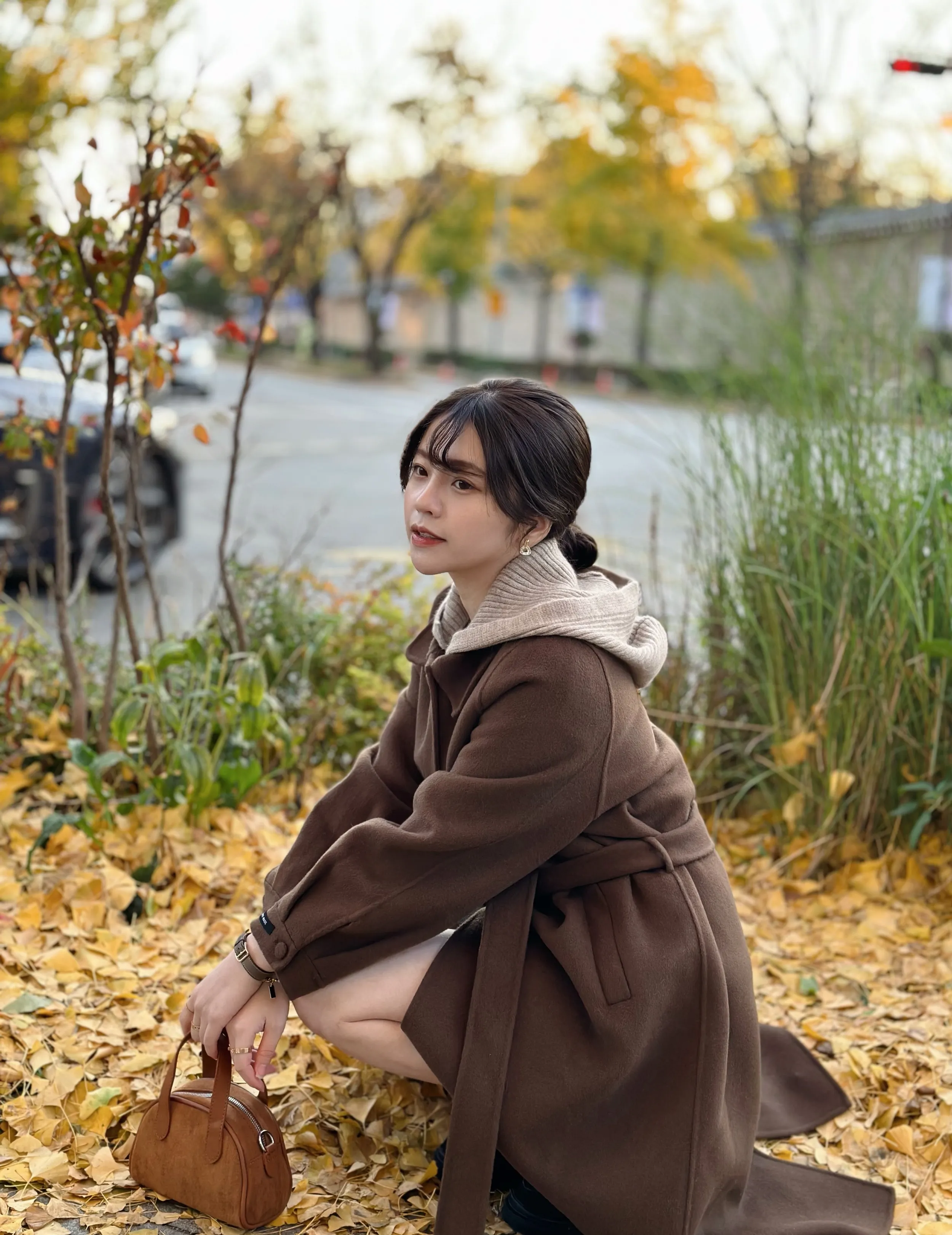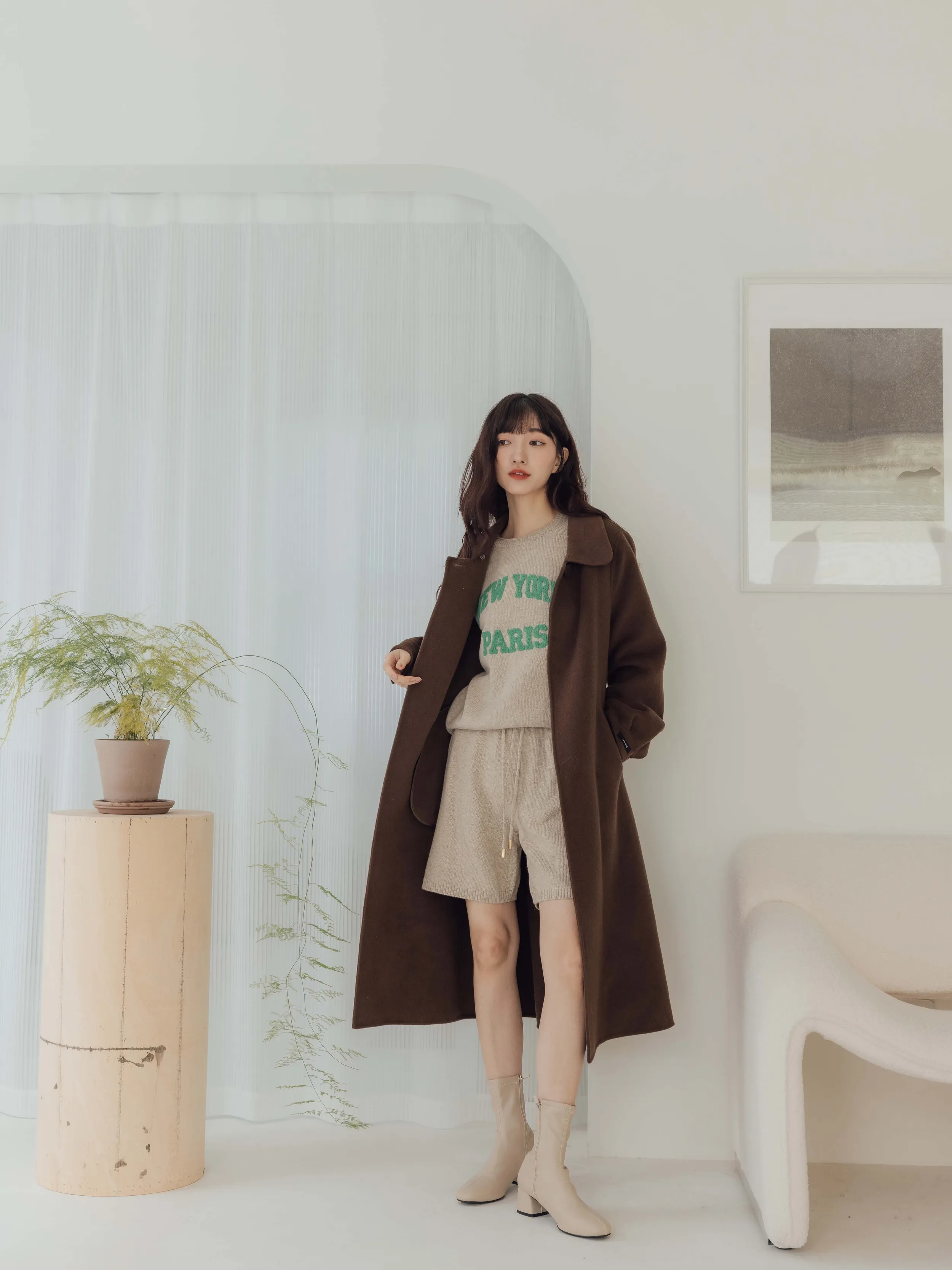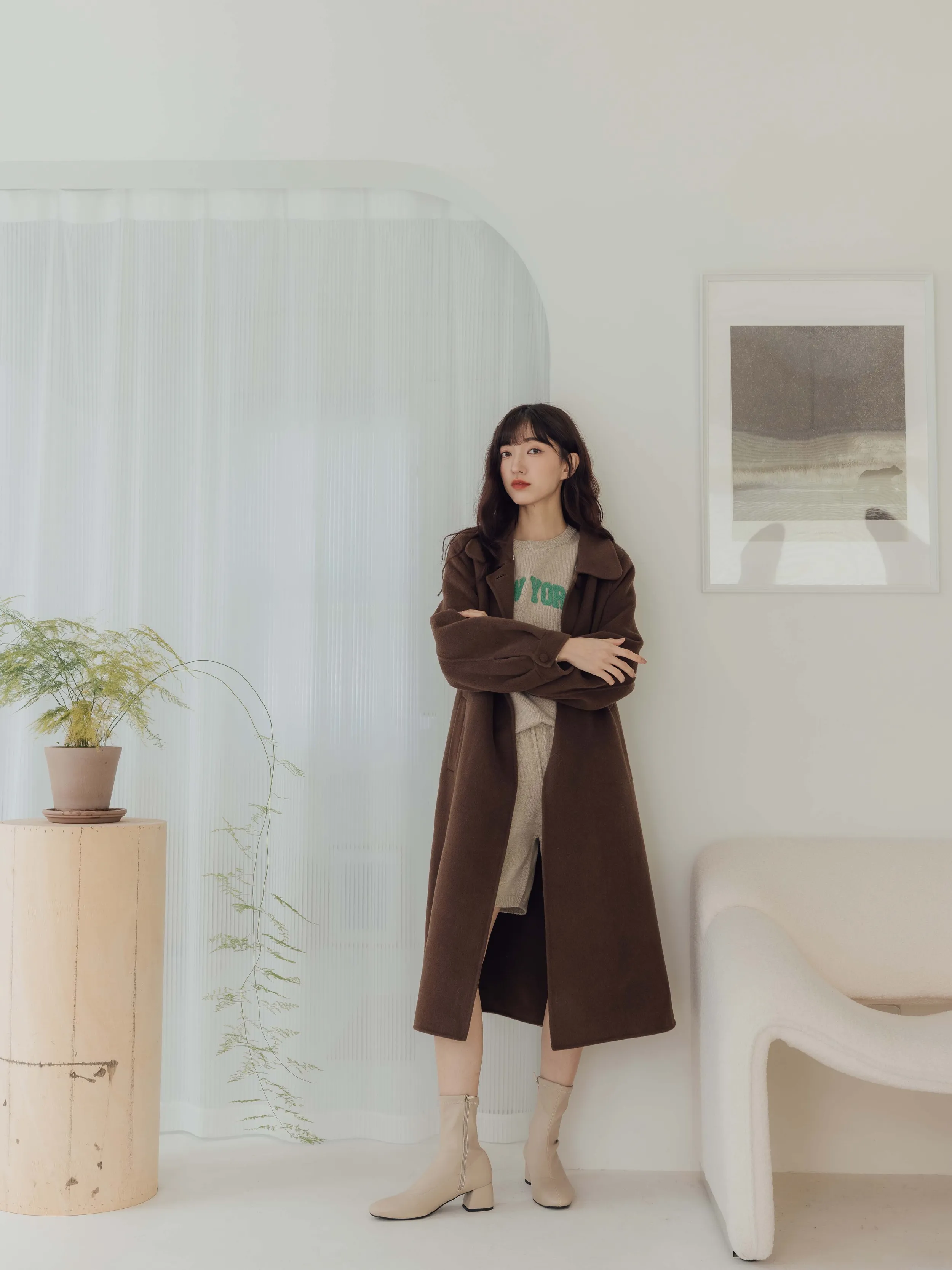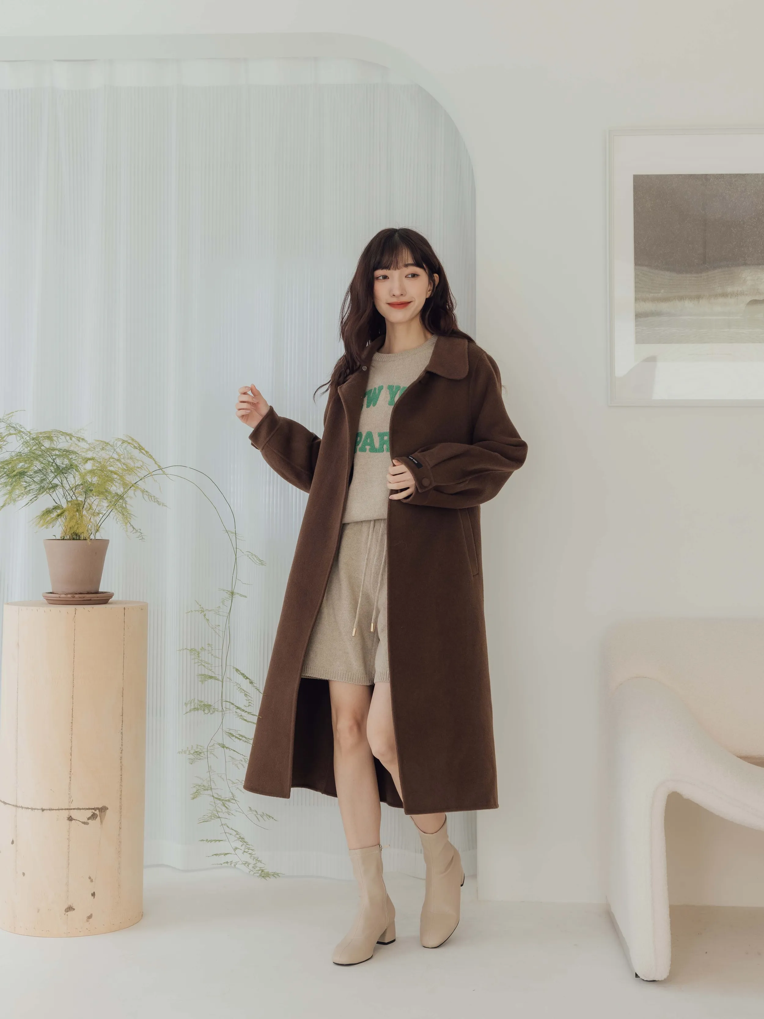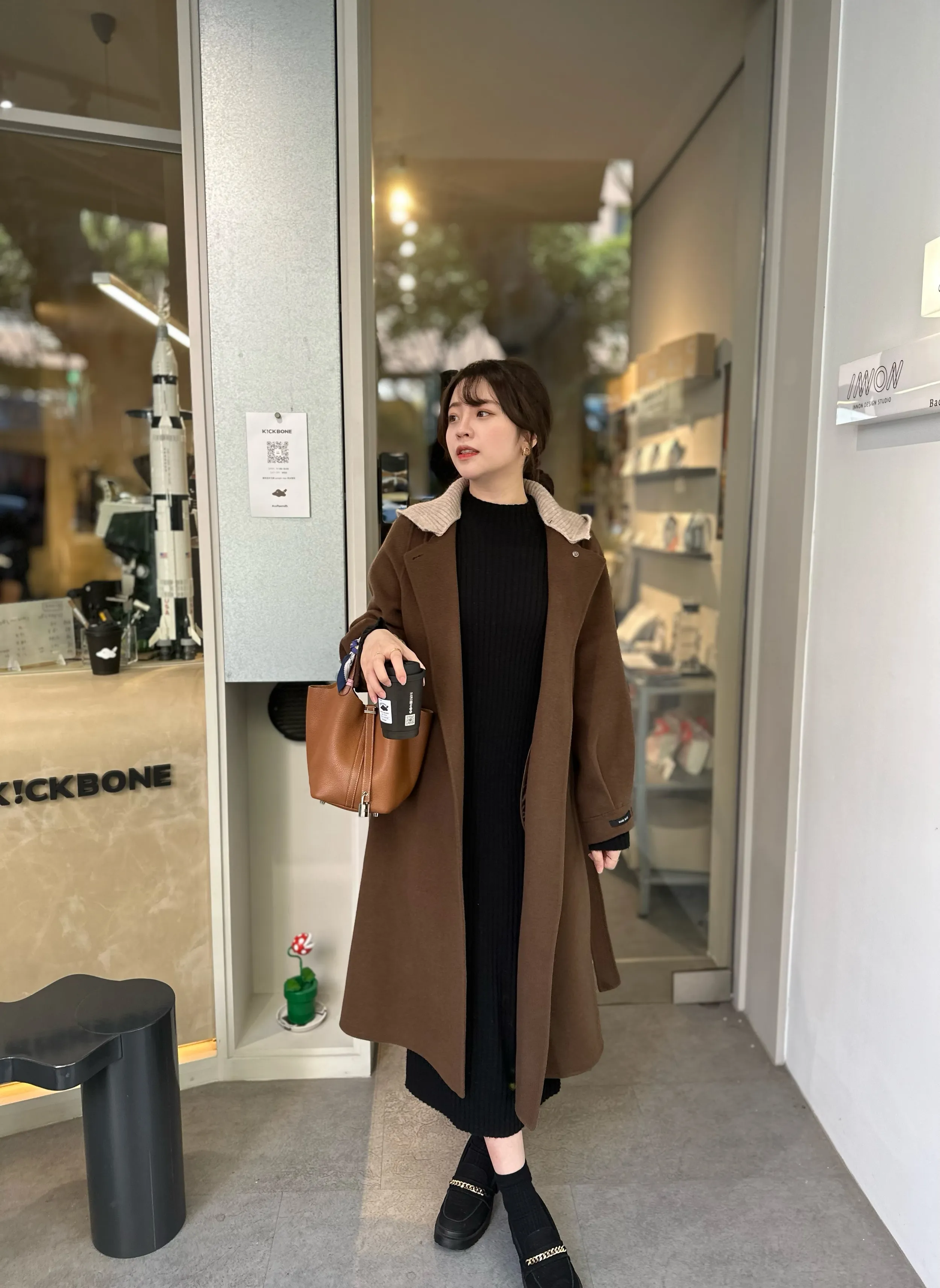 W.Korea#美拉德顯白咖 100%澳洲手工羊毛連帽綁帶大衣