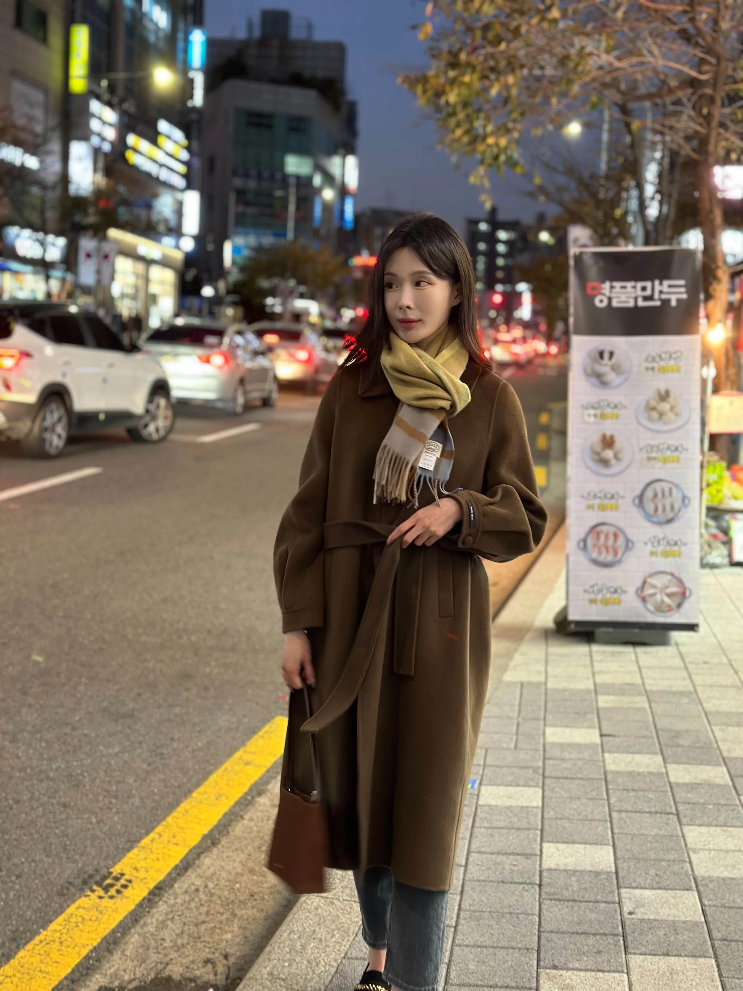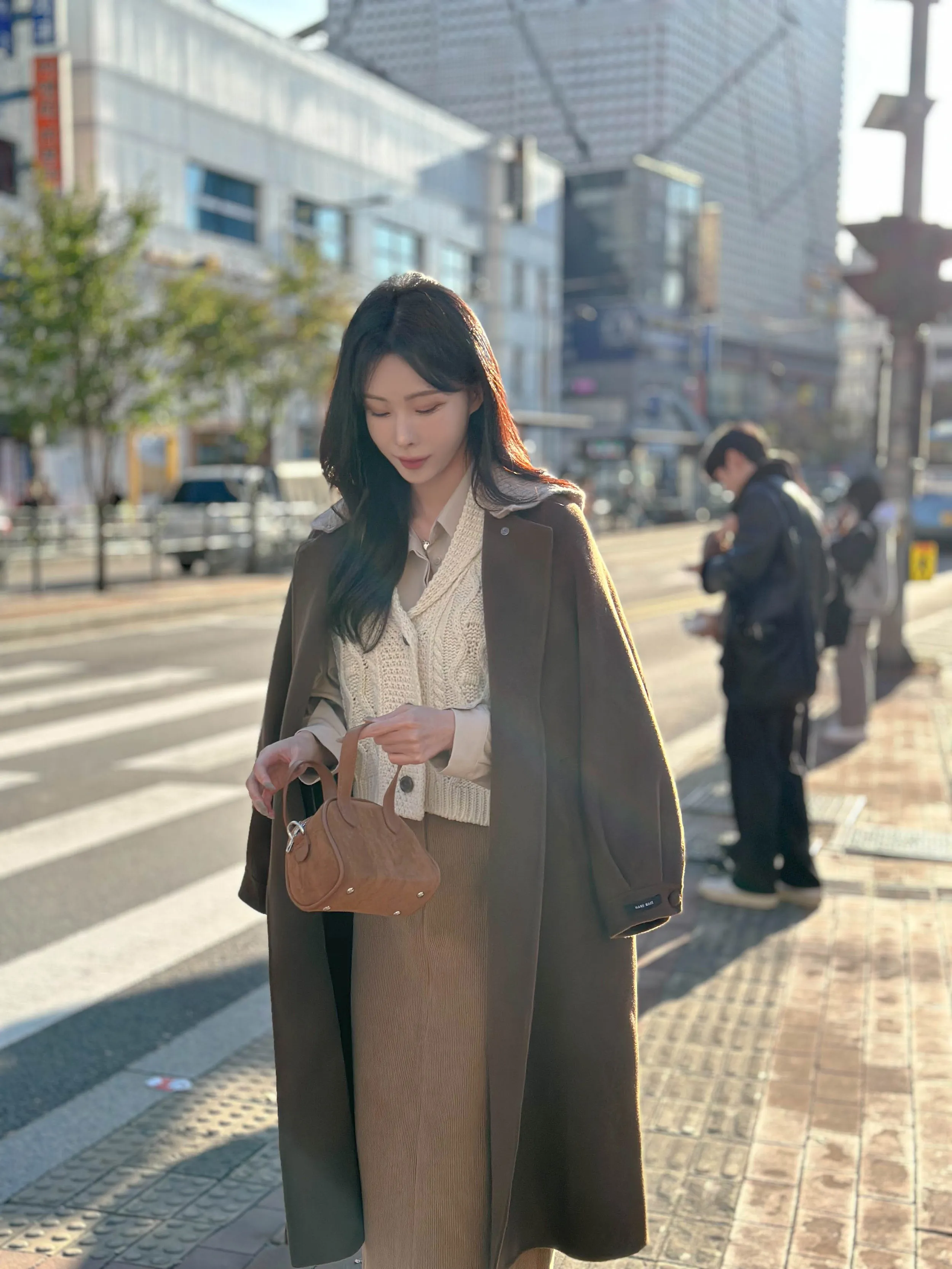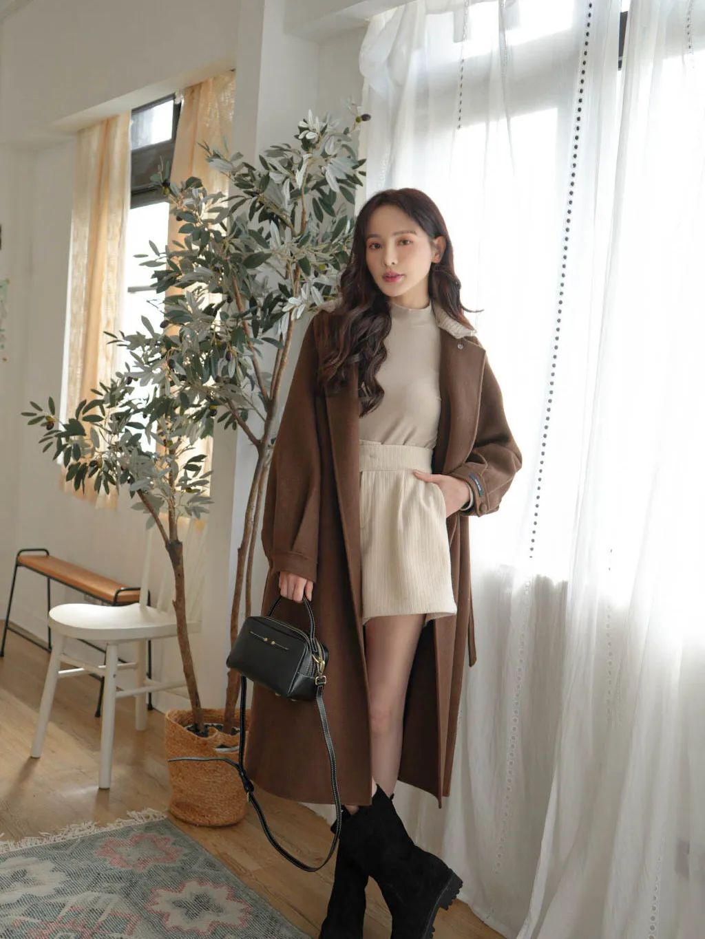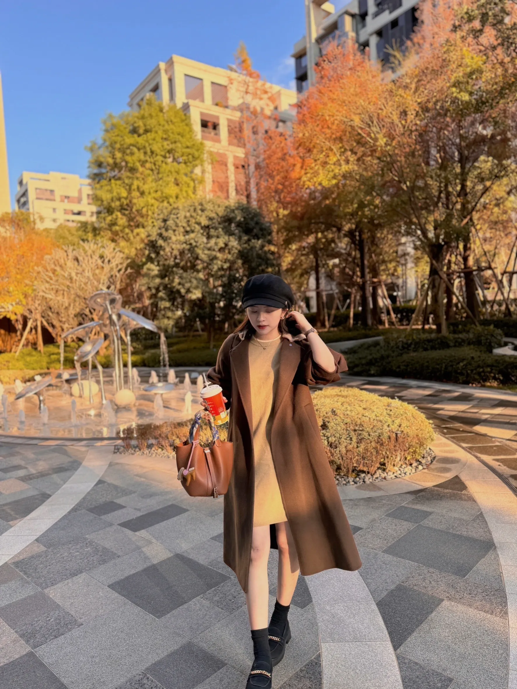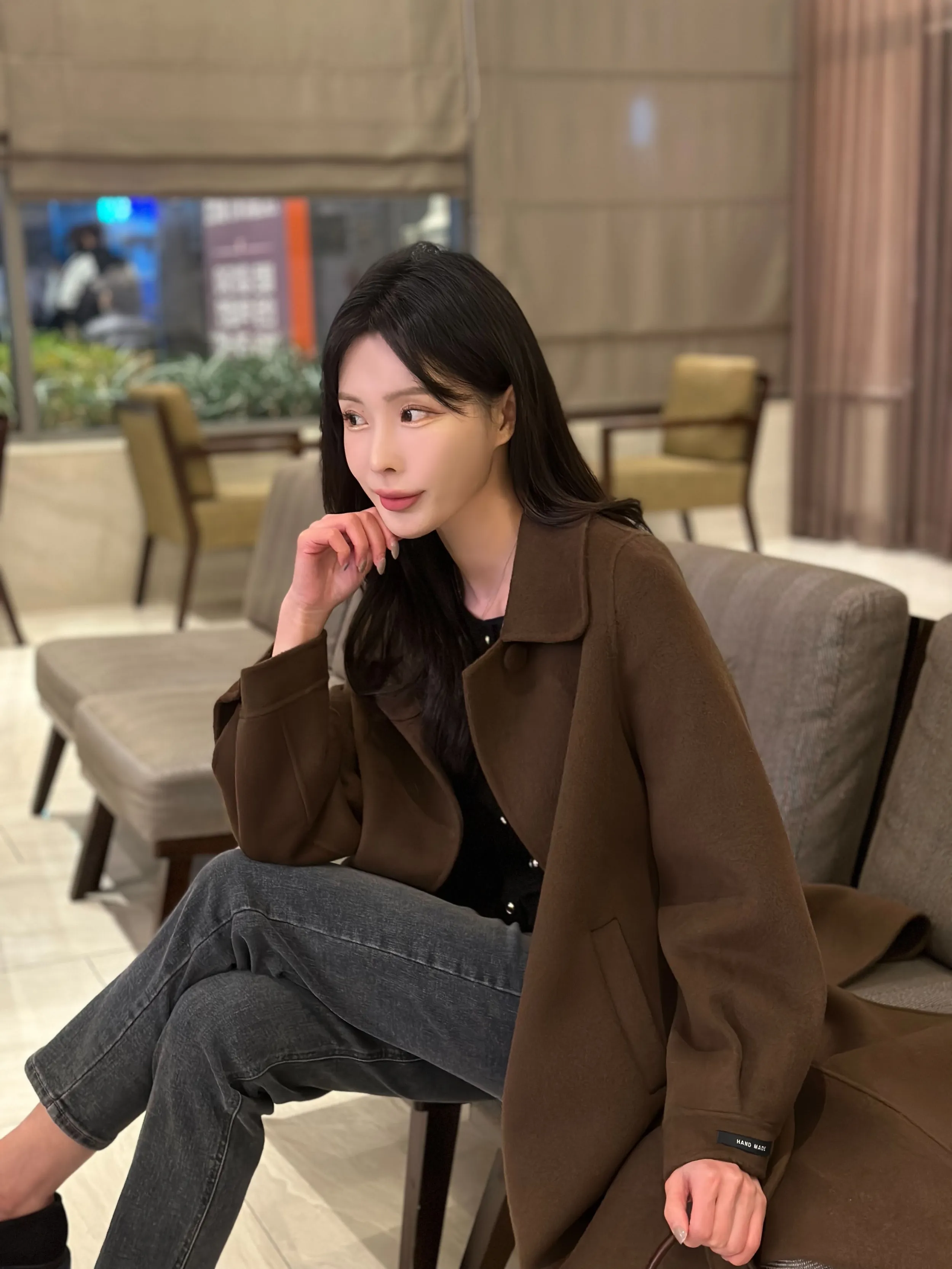 W.Korea#美拉德顯白咖 100%澳洲手工羊毛連帽綁帶大衣