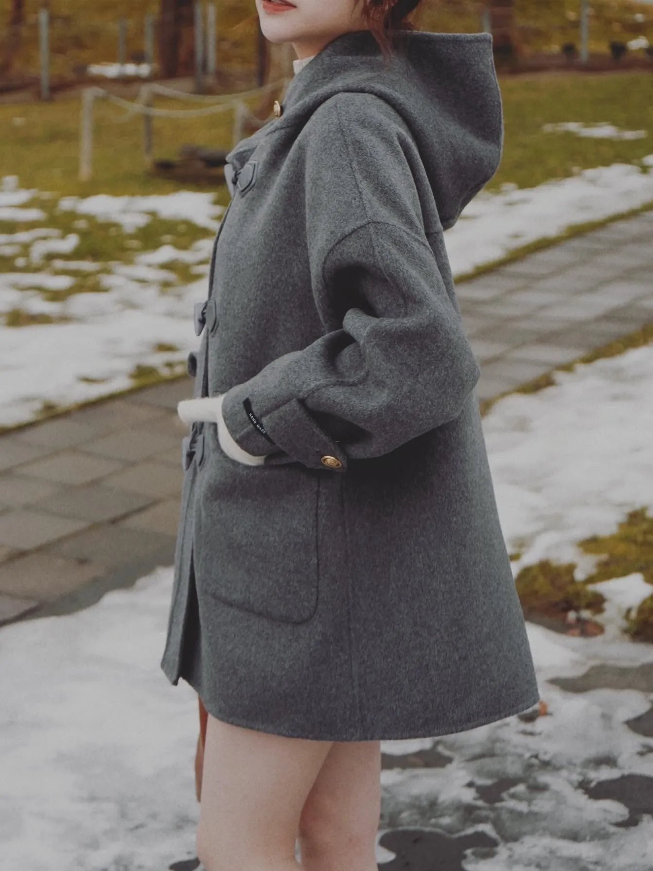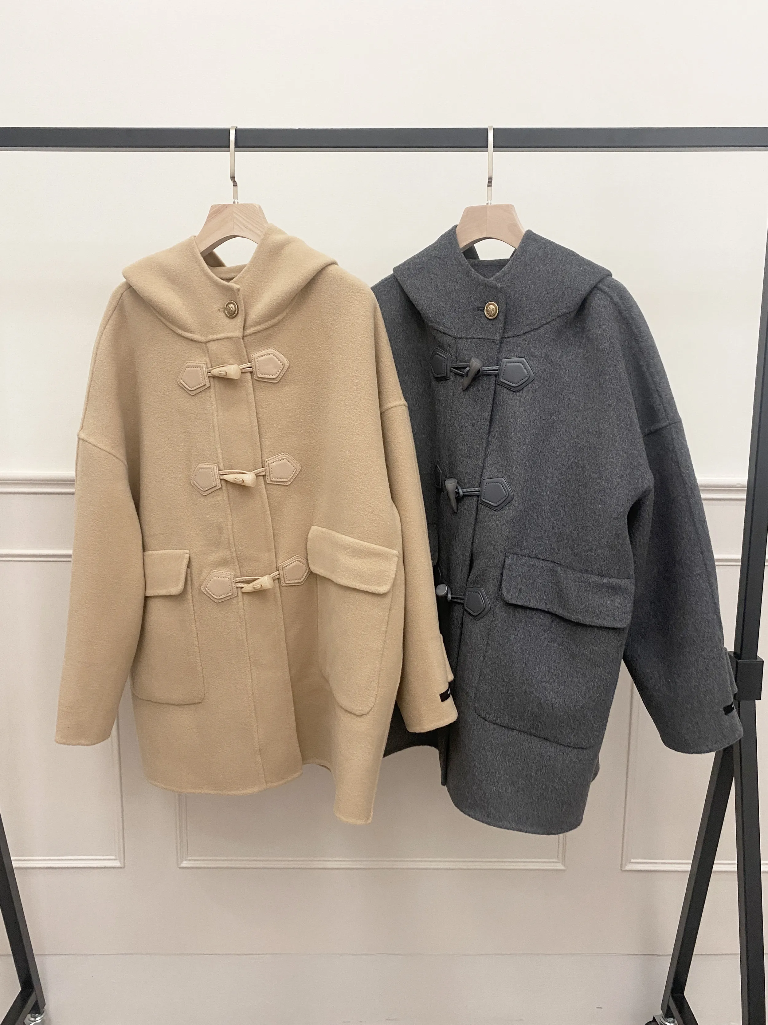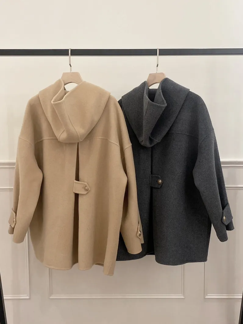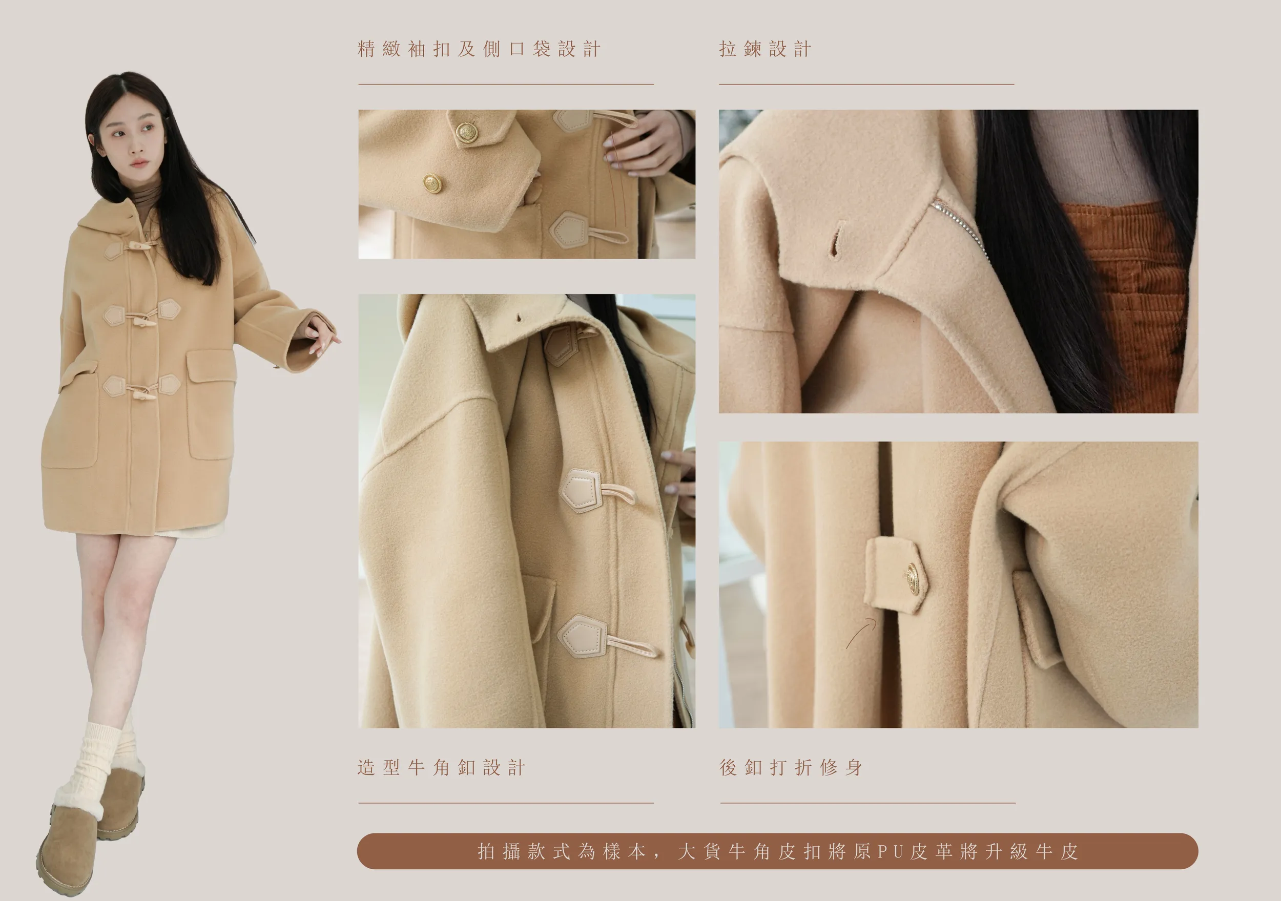 冬季必備大衣外套 100%澳洲手工羊毛這件真的超級輕!~只有0.9公斤牛角釦+拉鍊的設計保暖又增加層次感後打摺設計超級修身,視覺體重直接-5kg!!澳洲手工羊毛超級親膚又柔軟還有大連帽跟金釦設計 滿滿的小巧思!輕親大衣 真的超輕超親!材質:100%澳洲手工羊毛 重量:約0.9Kg*拍攝款式為樣本,大貨牛角皮扣將原PU皮革將升級牛皮 model身型:麻糬媽:身高:160 體重:50 鞋子尺寸:24.5逸歡:身高:168 體重:48 鞋子尺寸:25彭彭:身高165 體重:47 鞋子尺寸:23.5