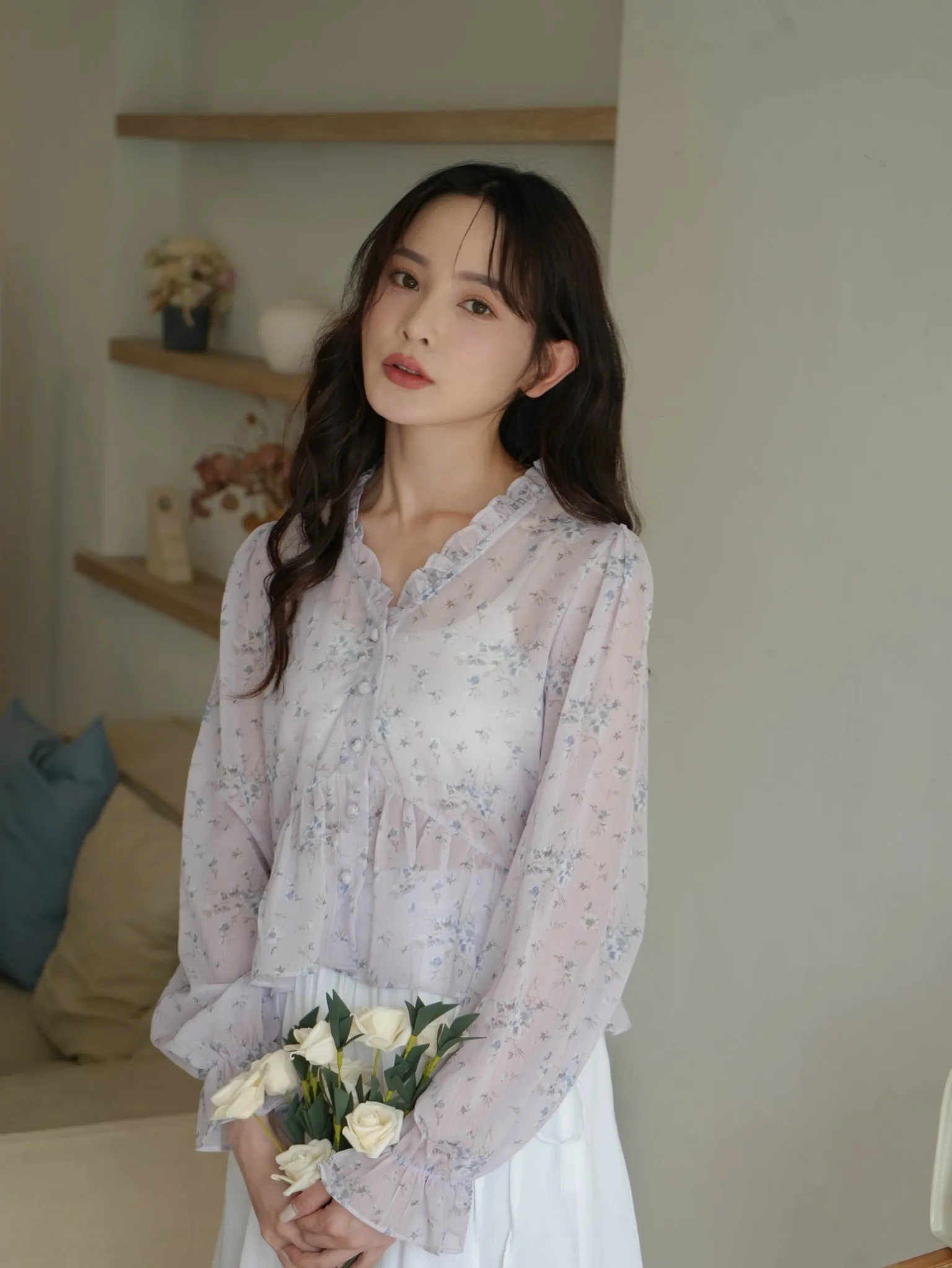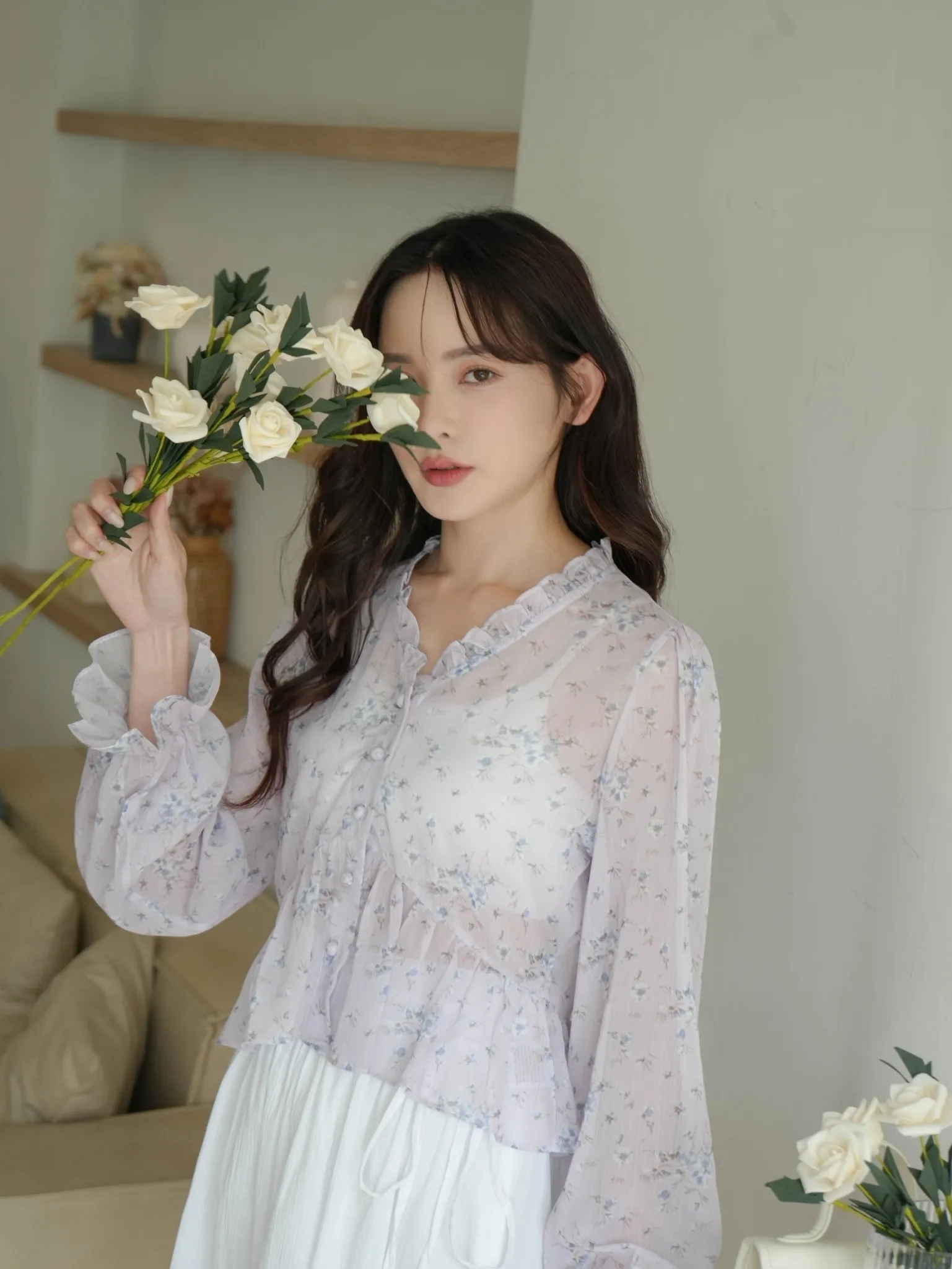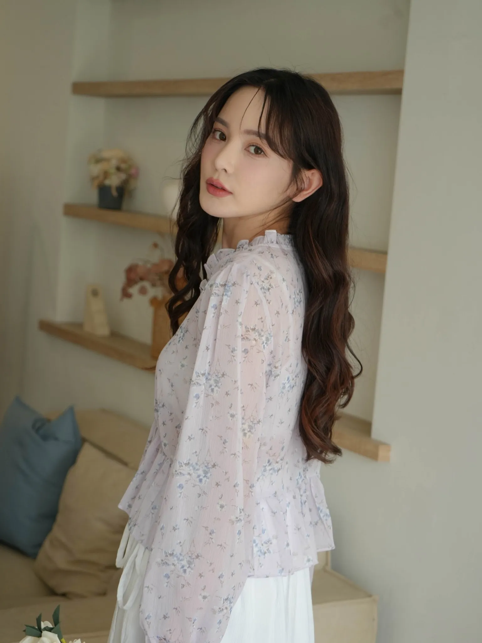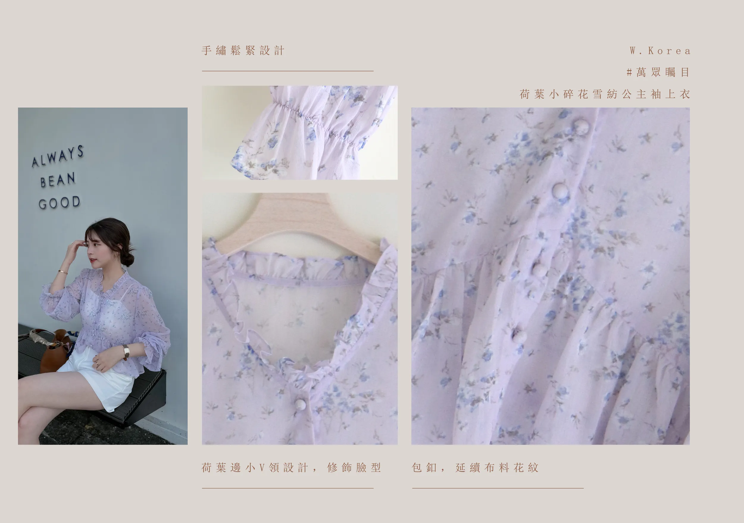 W.Korea #萬眾矚目 荷葉小碎花雪紡公主袖上衣