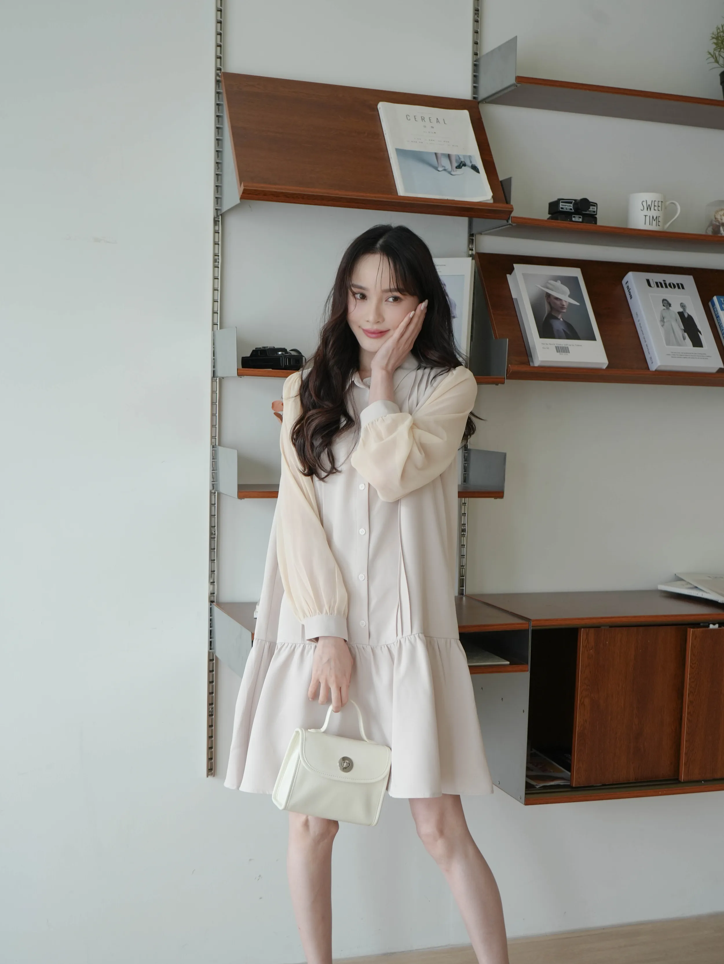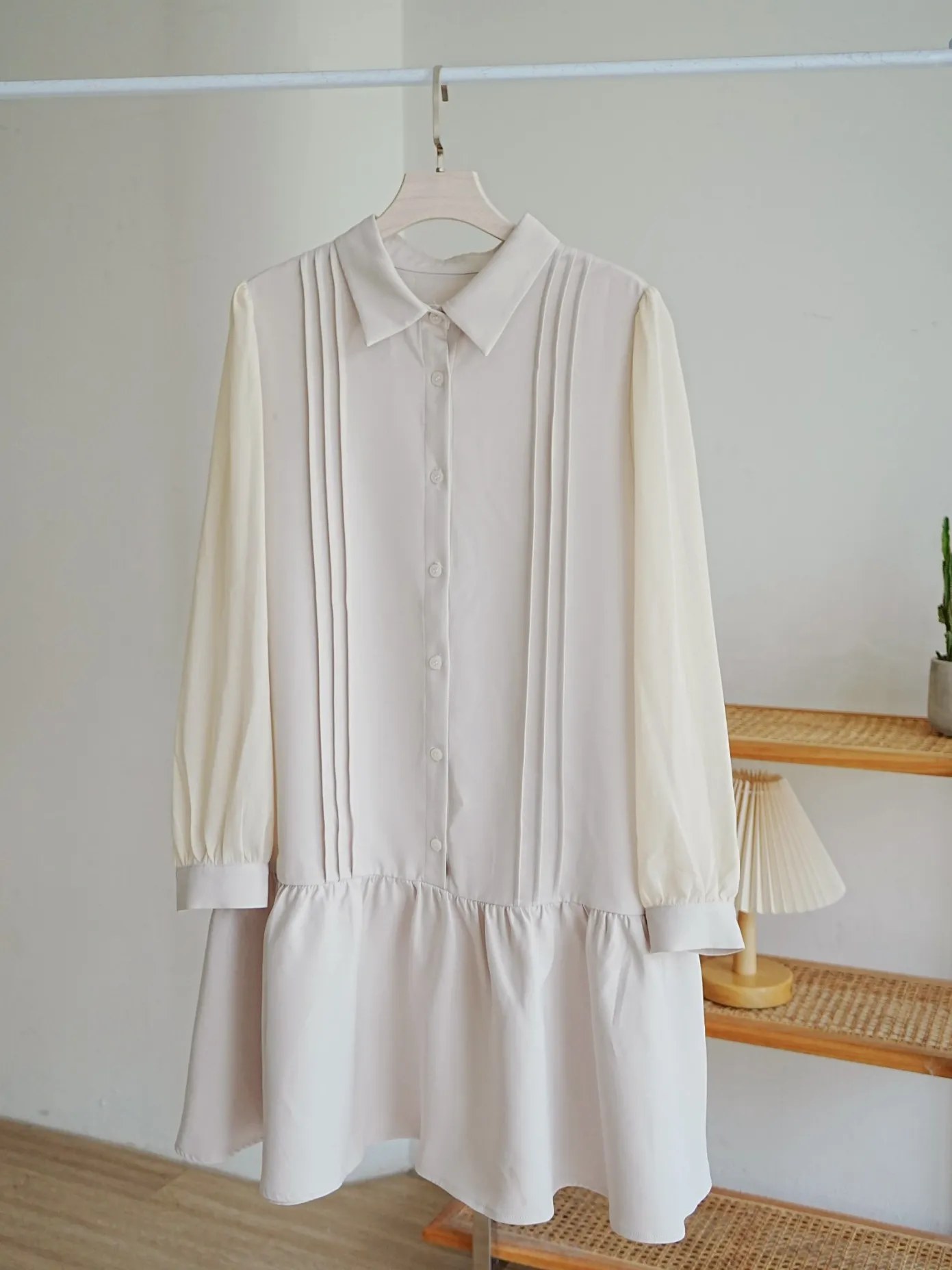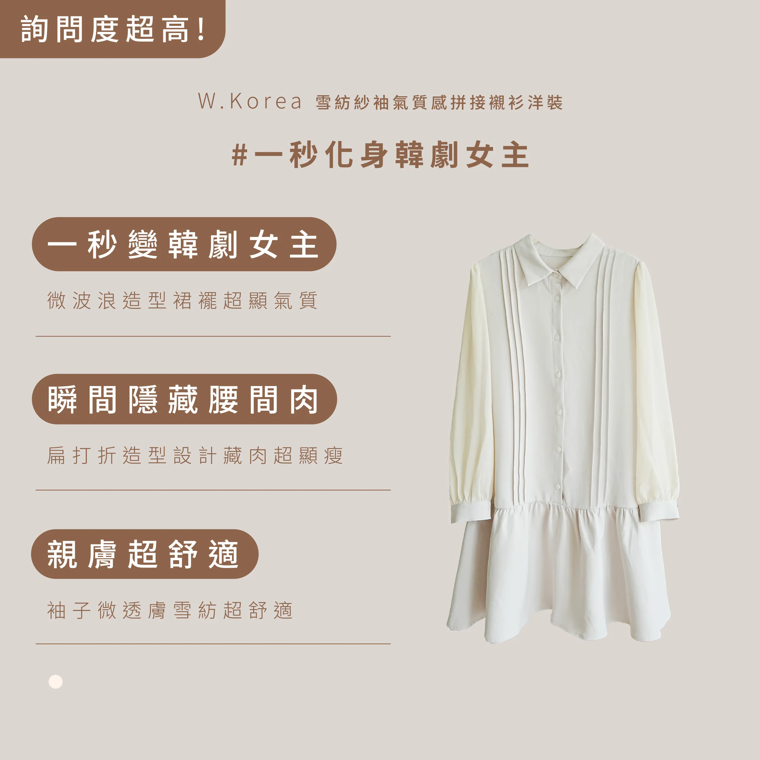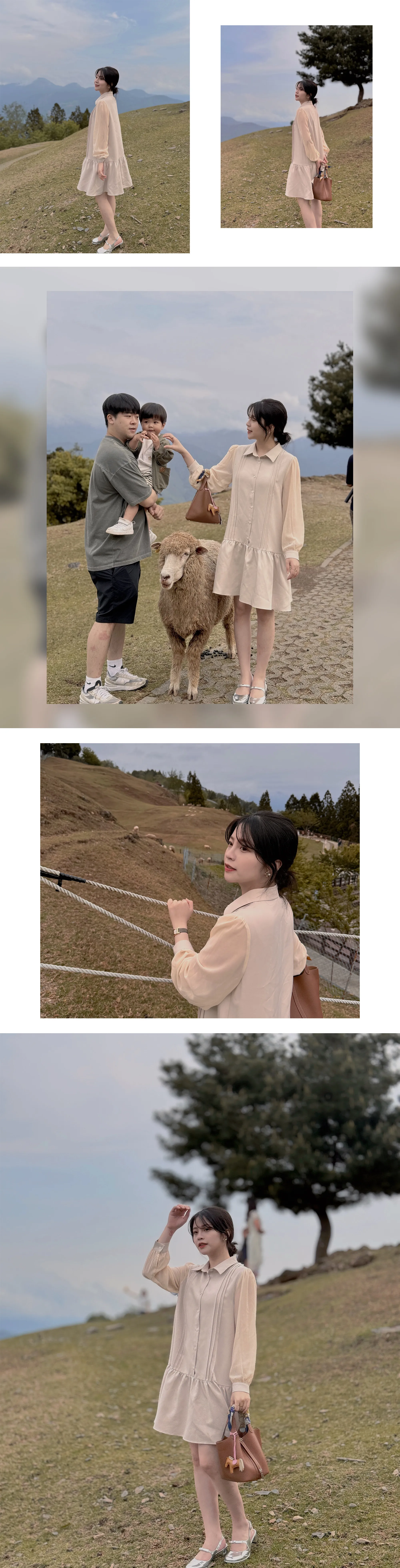 #韓劇女主 雪紡紗袖氣質感拼接襯衫洋裝<榛果杏> -高級雪紡親膚滑順手袖為雪紡透膚長袖設計 透氣不悶熱又防曬 立體扁打折造型設計 修飾身形微波浪造型裙襬 顯瘦優雅感材質:高級雪紡 身形指南 身高 體重 鞋碼 Model 158 41 24 麻糬媽 160 50 24.5 逸歡 168 48 25 彭彭 165 47 23.5