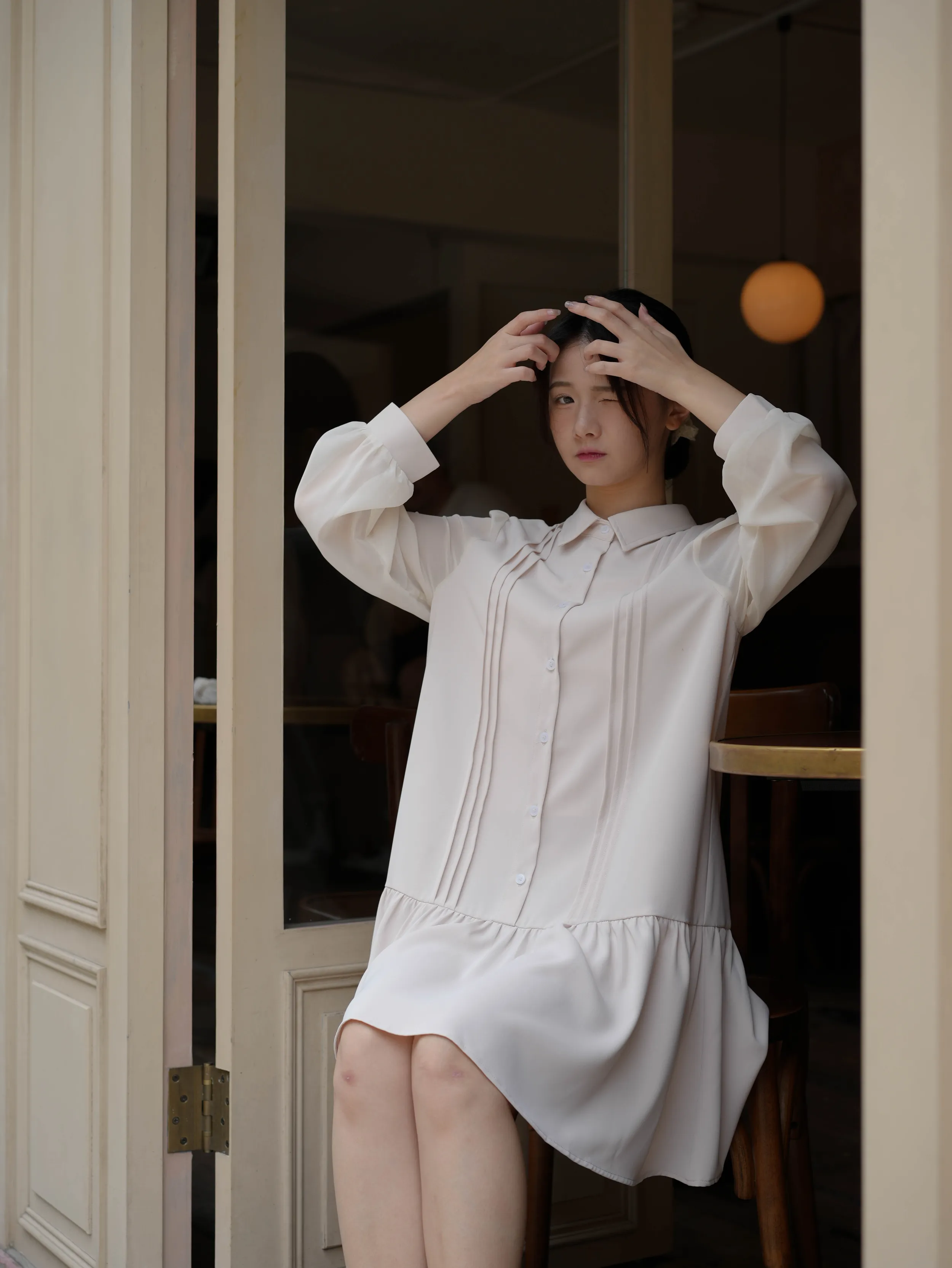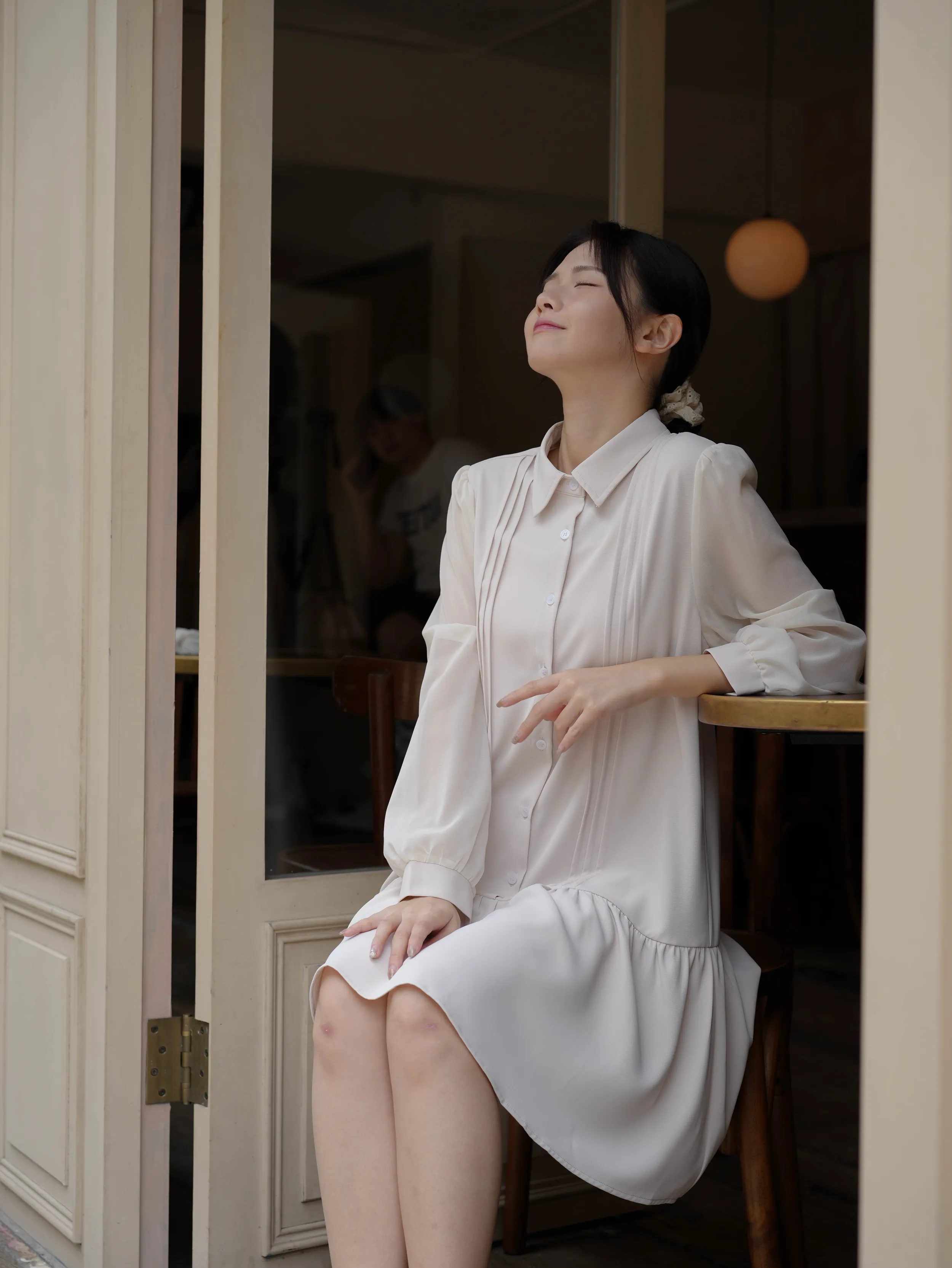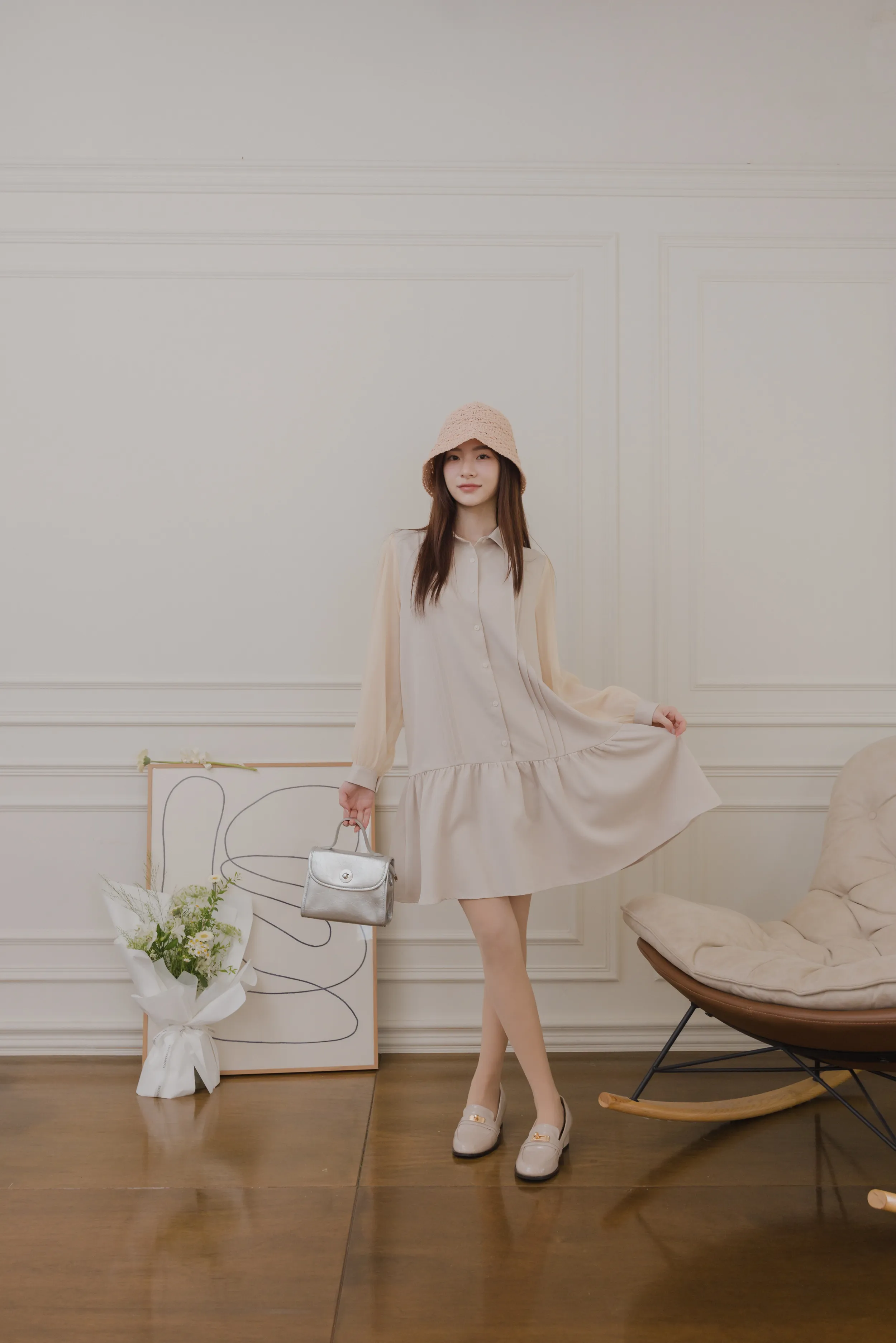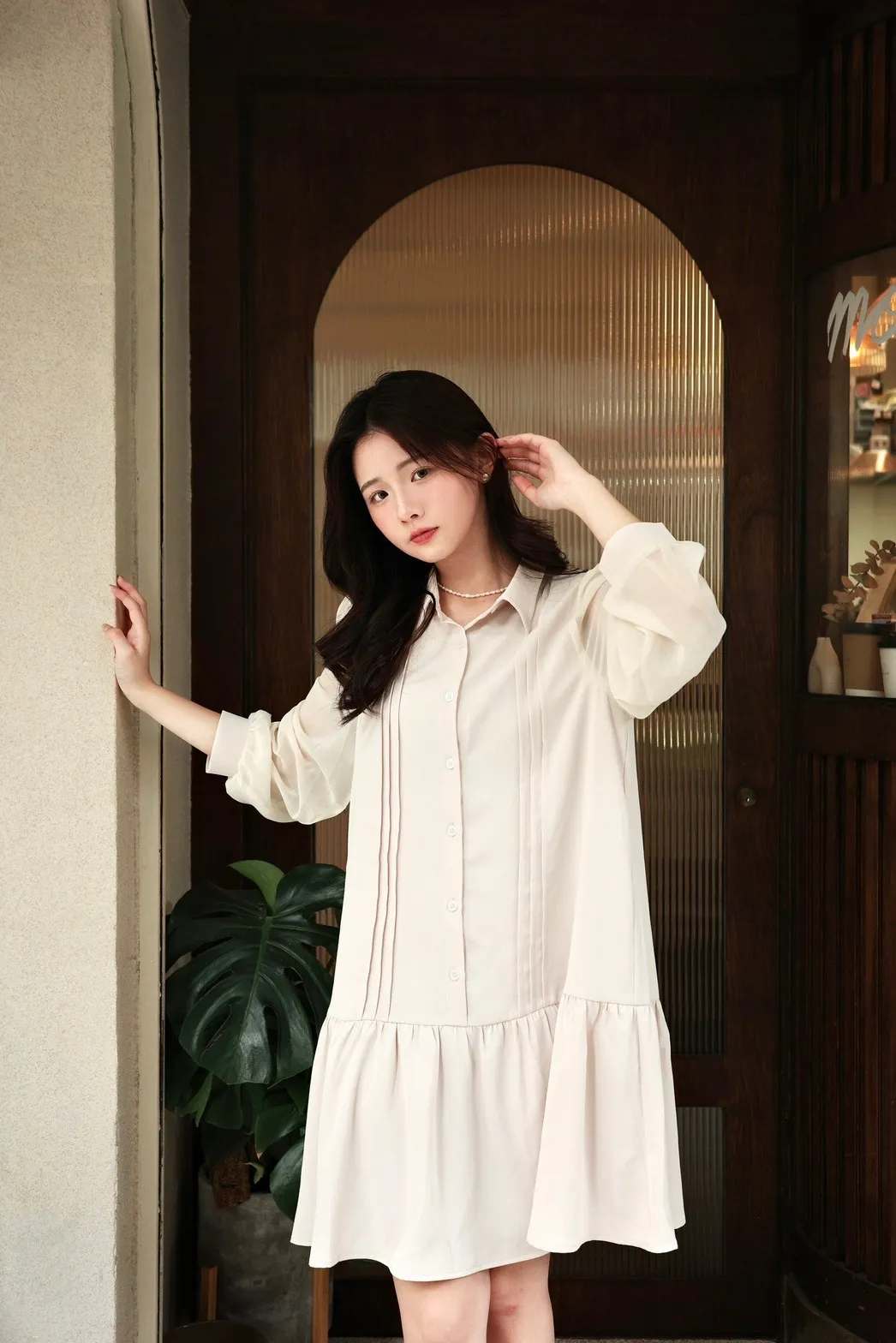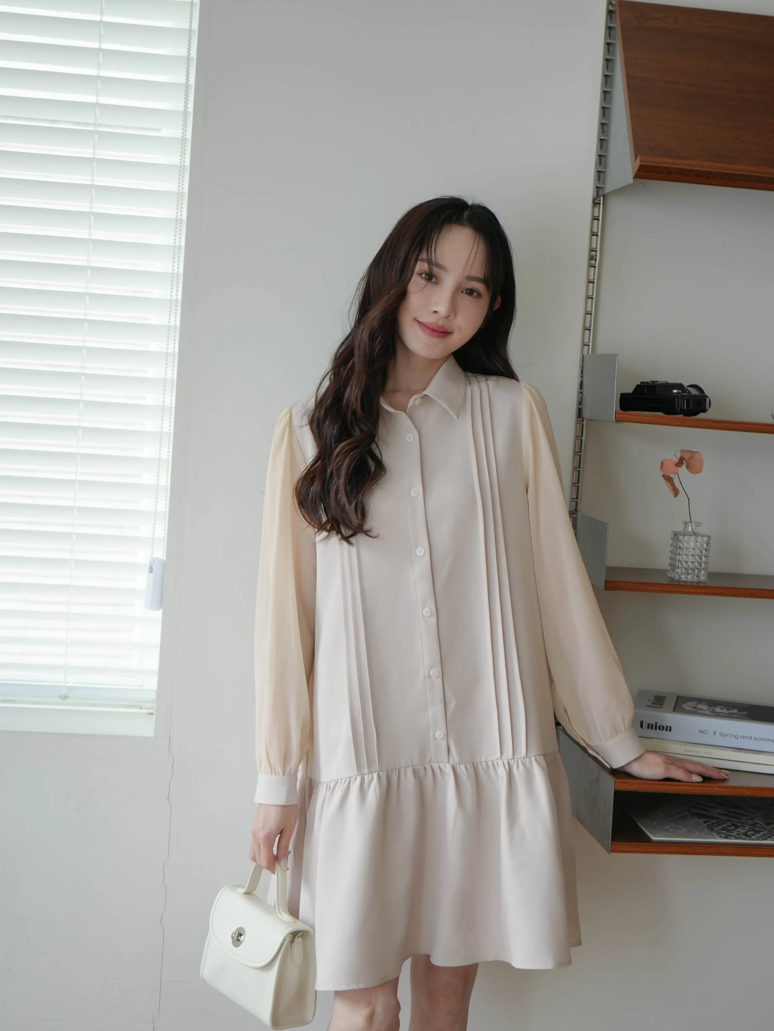 #韓劇女主 雪紡紗袖氣質感拼接襯衫洋裝<榛果杏> -高級雪紡親膚滑順手袖為雪紡透膚長袖設計 透氣不悶熱又防曬 立體扁打折造型設計 修飾身形微波浪造型裙襬 顯瘦優雅感材質:高級雪紡 身形指南 身高 體重 鞋碼 Model 158 41 24 麻糬媽 160 50 24.5 逸歡 168 48 25 彭彭 165 47 23.5