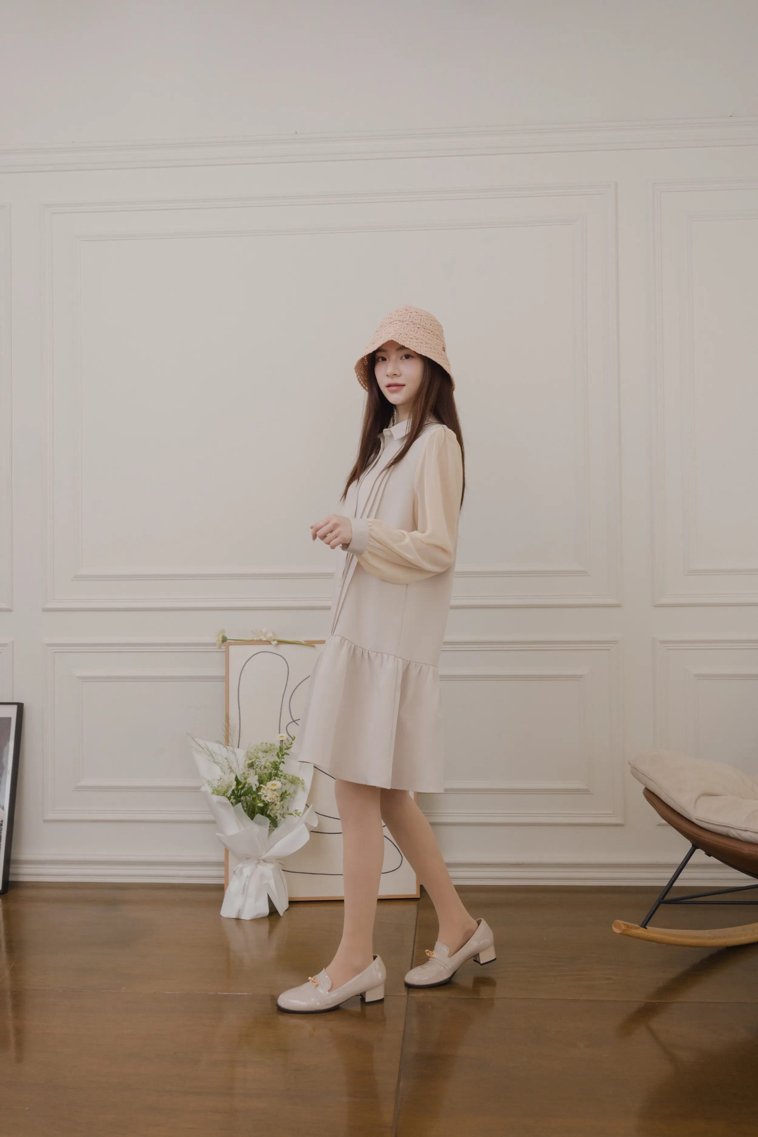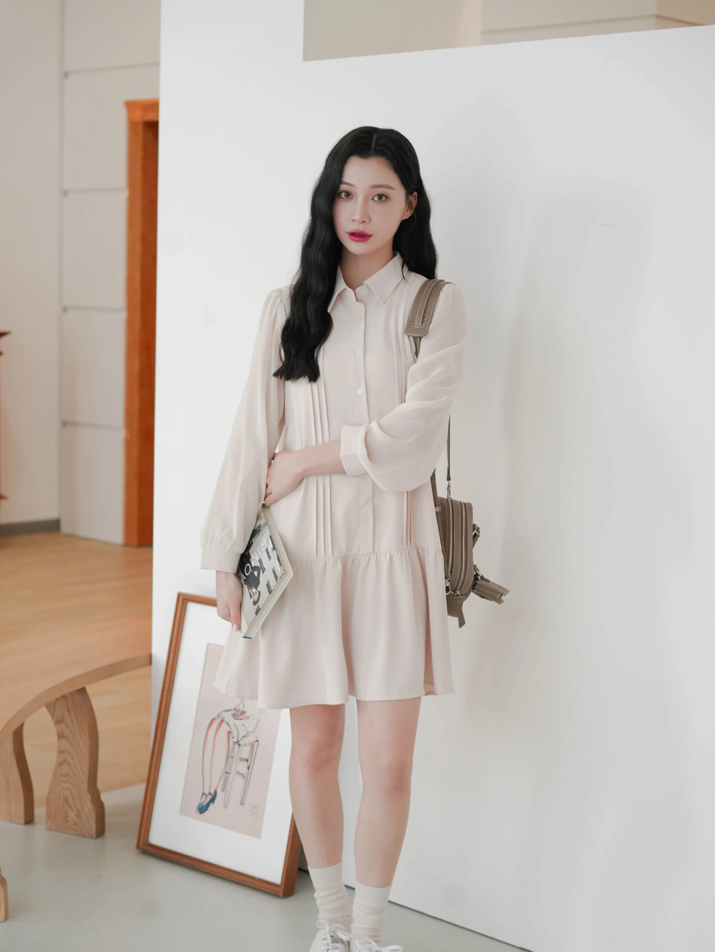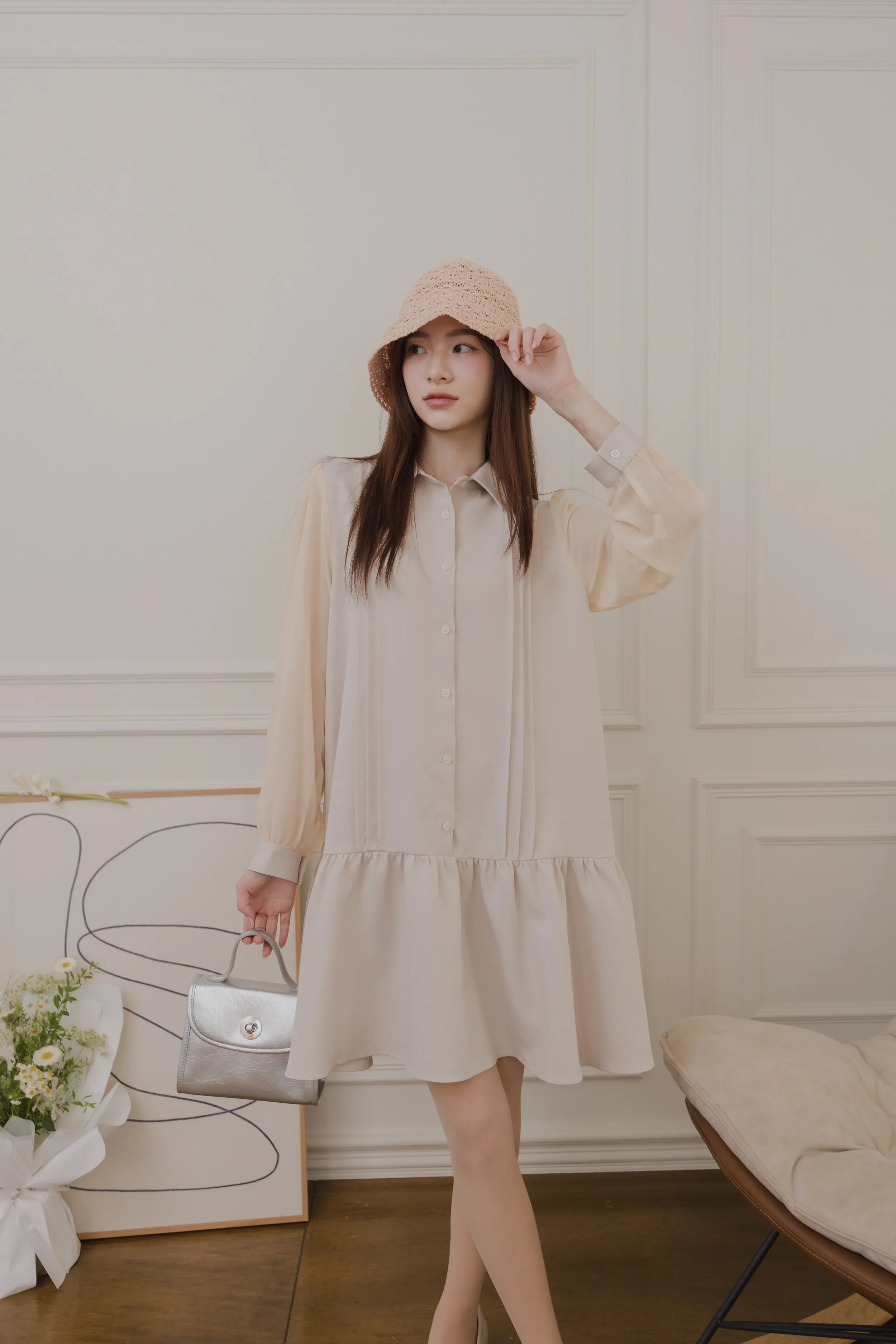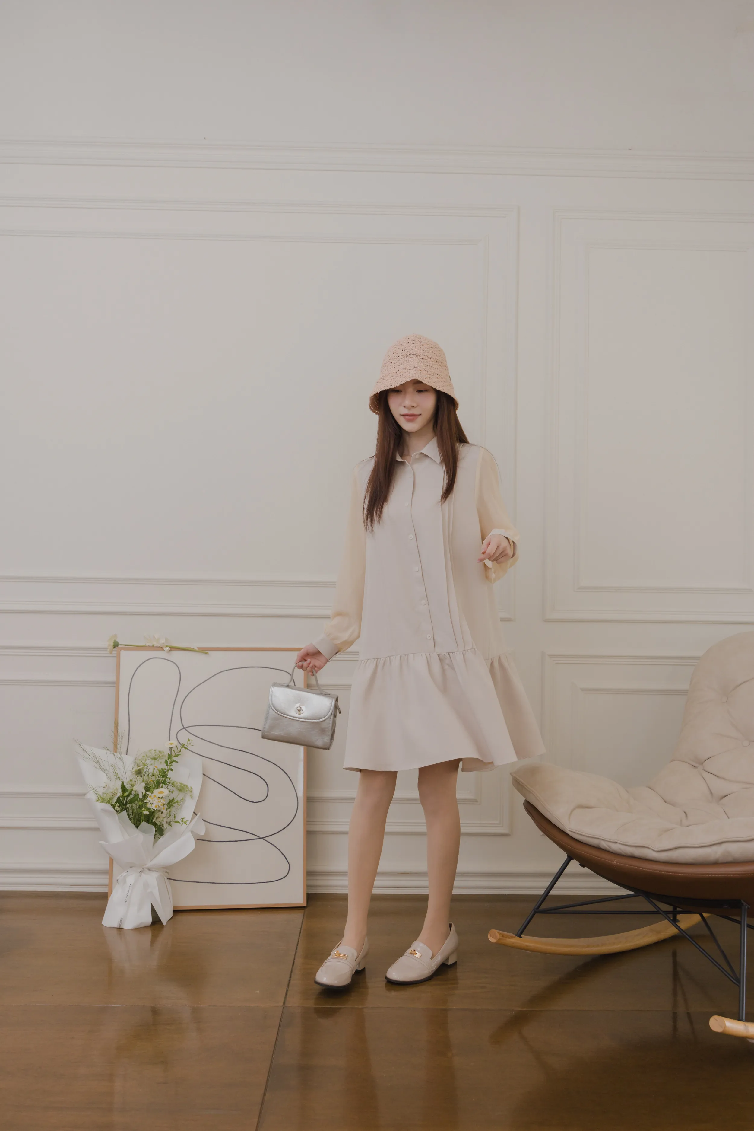 #韓劇女主 雪紡紗袖氣質感拼接襯衫洋裝<榛果杏> -高級雪紡親膚滑順手袖為雪紡透膚長袖設計 透氣不悶熱又防曬 立體扁打折造型設計 修飾身形微波浪造型裙襬 顯瘦優雅感材質:高級雪紡 身形指南 身高 體重 鞋碼 Model 158 41 24 麻糬媽 160 50 24.5 逸歡 168 48 25 彭彭 165 47 23.5