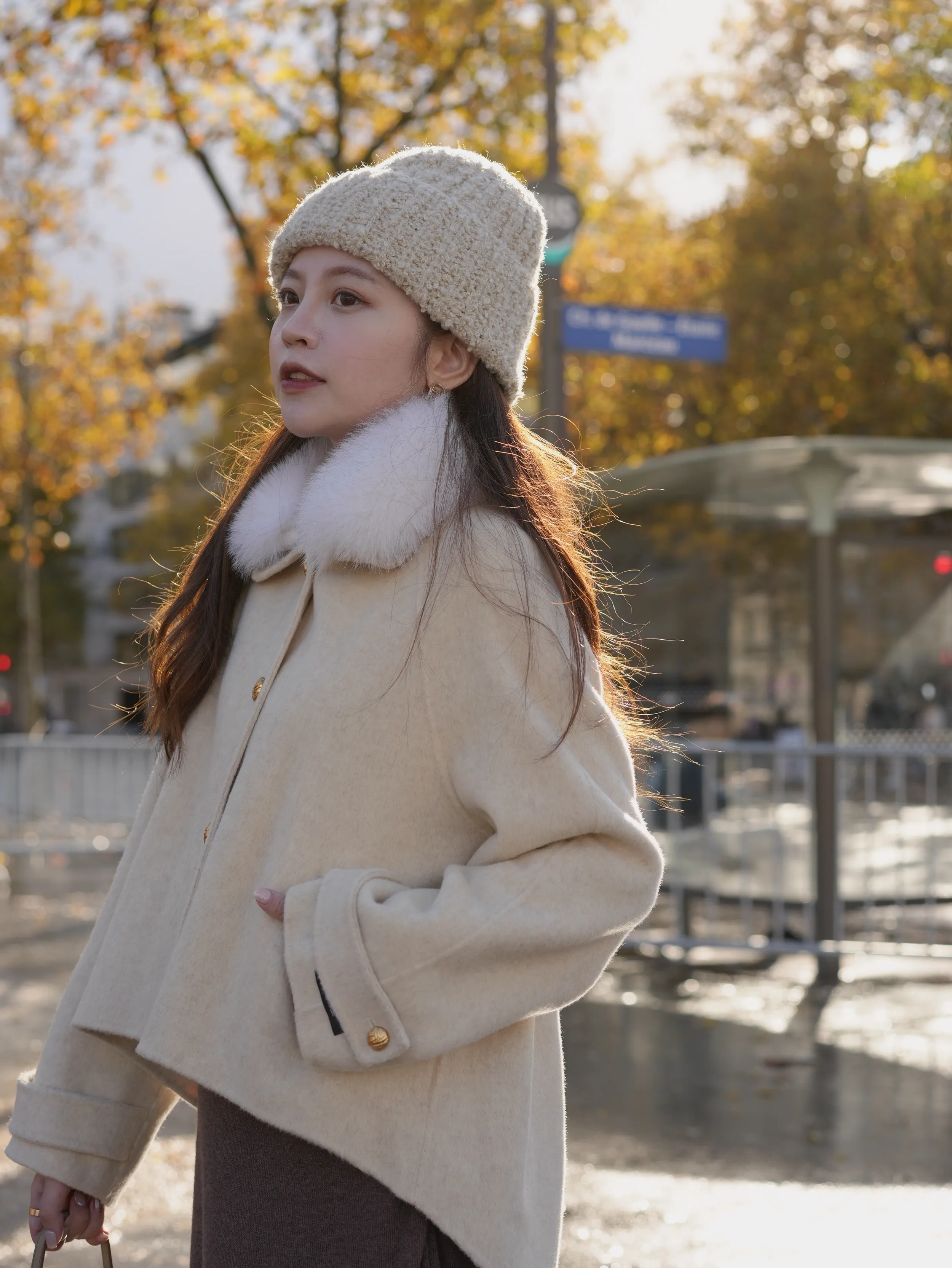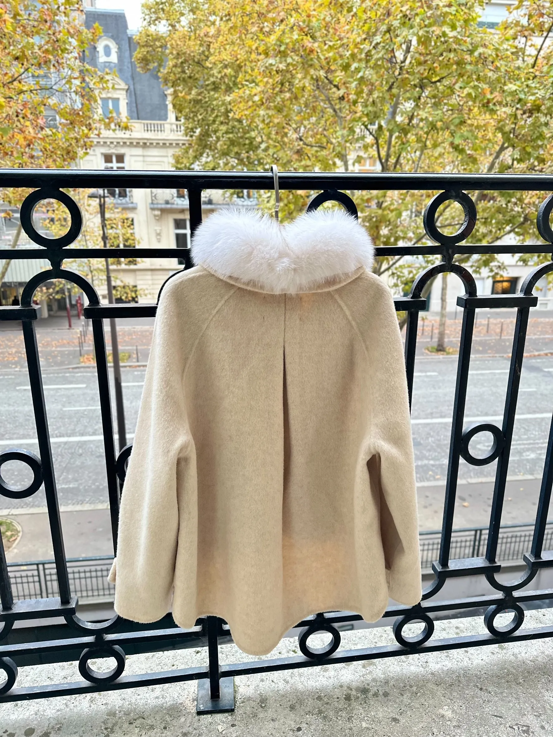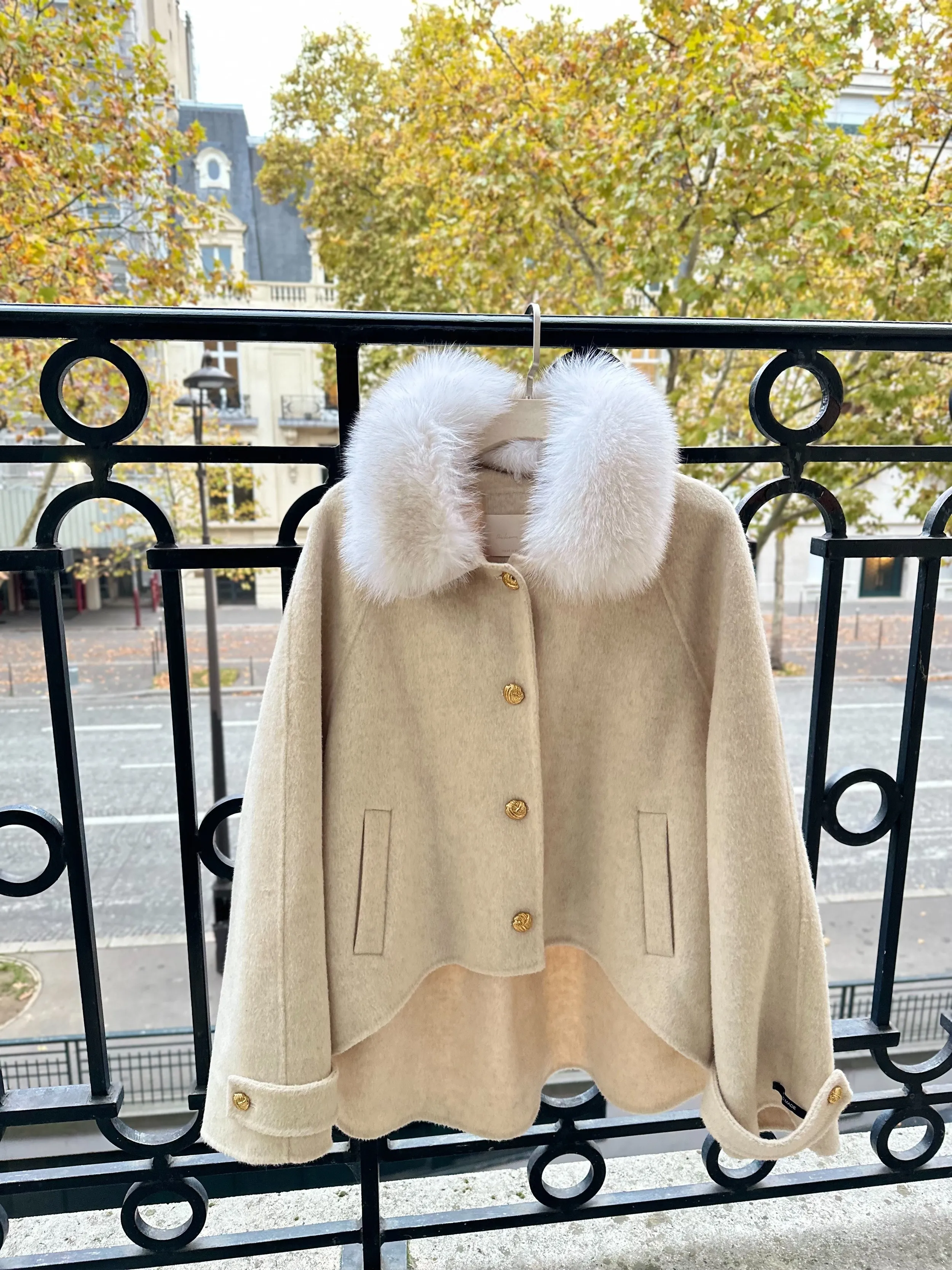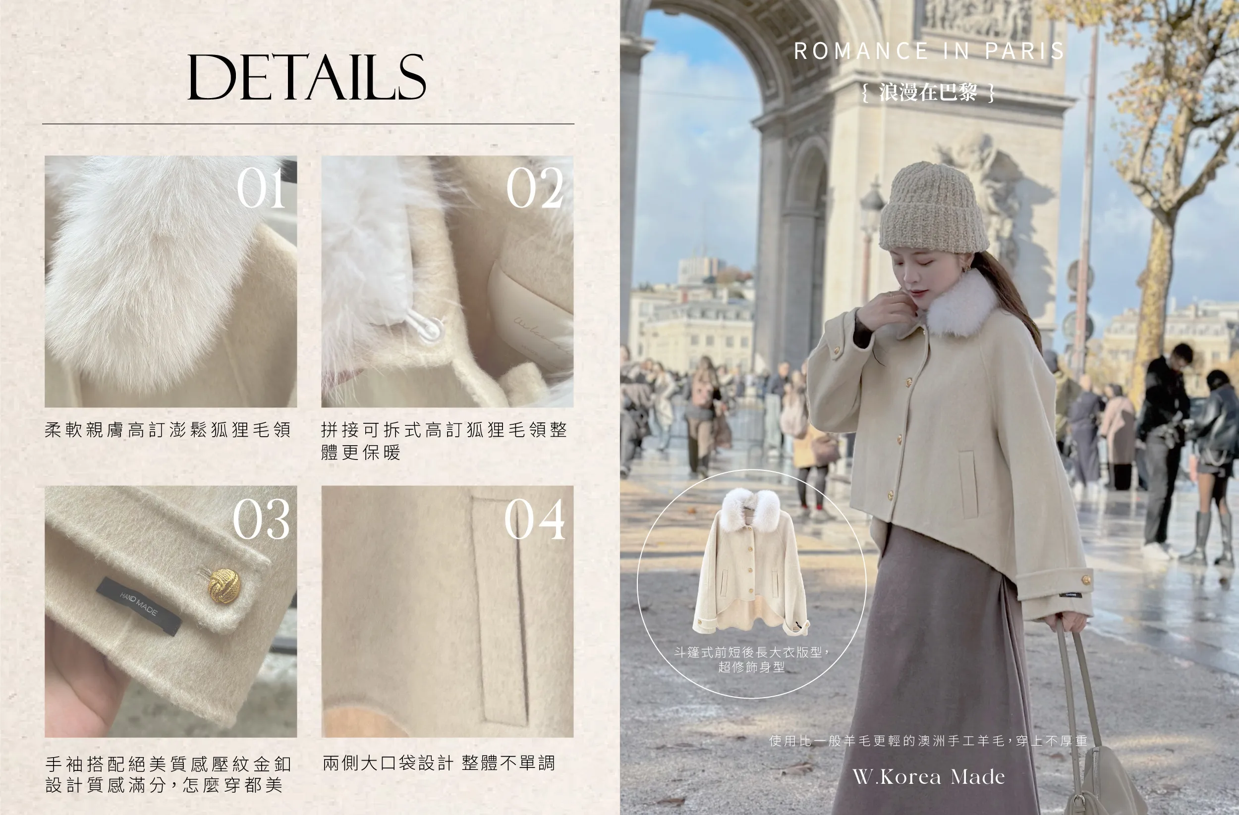 W.Korea #浪漫在巴黎 100%澳洲手工羊毛拼接高訂狐狸毛領斗篷式金釦大衣
