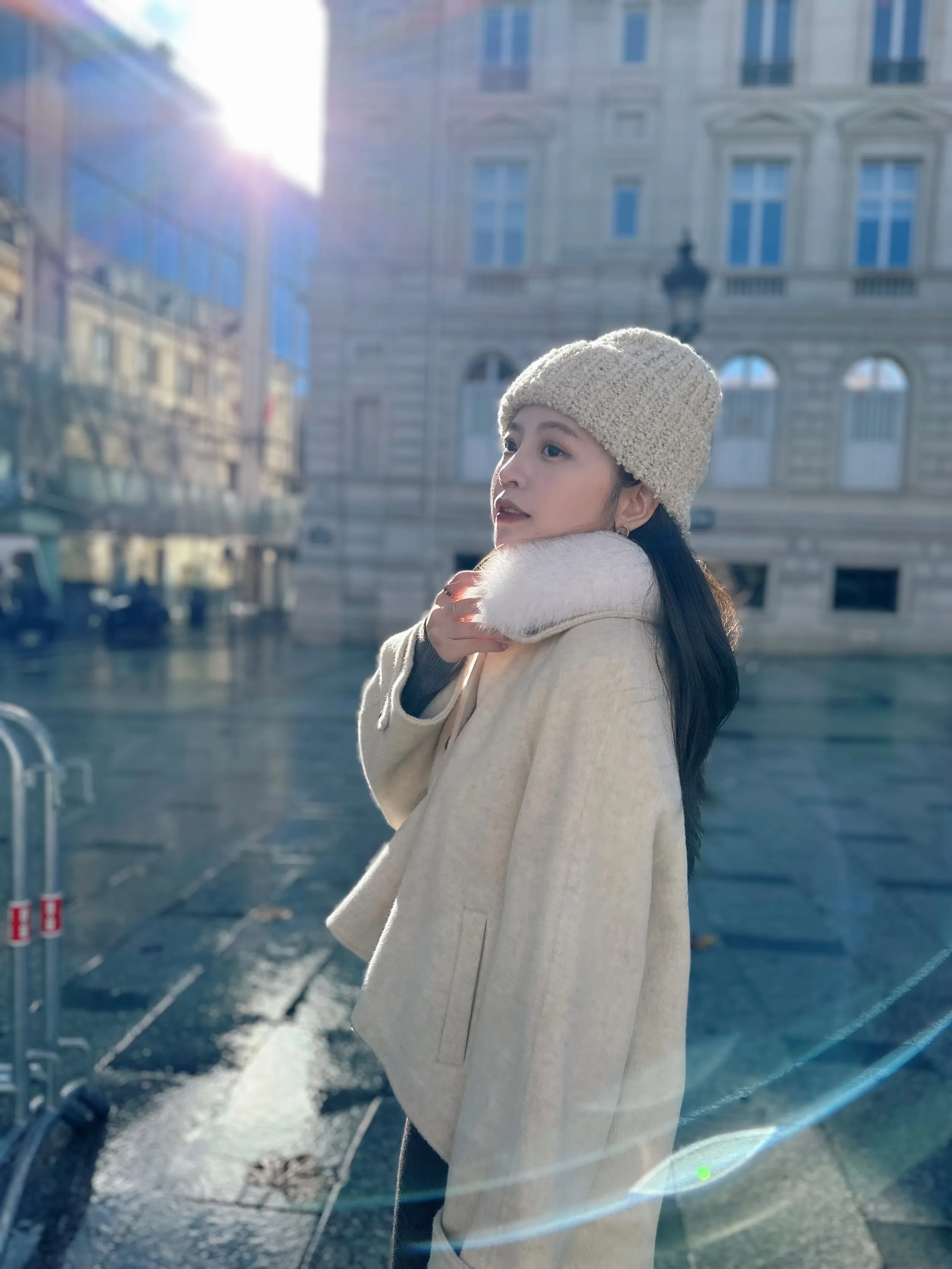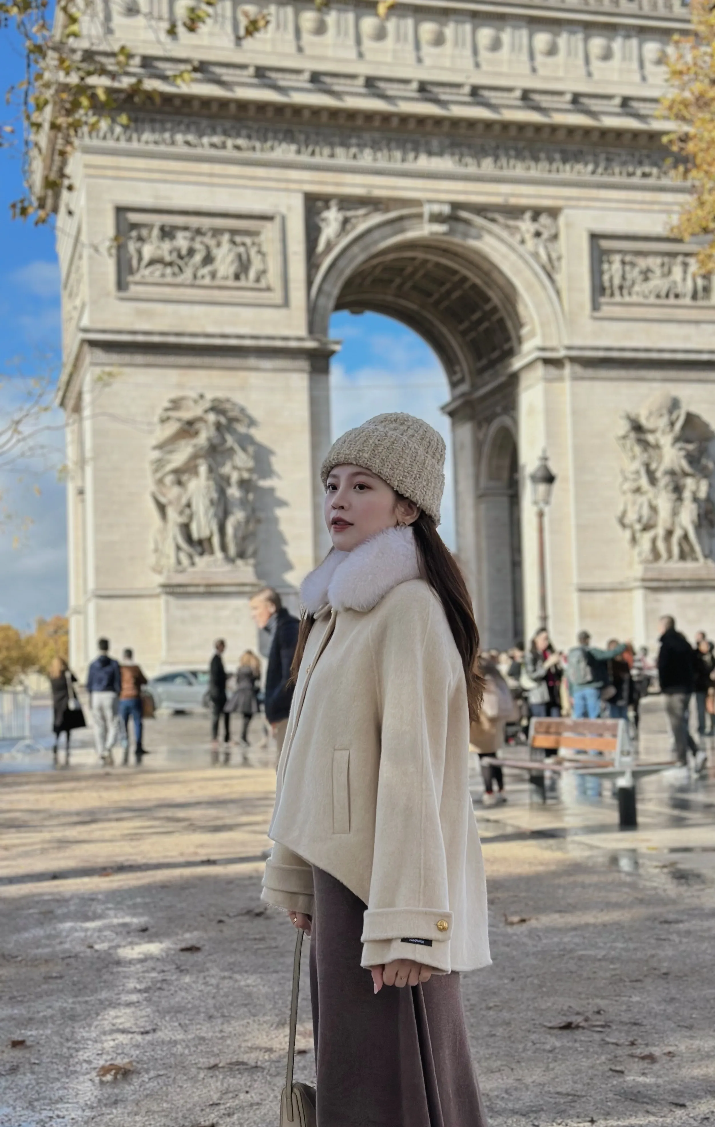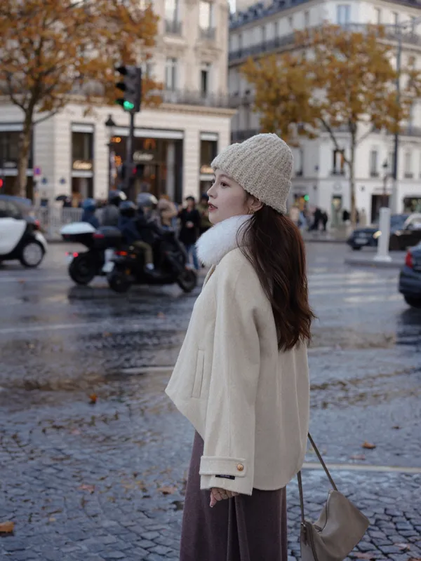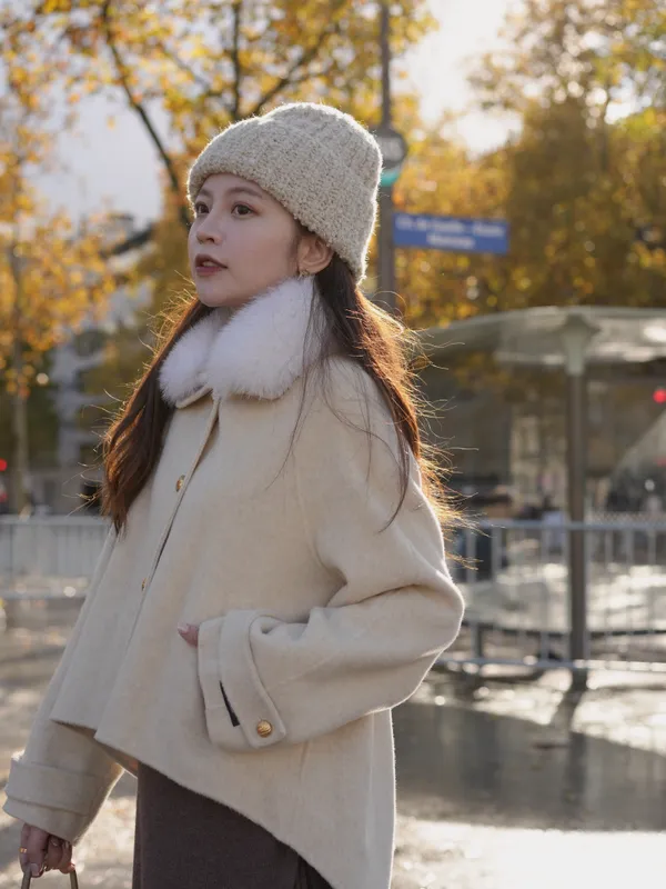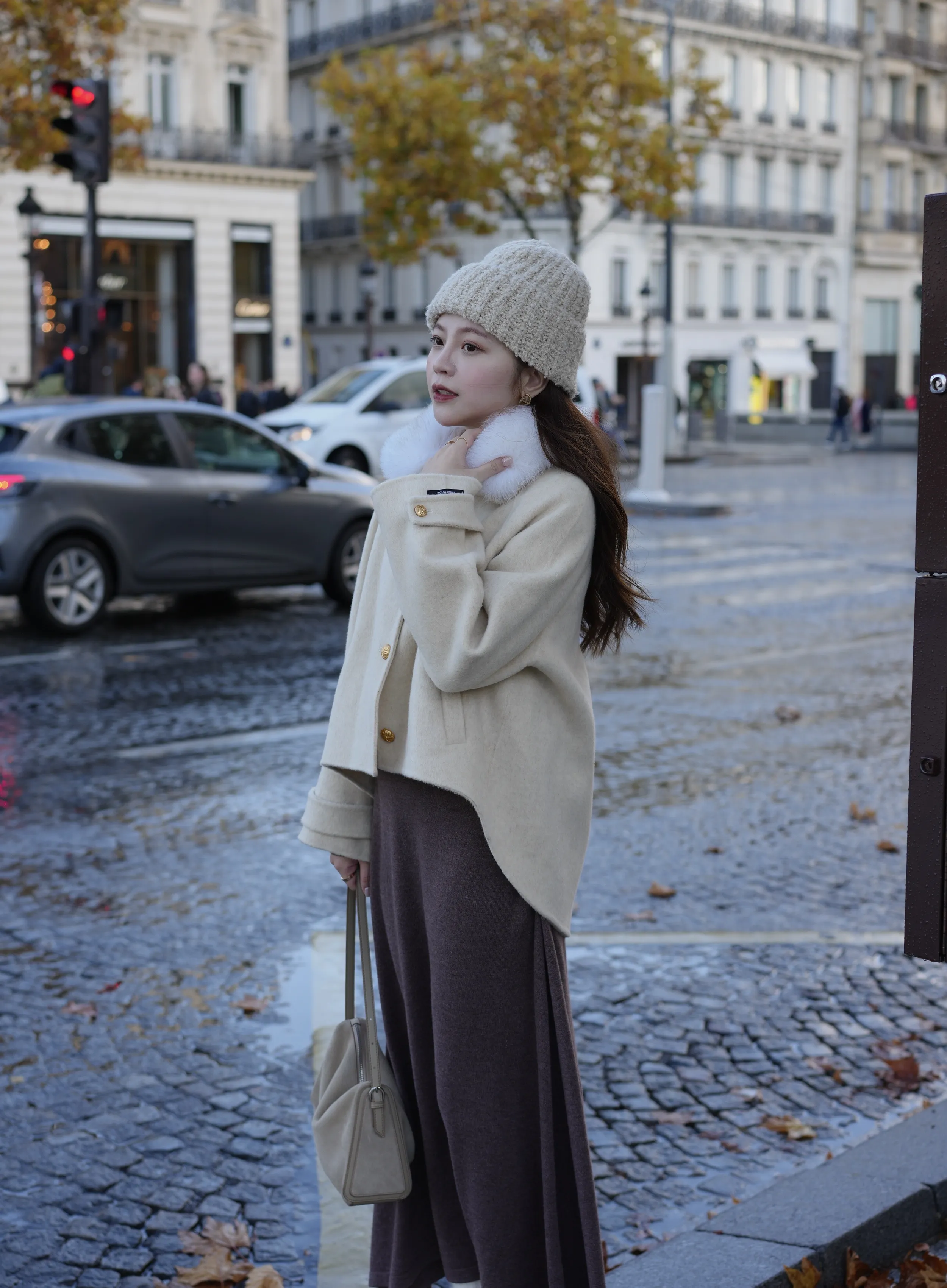 W.Korea #浪漫在巴黎 100%澳洲手工羊毛拼接高訂狐狸毛領斗篷式金釦大衣