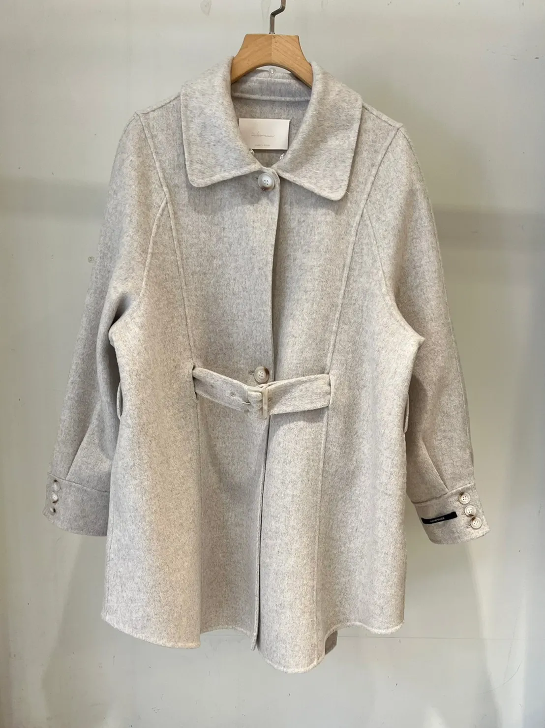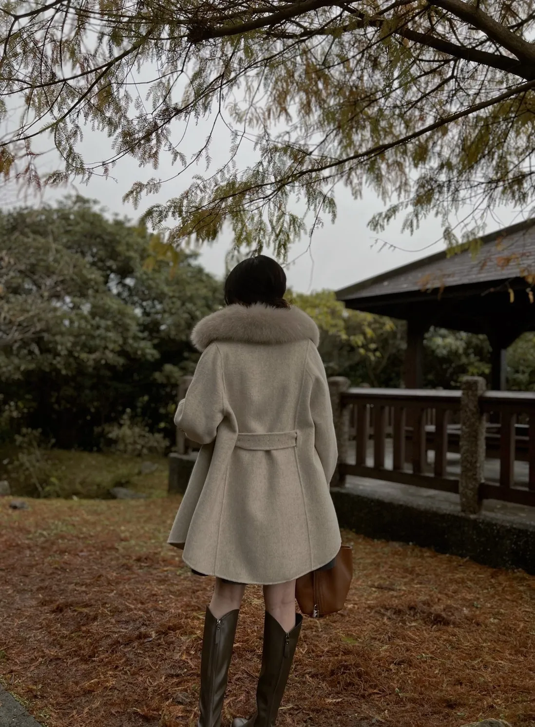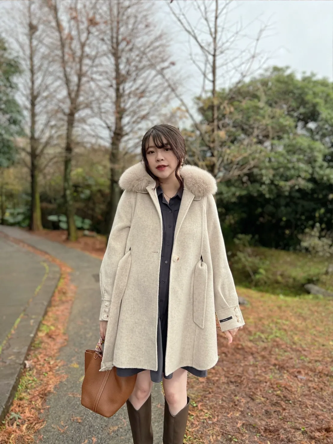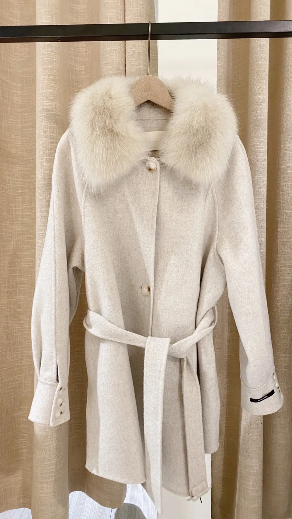W.Korea 典雅千金隱藏式綁帶毛領100%手工羊毛斗篷感大衣(毛領可拆)
