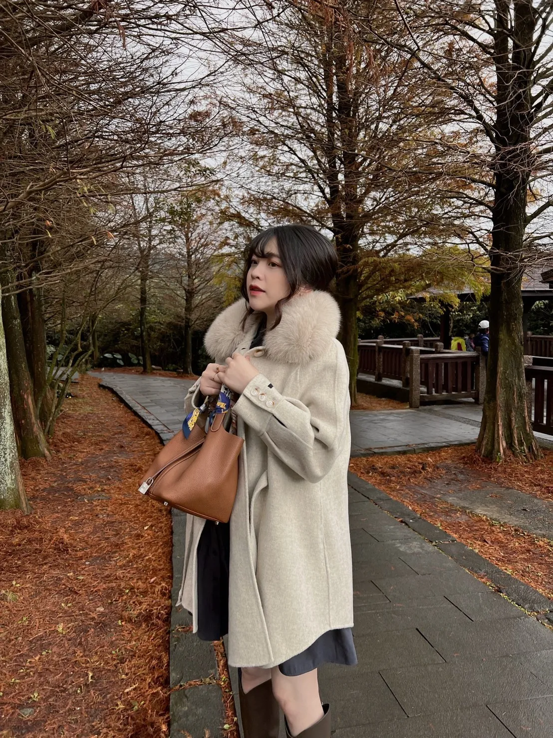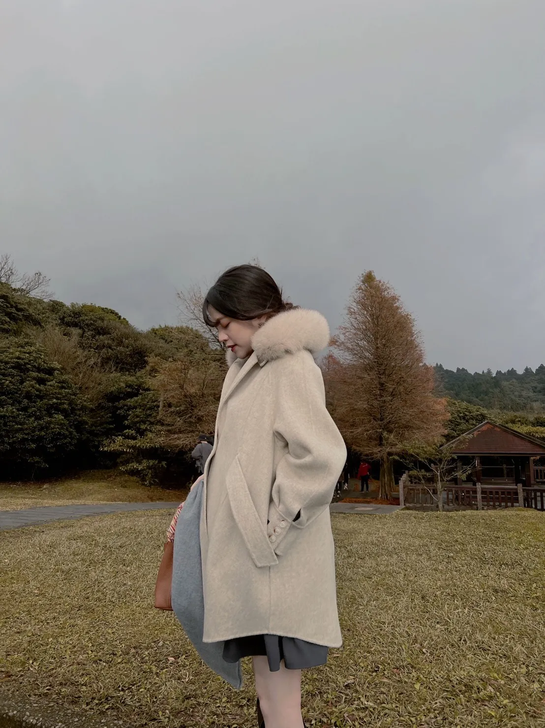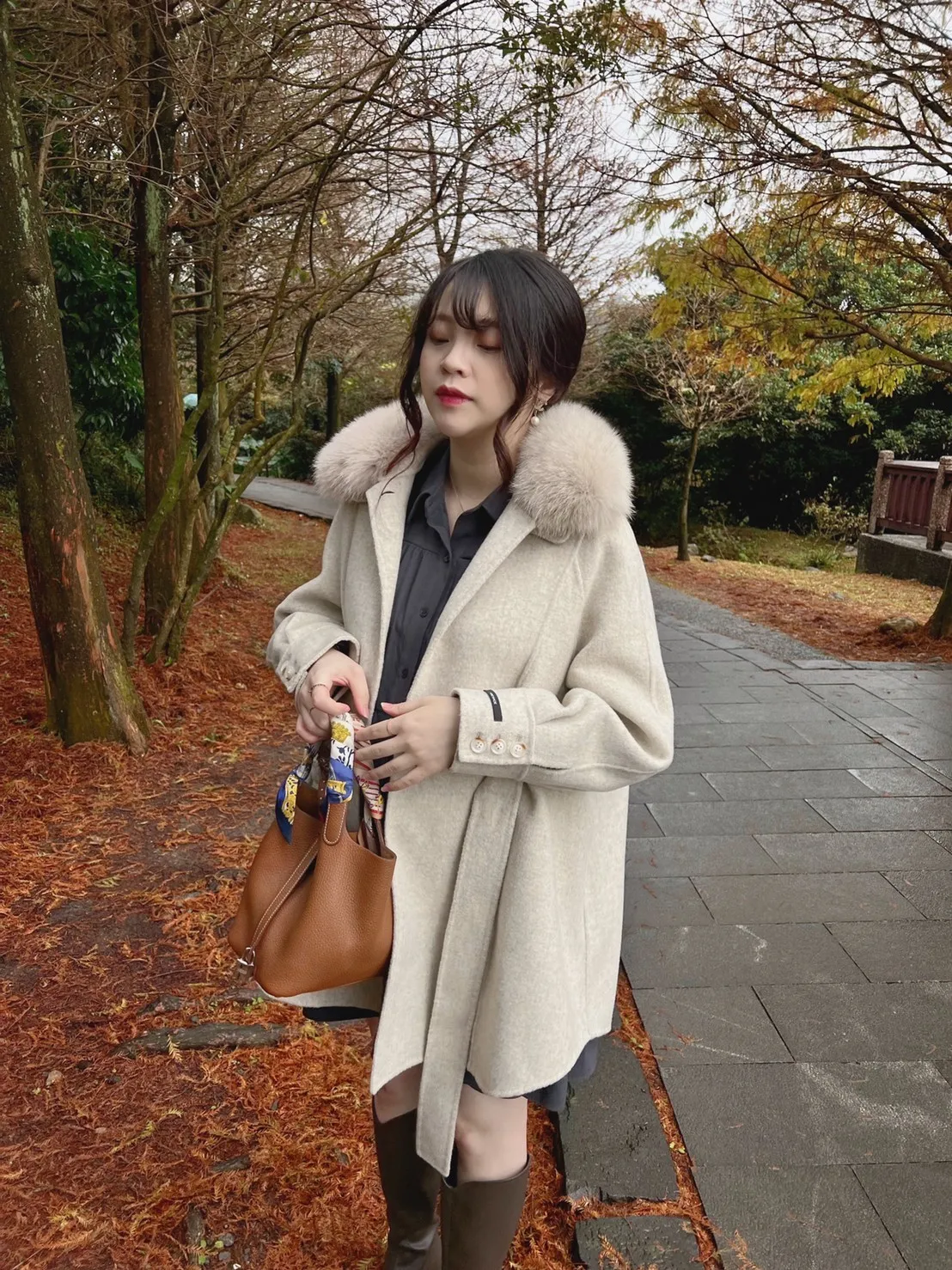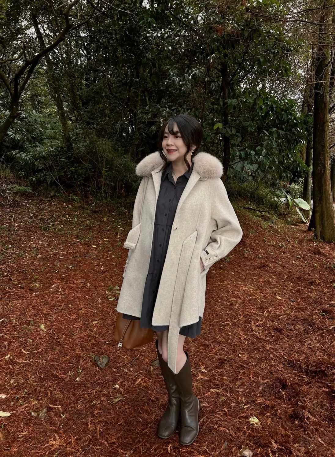 W.Korea 典雅千金隱藏式綁帶毛領100%手工羊毛斗篷感大衣(毛領可拆)