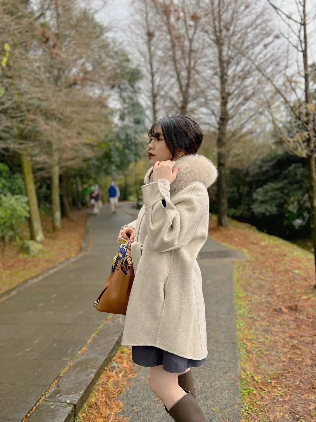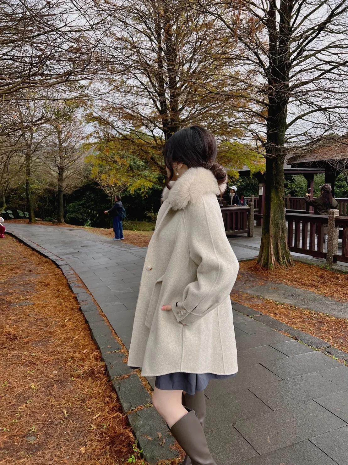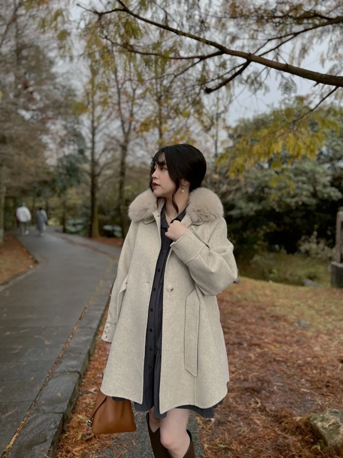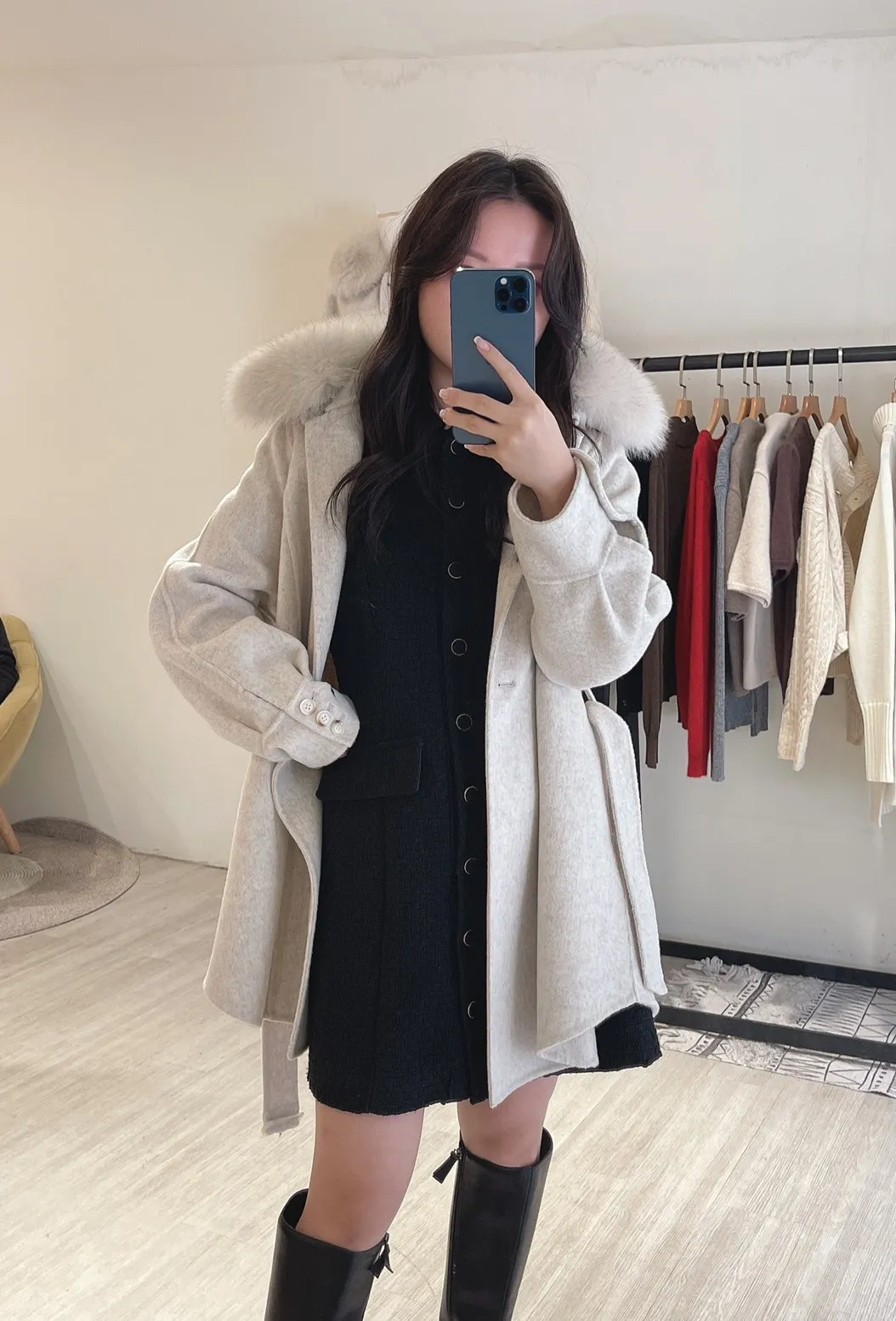 W.Korea 典雅千金隱藏式綁帶毛領100%手工羊毛斗篷感大衣(毛領可拆)