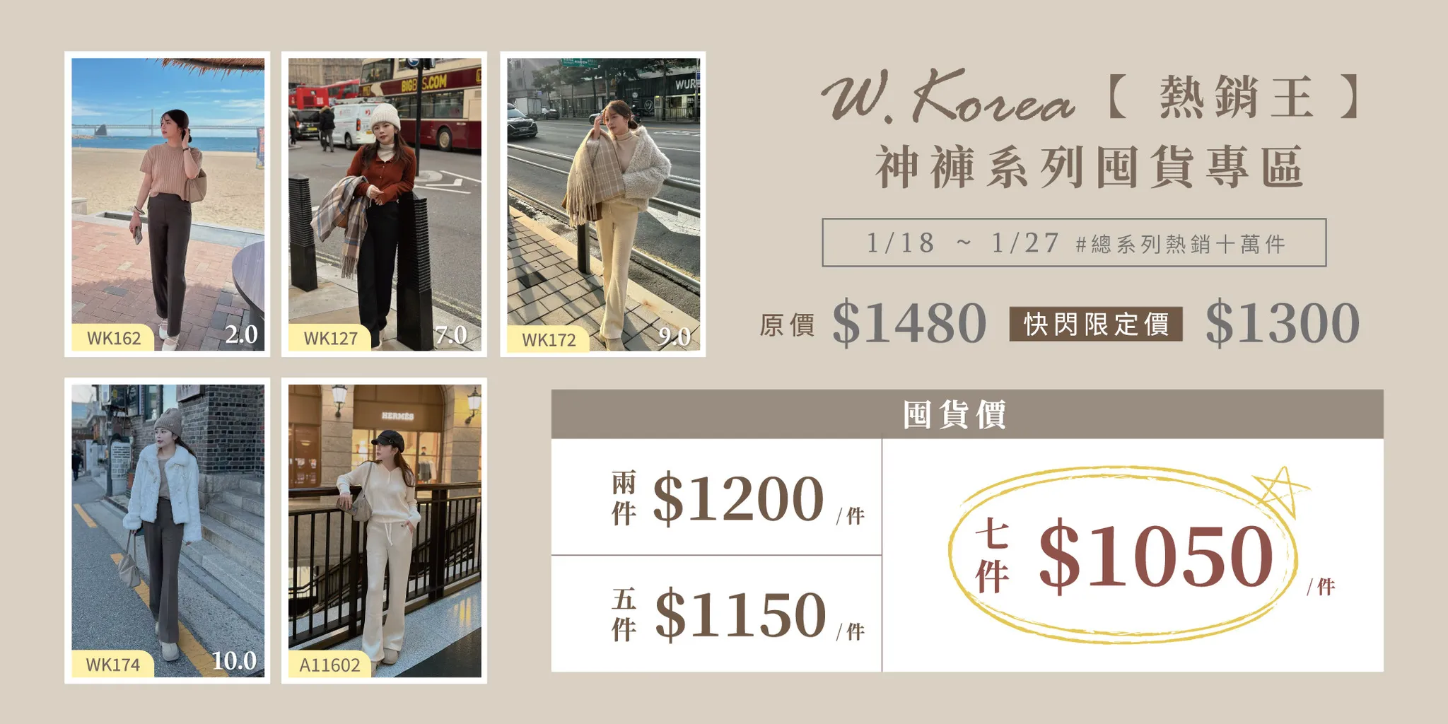 !!快閃期間限定!! W.KOREA熱銷王 神褲系列囤貨專區 #總系列熱銷十萬件 原價$1480 快閃限定價$1300 囤貨價2件以上單件$1200 5件單件$11507件以上單件$1050!!1050!!1050!!